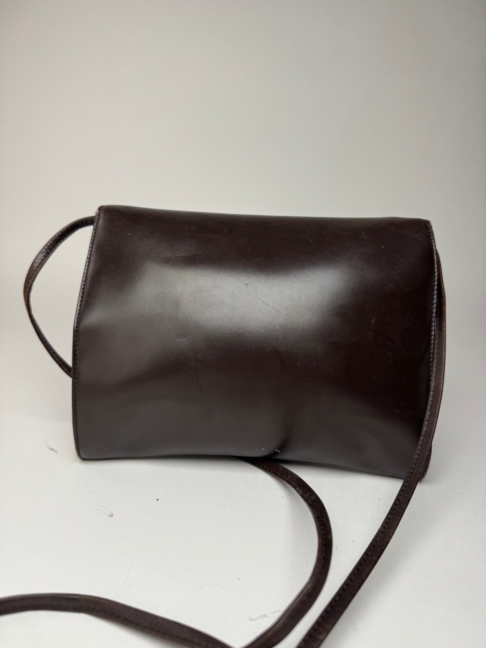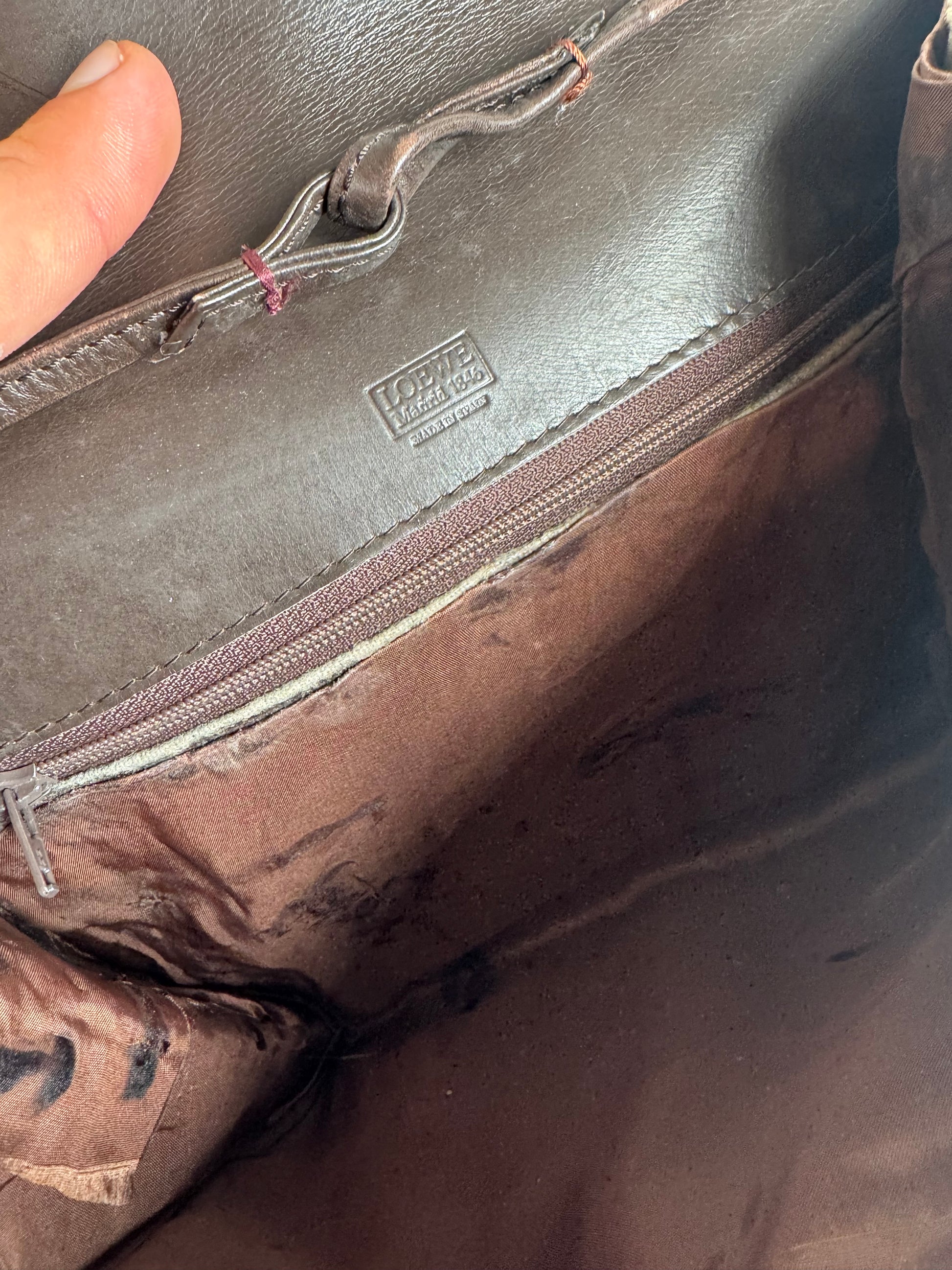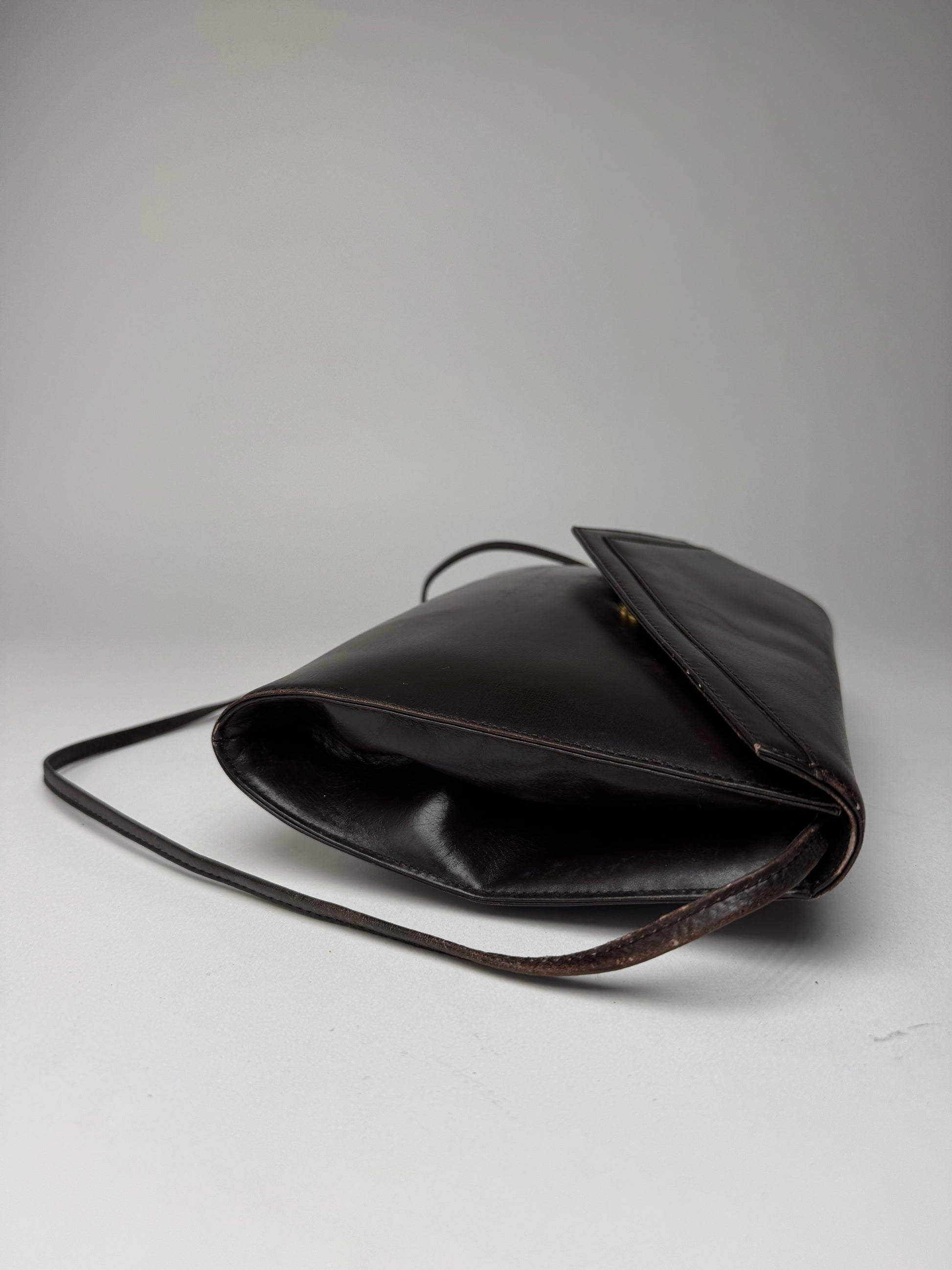 LOEWE vintage shoulder bag. This elegant handbag is finely crafted of dark brown leather with a magnetic closure and gold-tone steel hardware. The interior is lined in brown canvas.