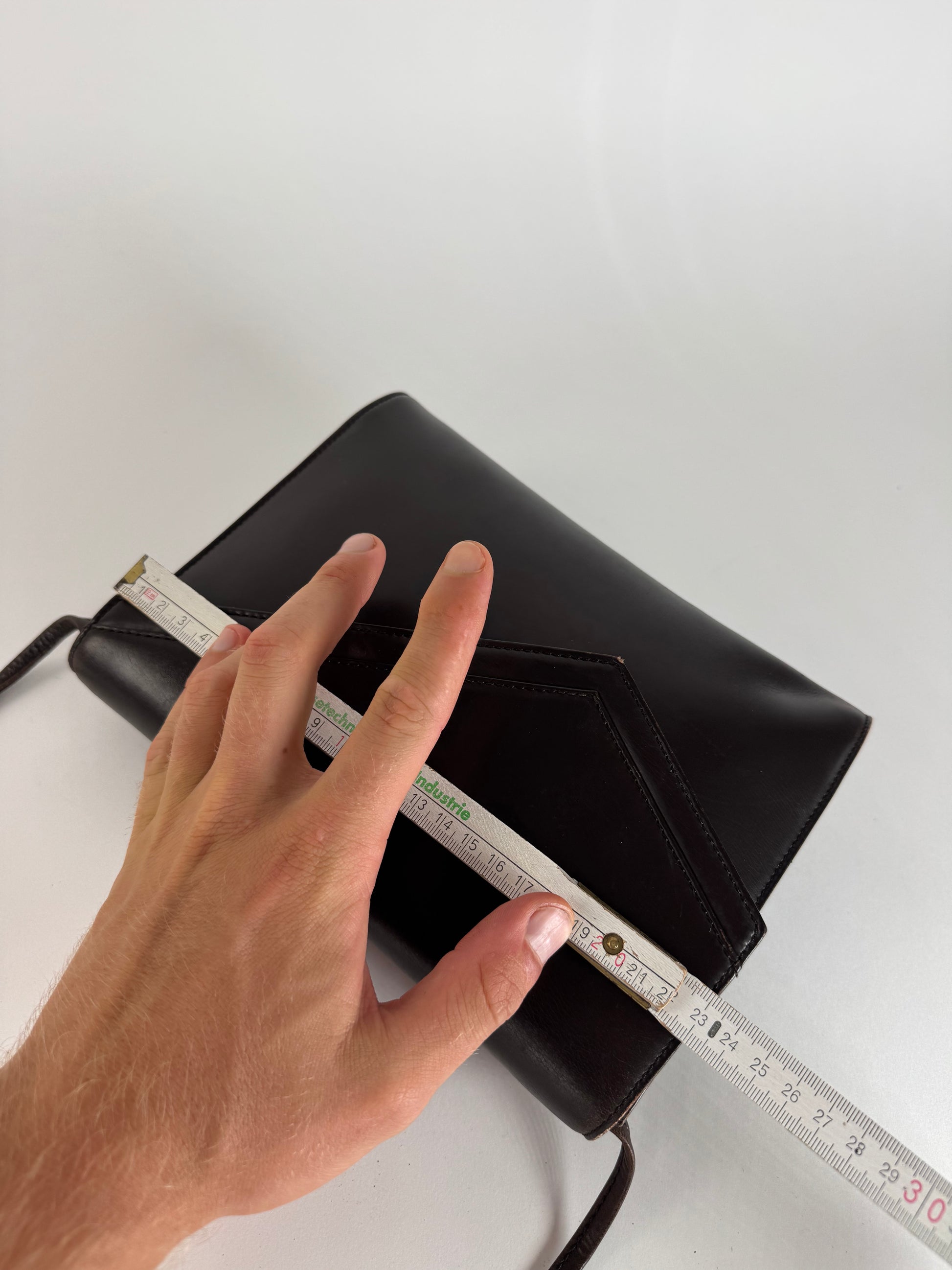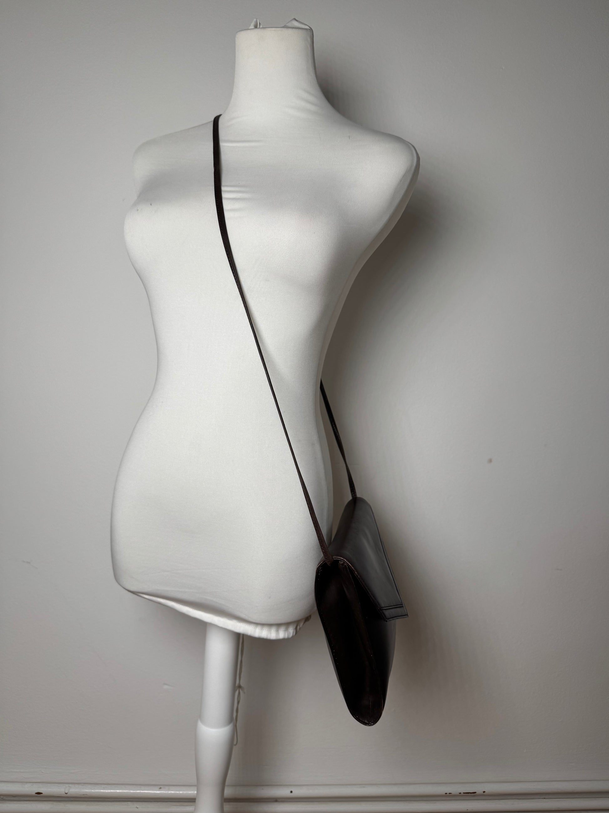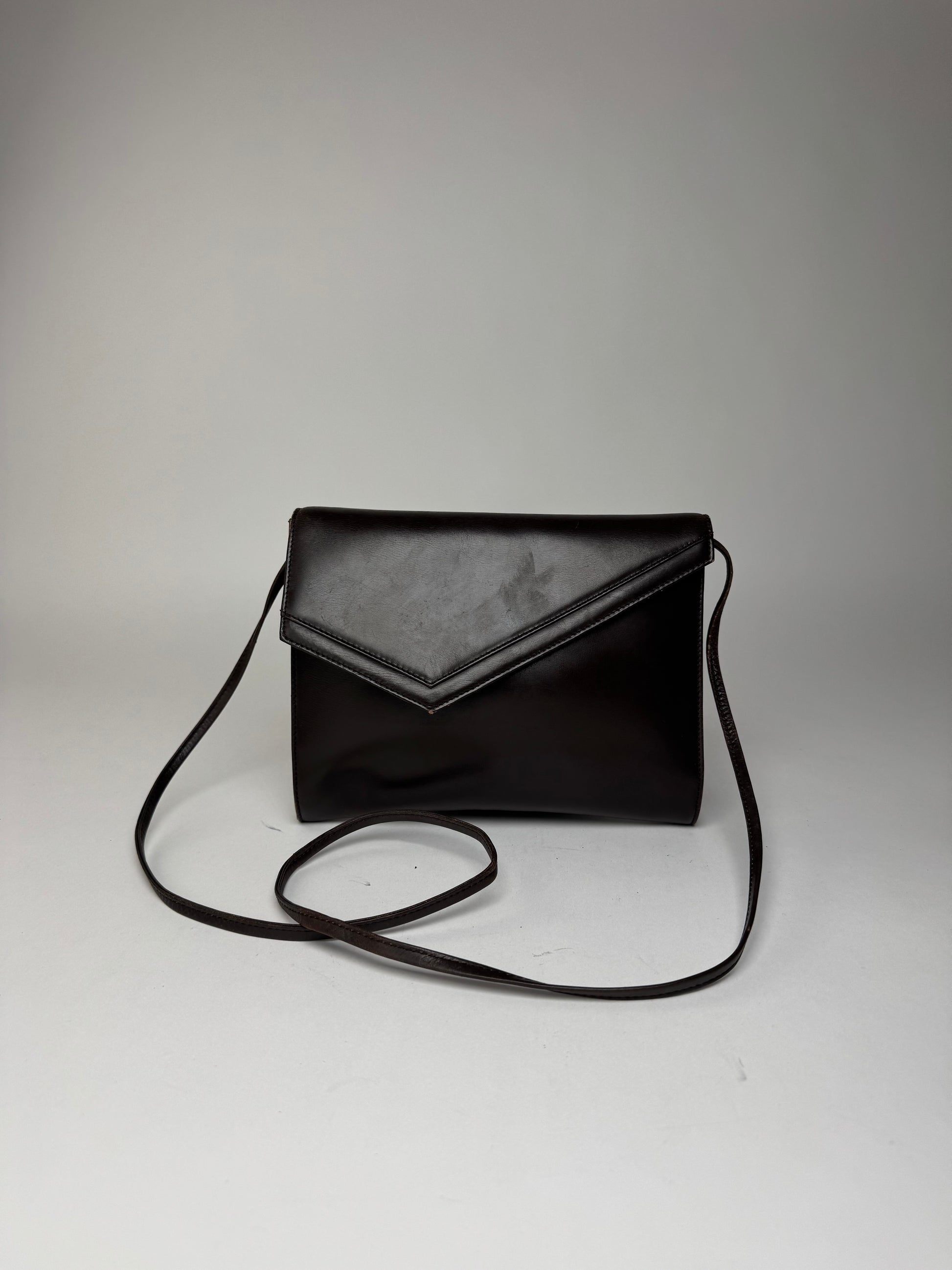 LOEWE vintage shoulder bag. This elegant handbag is finely crafted of dark brown leather with a magnetic closure and gold-tone steel hardware. The interior is lined in brown canvas.