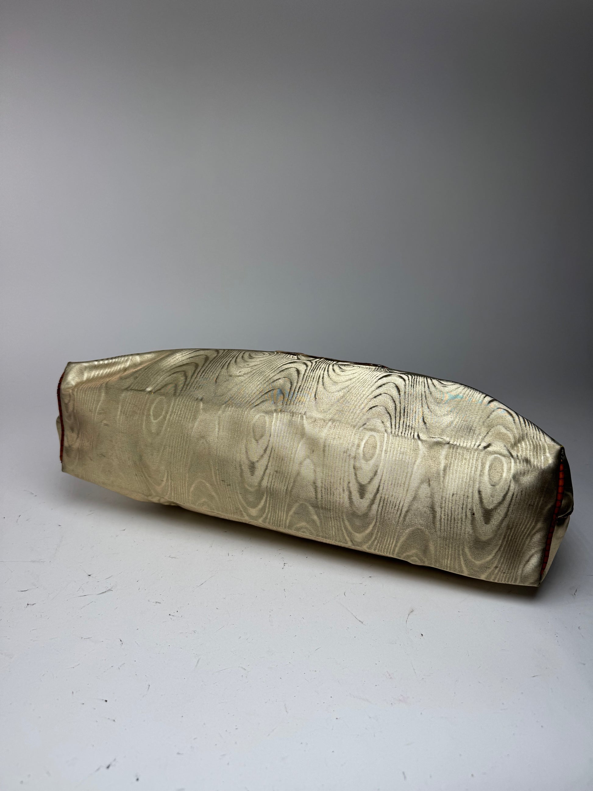 LOEWE MADRID Vintage Metallic Leather Handbag. This eye-catching handbag is crafted from pearl-gold leather and features the signature brown Loewe Anagram logo on the front. It includes two woven canvas handles in beige and brown and a top zipper closure. Gold-tone steel hardware completes the elegant design.