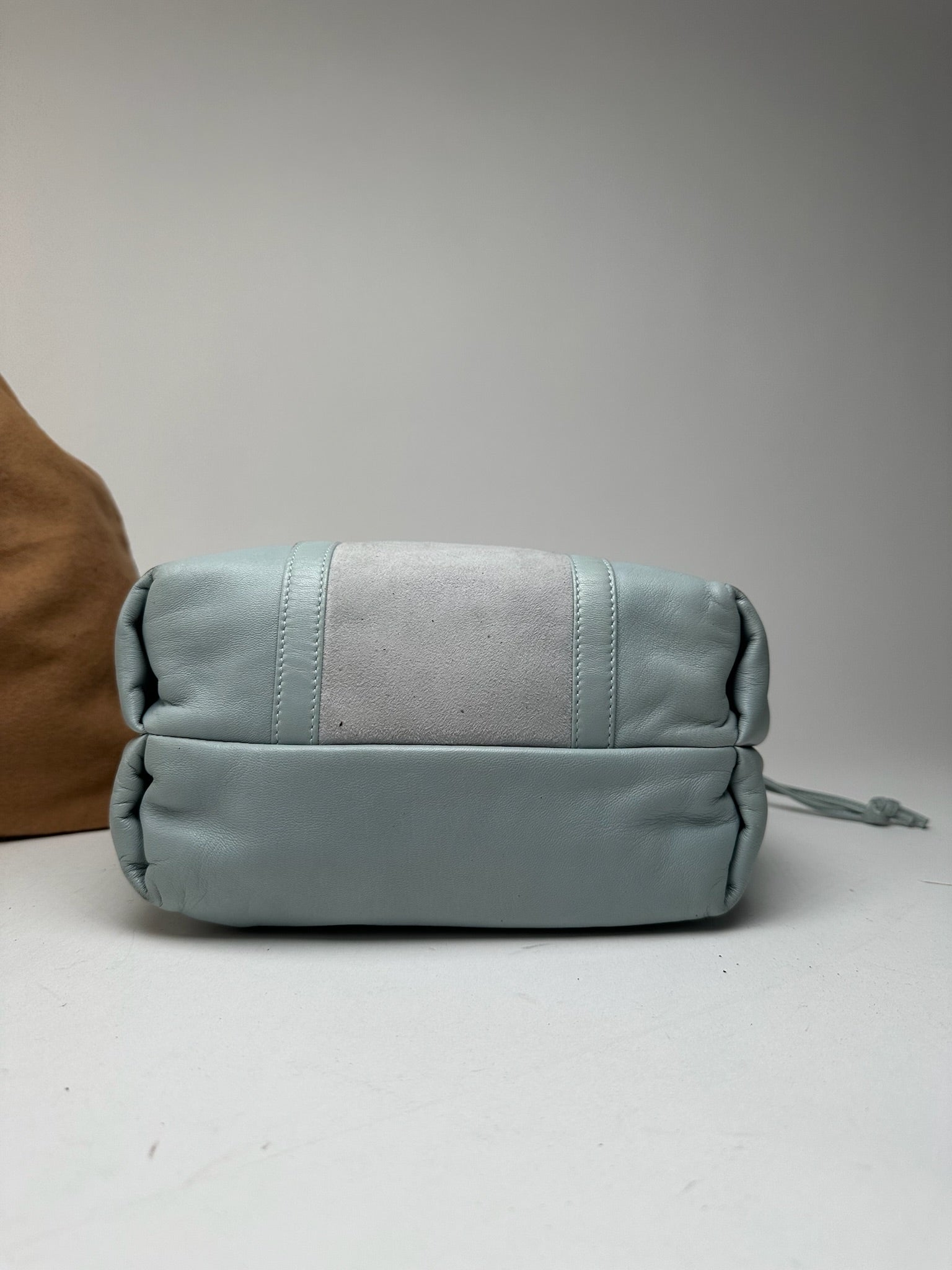 LOEWE Vintage Flamenco Light Blue Leather 2-Way Handbag. This versatile unisex 2-way handbag is crafted from light blue smooth leather and matching suede. It features a magnetic closure and is lined in black leather. The Flamenco model was first introduced in the 1980s and is known for its soft silhouette and artisanal drawstring-inspired design, reflecting LOEWE's heritage in Spanish leather craftsmanship.
