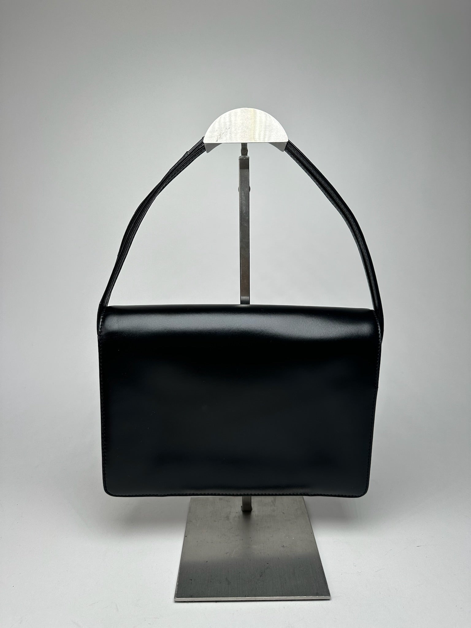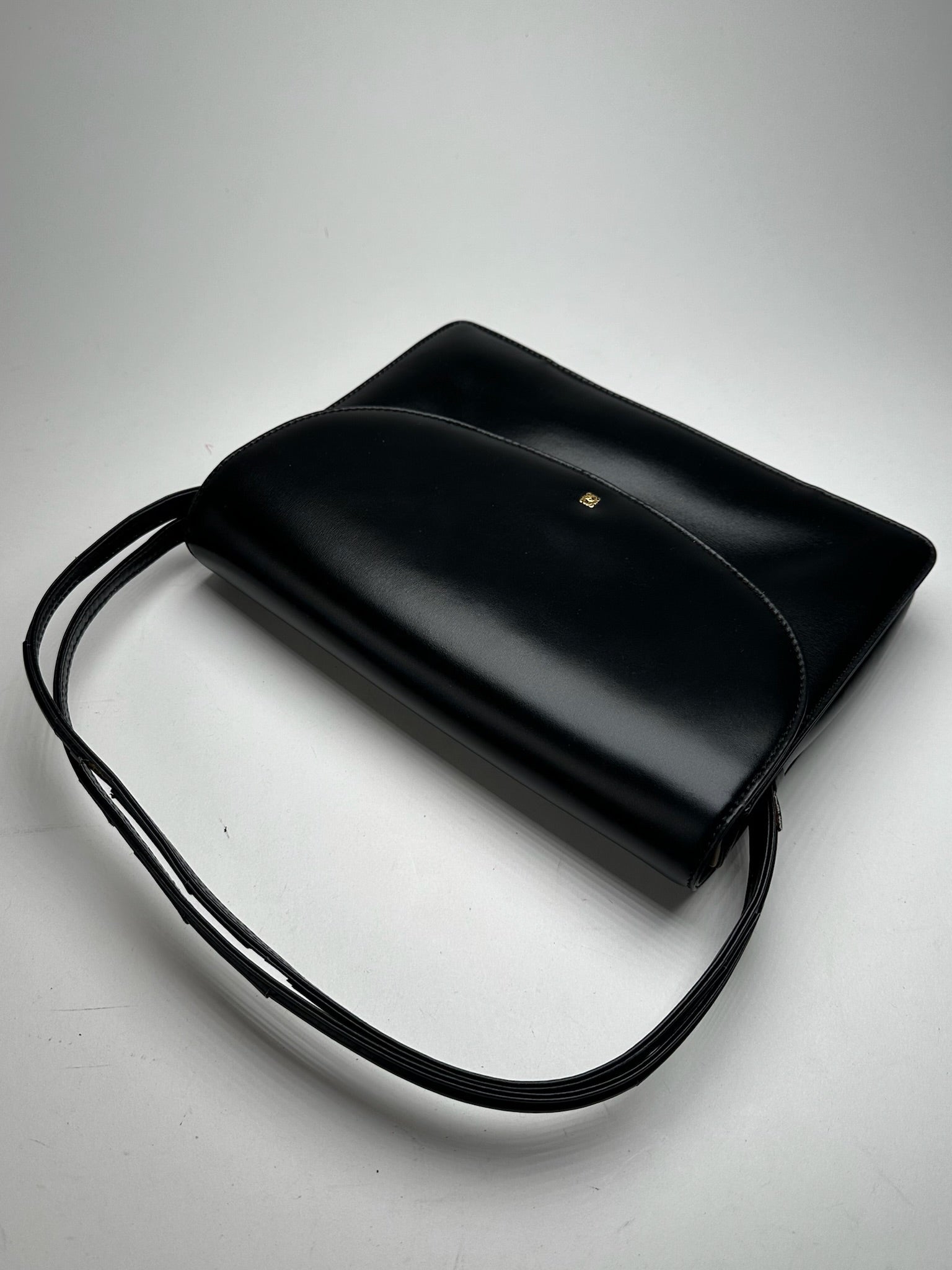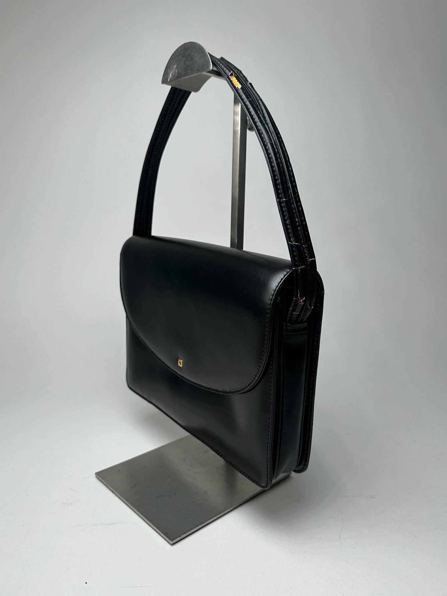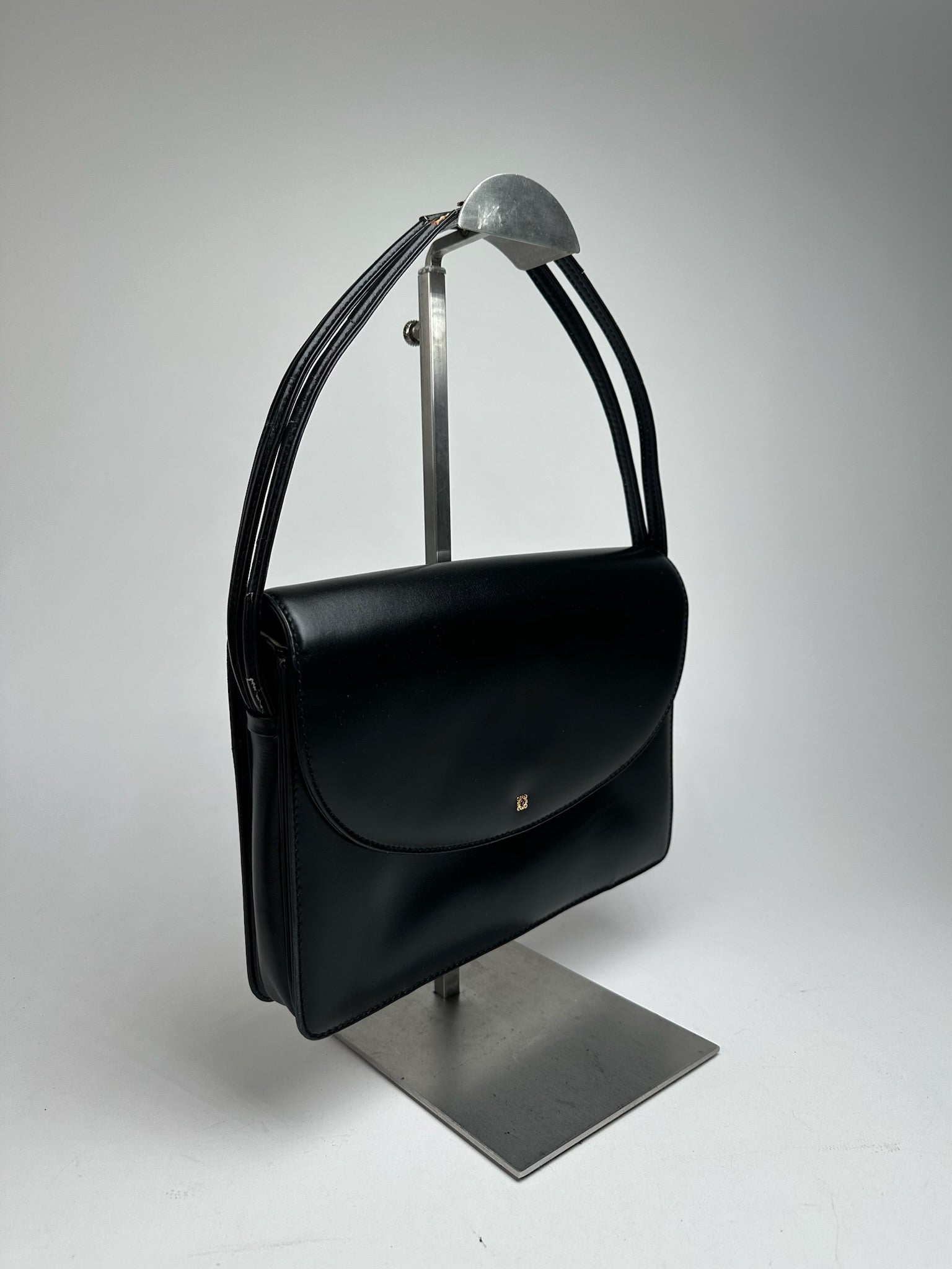 LOEWE MADRID Vintage Leather Handbag. This chic handbag is finely crafted of black leather. The bag features two short top handles, a magnetic flap closure, and gold-tone steel hardware. The flap opens to an interior lined in cream-colored leather.