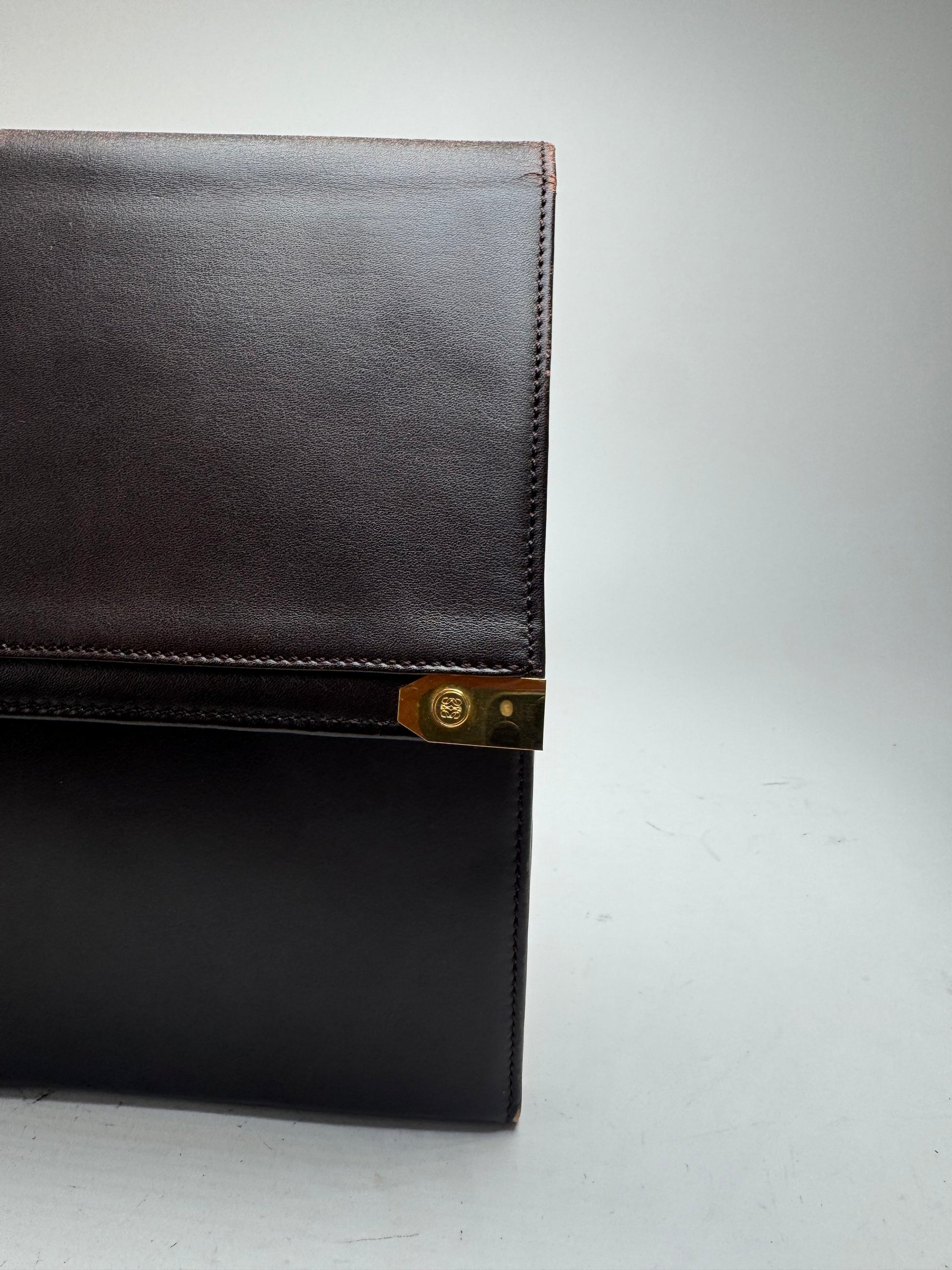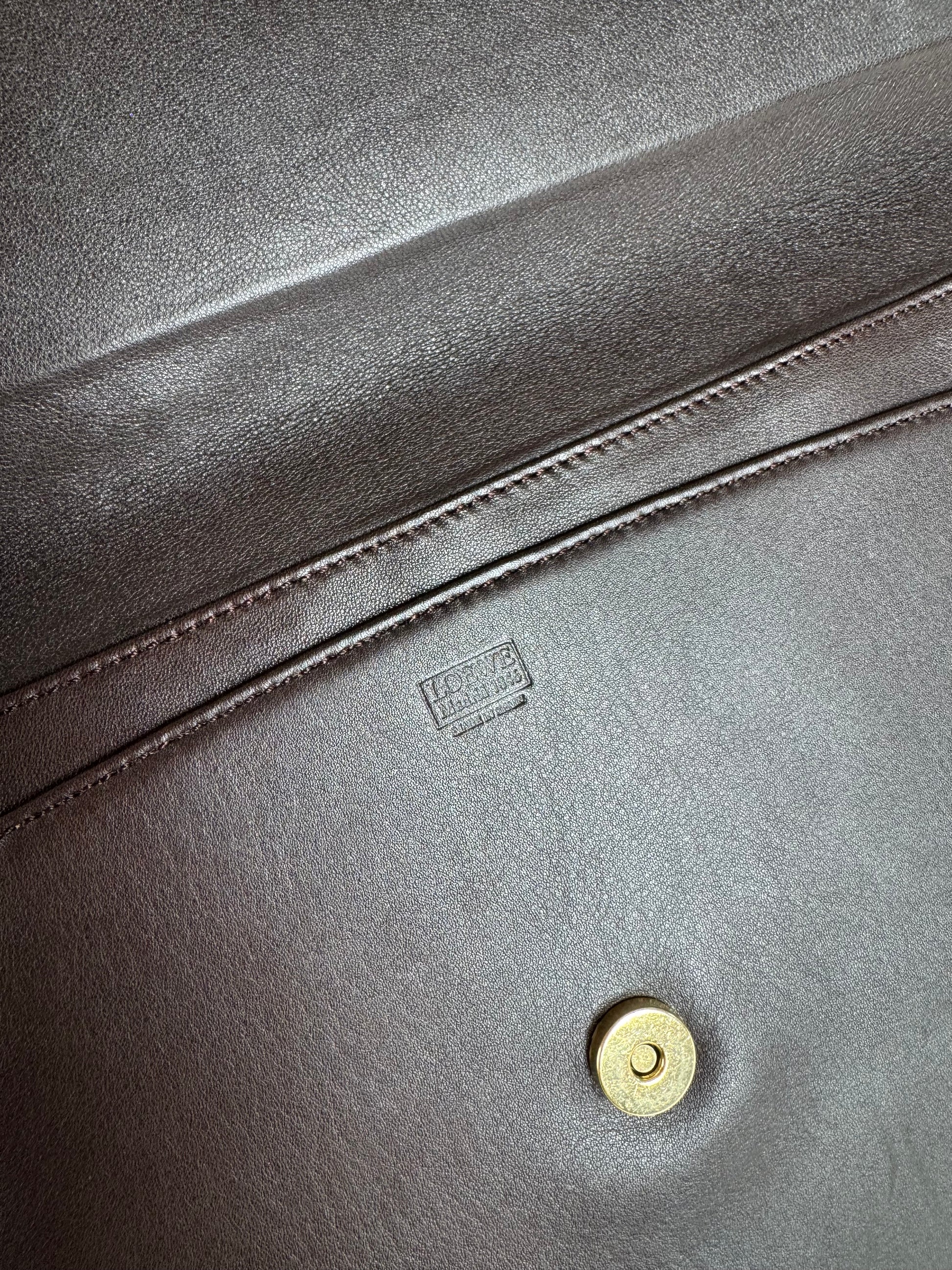 LOEWE MADRID vintage leather clutch. This refined clutch is crafted from dark brown leather and features a magnetic flap closure with gold-tone steel hardware. The front is adorned with multiple gold-tone Loewe Madrid Anagram logos – a motif designed in 1970 by Spanish artist Vicente Vela, symbolizing the brand's legacy in leather artistry and its intertwined craftsmanship. The interior is lined in brown suede and divided into three practical compartments.