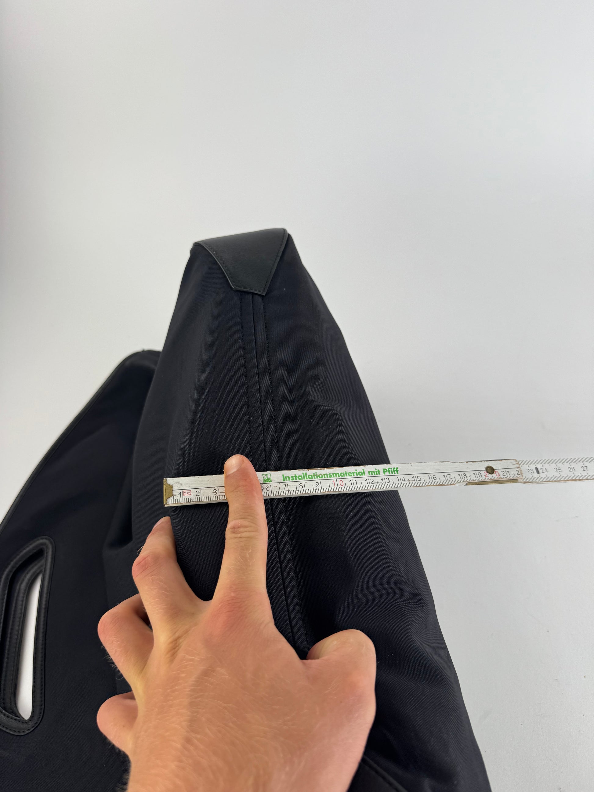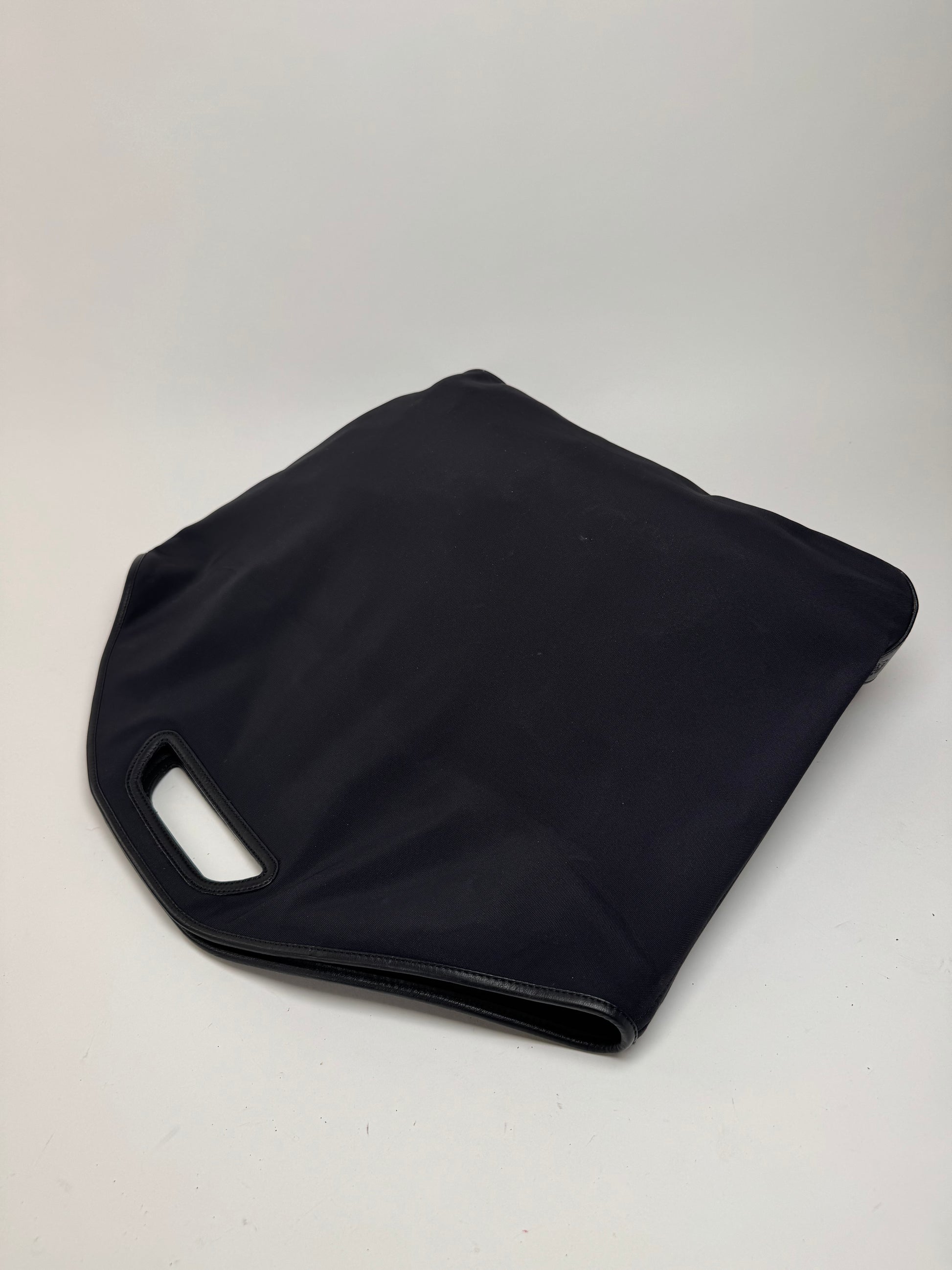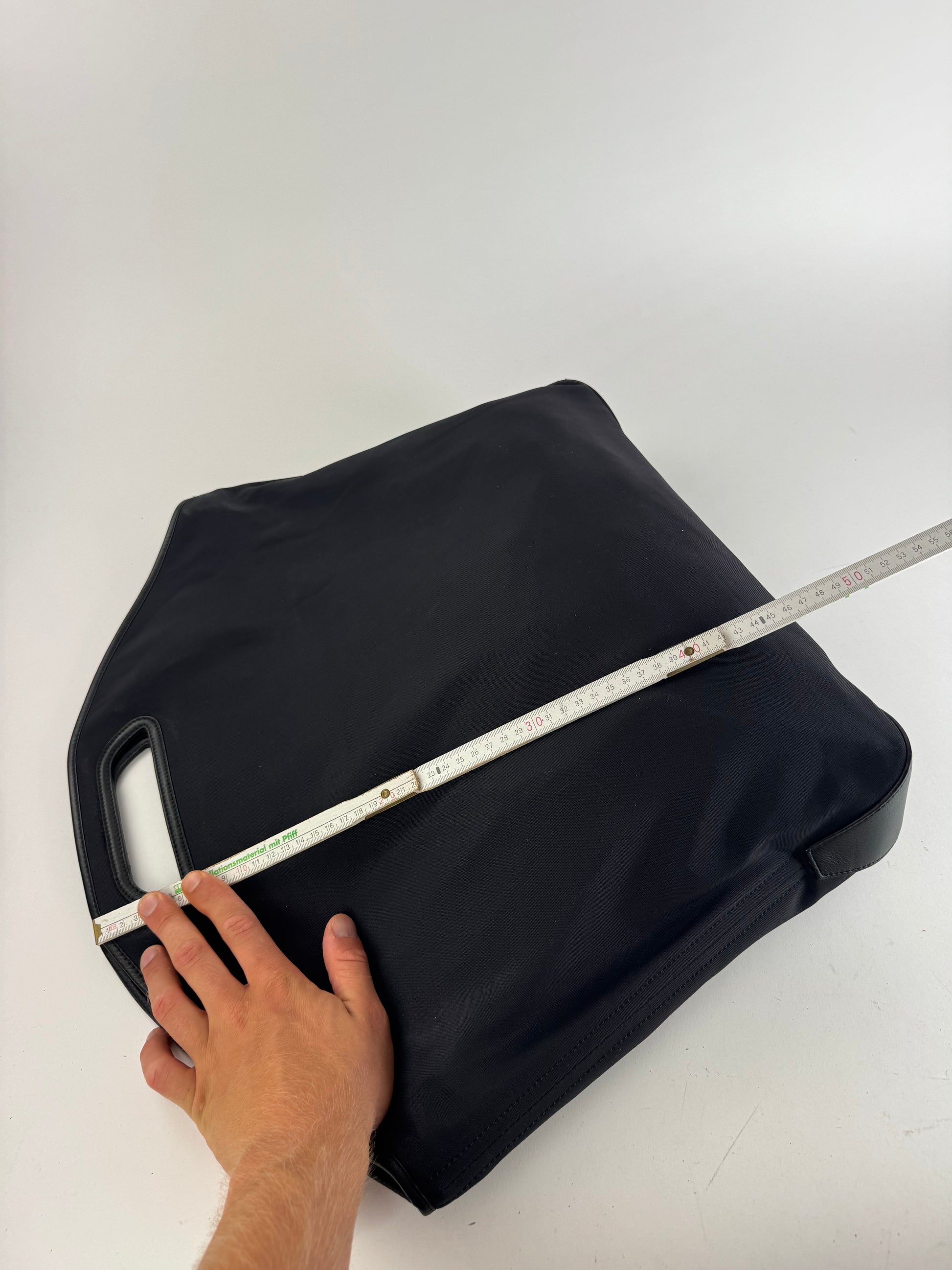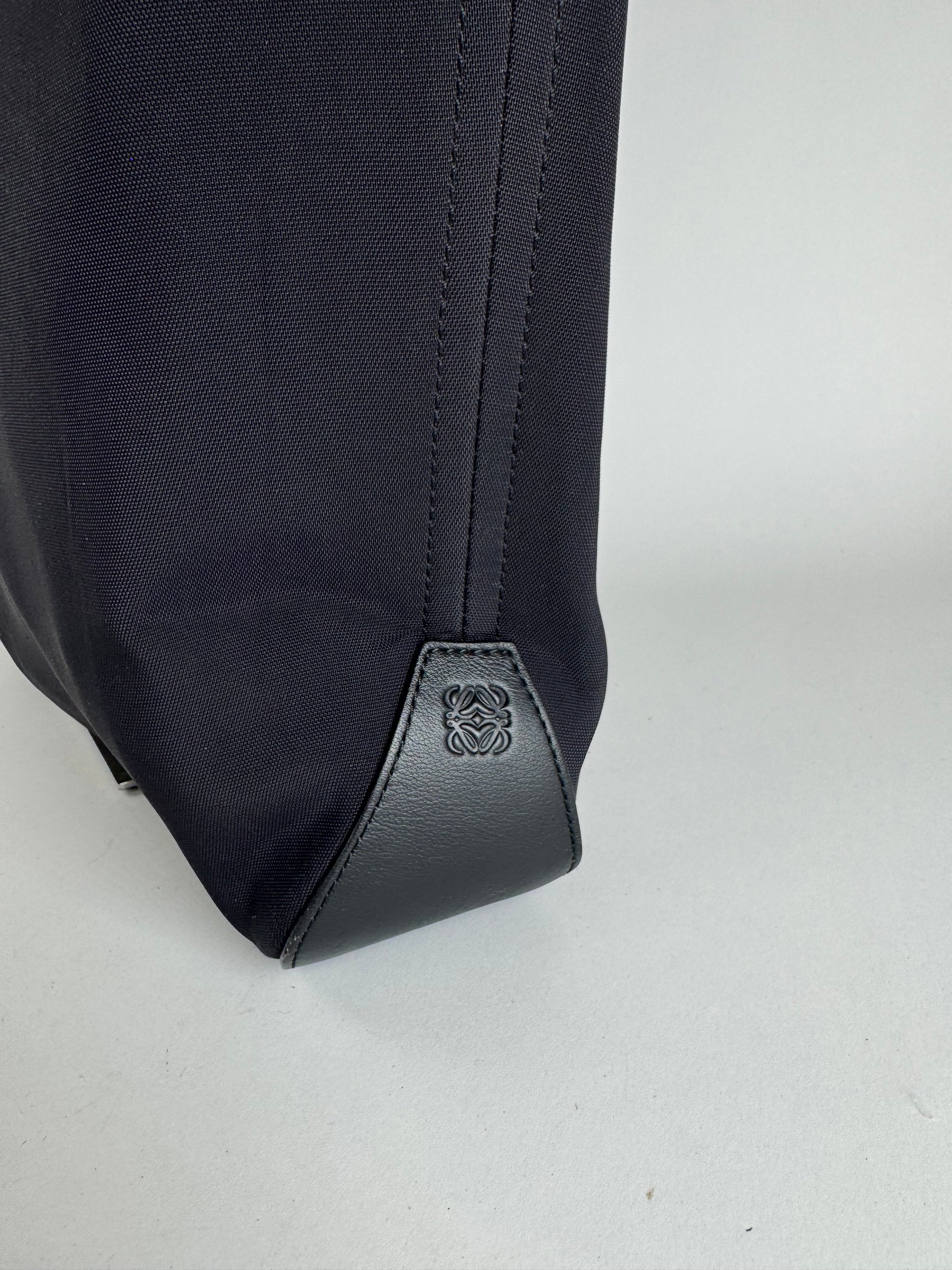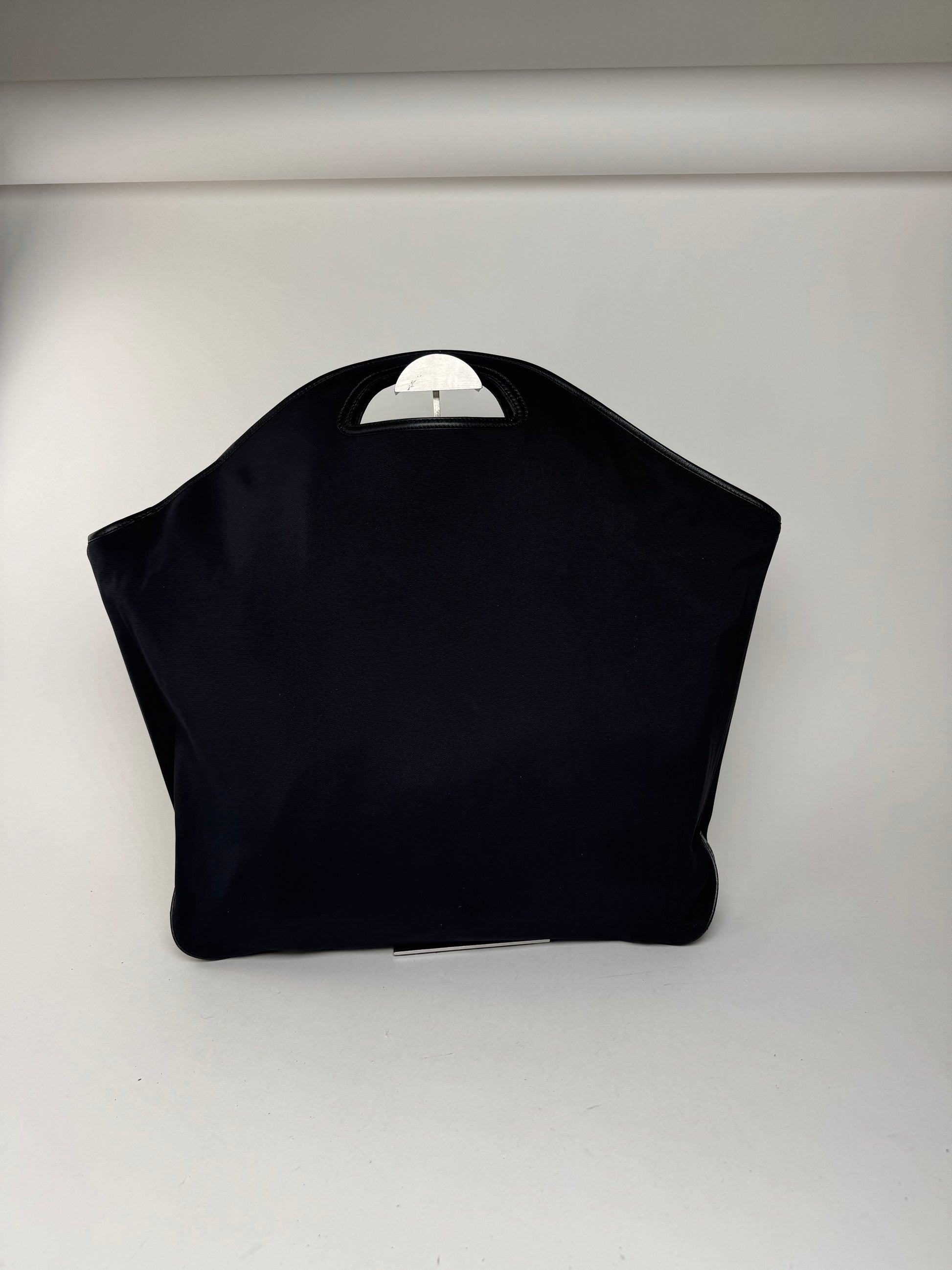 LOEWE MADRID Vintage Navy Neoprene & Black Leather Shopper Bag. This bold vintage shopper is crafted from navy neoprene with black leather accents and features a distinctive cut-out handle design. The Loewe logo is subtly embossed on the side. It includes gold-tone steel hardware and a small attached clutch on the inside. Spacious and structured, this bag is both practical and striking.
