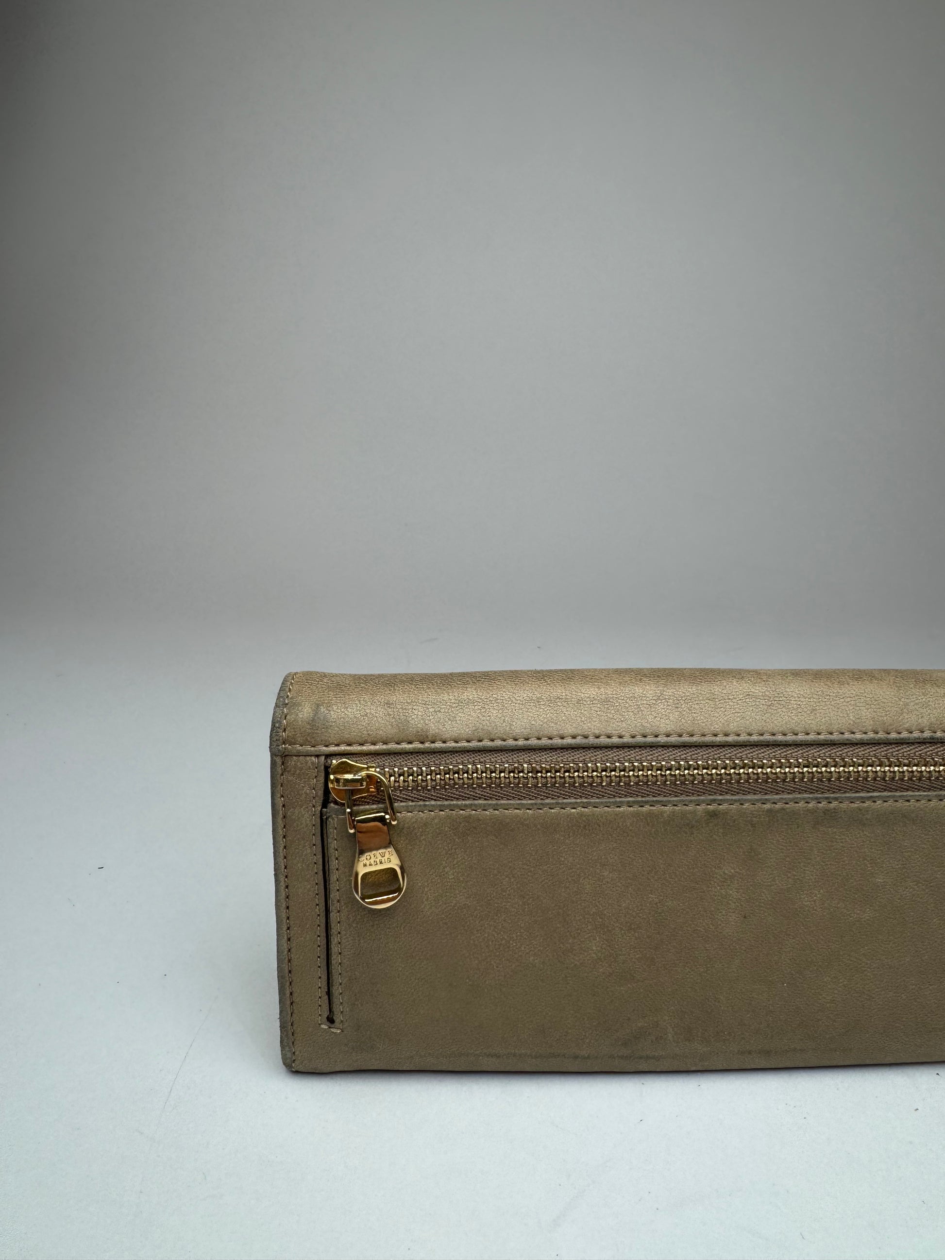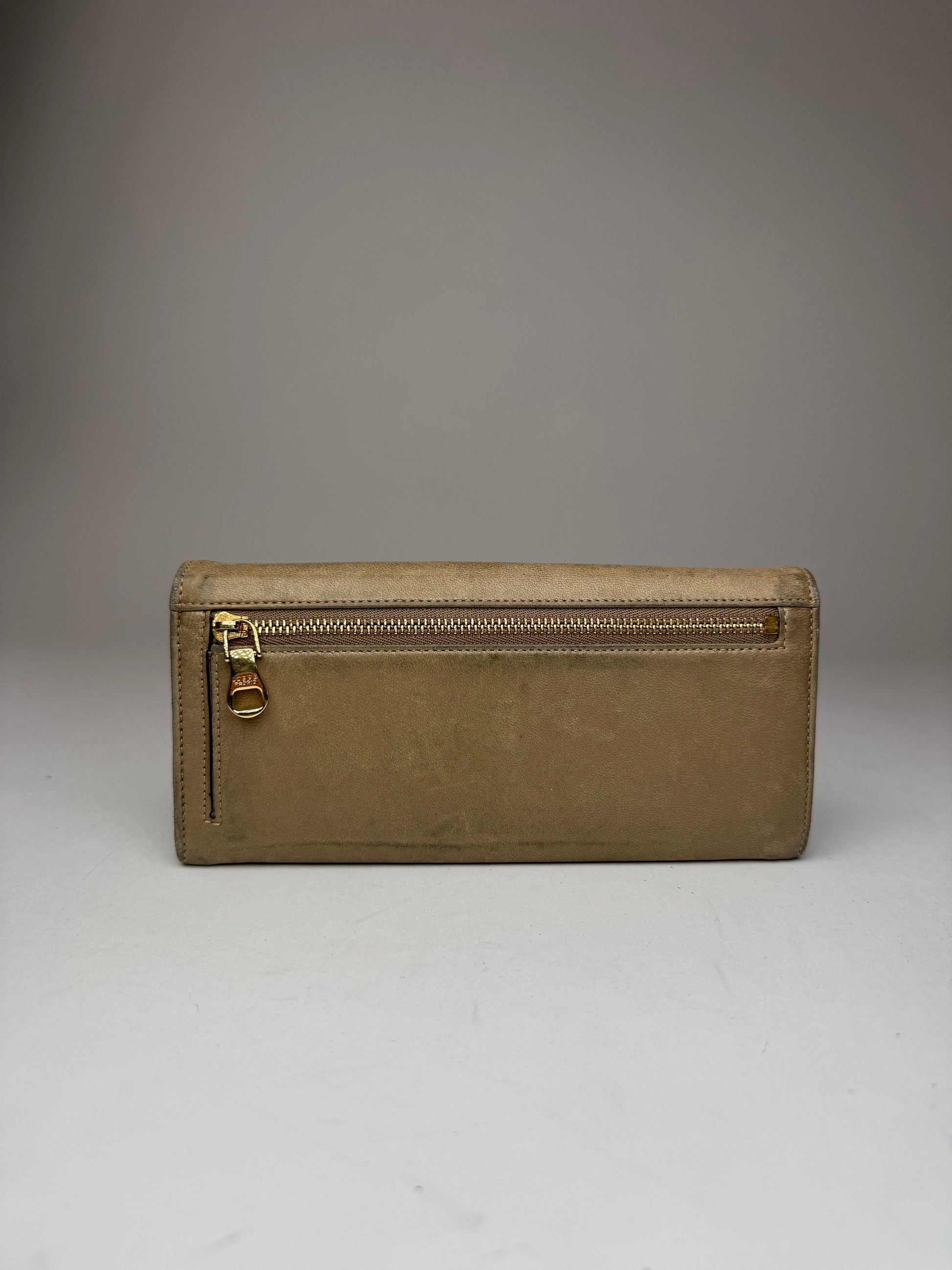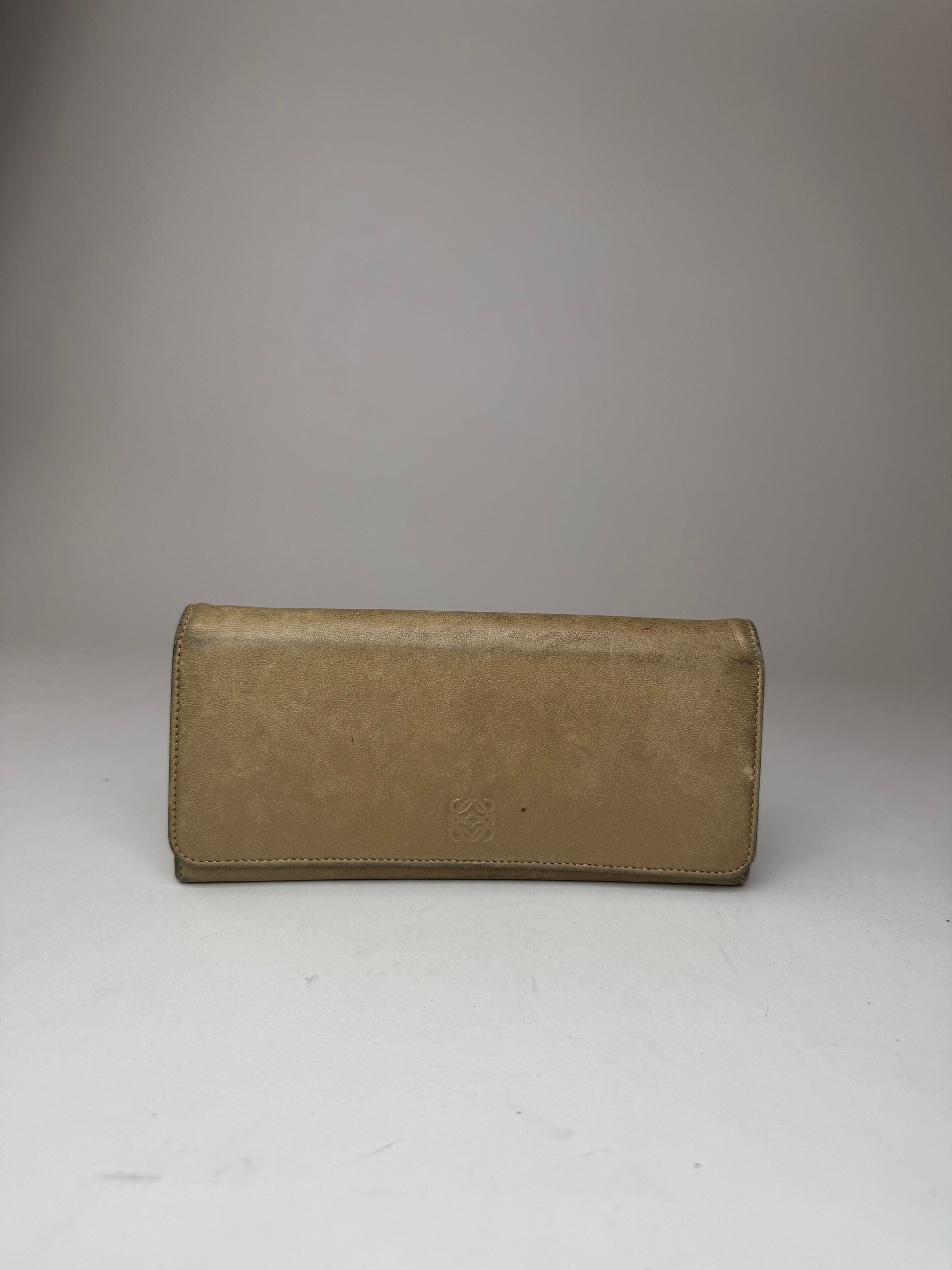 This elegant wallet is finely crafted of soft beige leather with the iconic Loewe Anagram logo stamped on the front. Founded in Madrid in 1846, Loewe has established itself as one of the leading luxury houses, with the Anagram representing heritage, craftsmanship, and timeless design. The wallet features a gold-tone steel snap closure and an exterior zip pocket on the back. The interior is lined in black canvas, combining practicality with understated elegance.
