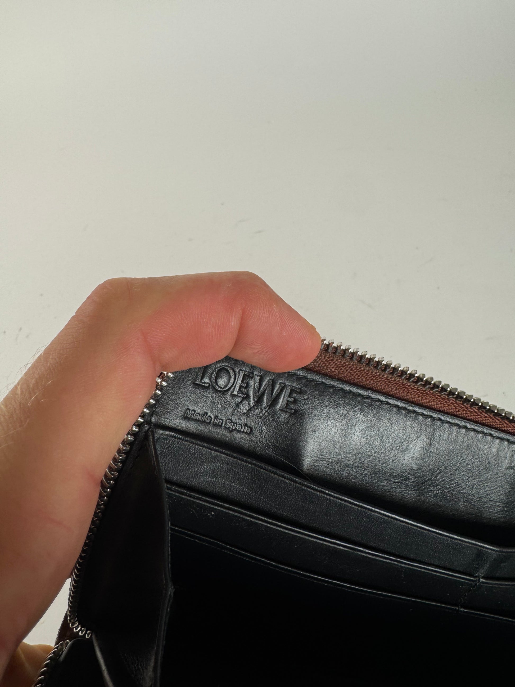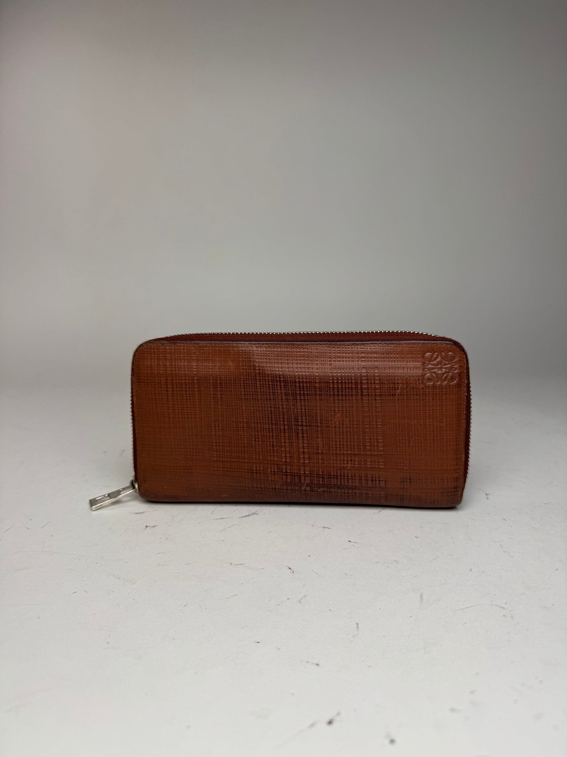 LOEWE MADRID Vintage Textured Leather Wallet. This elegant wallet is crafted from brown textured leather and features an embossed Loewe Anagram logo in the upper right corner of the front. The Anagram, designed in 1970 by Spanish artist Vicente Vela, is a mirrored composition of four intertwined L's, symbolizing Loewe's artisanal heritage and timeless design.
