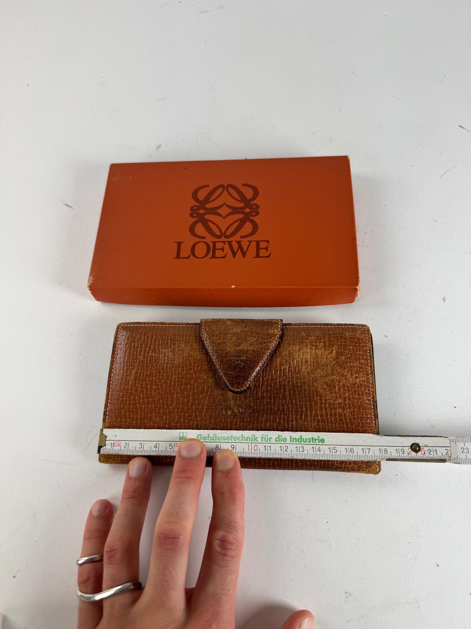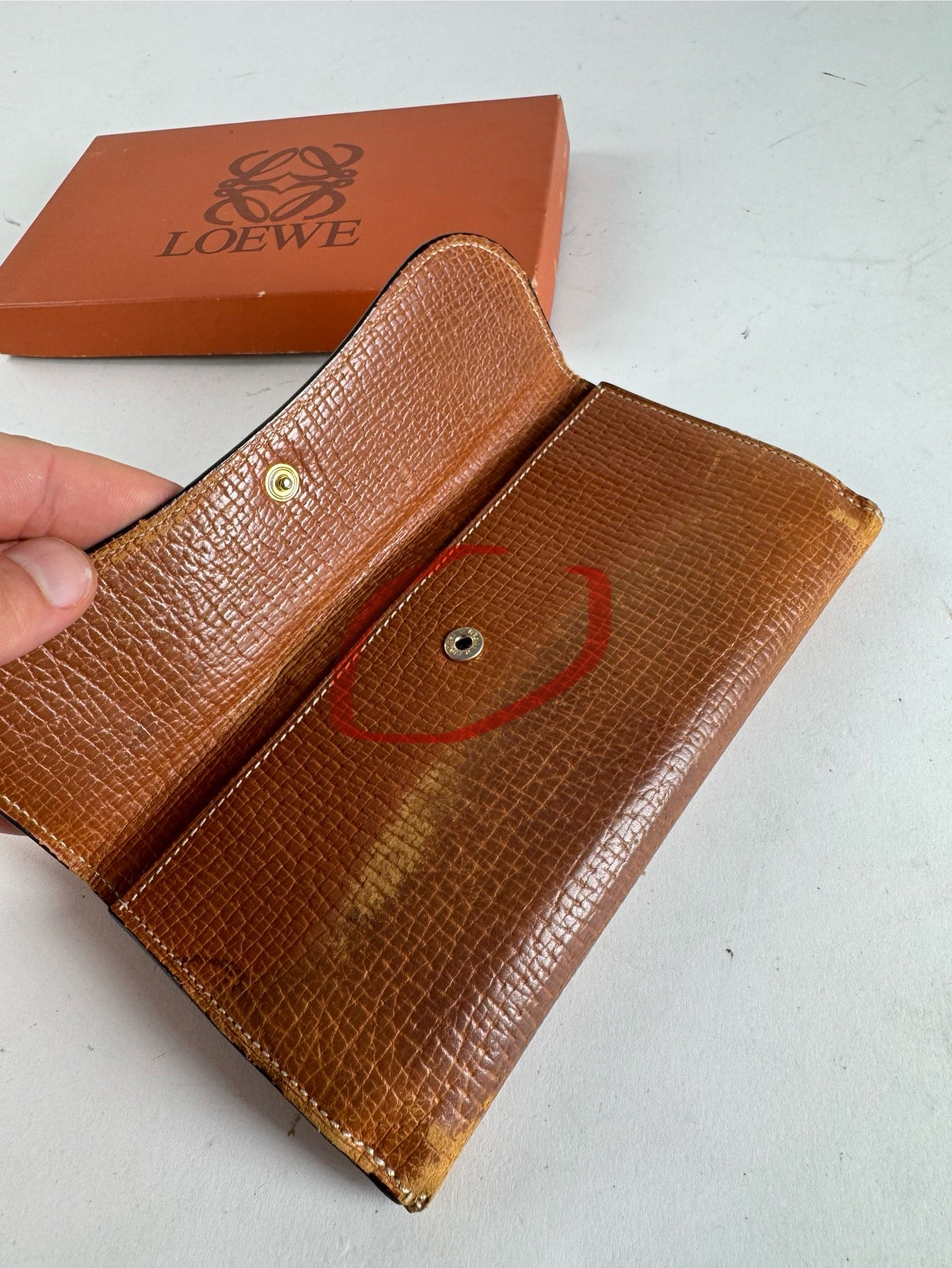 LOEWE Madrid Vintage Brown Leather Case/Wallet. This vintage piece is finely crafted of brown ribbed leather with the Loewe logo embossed on the front. It features snap button closures on the front and back, with one snap on the reverse side not functioning. The interior is finished in the same leather.