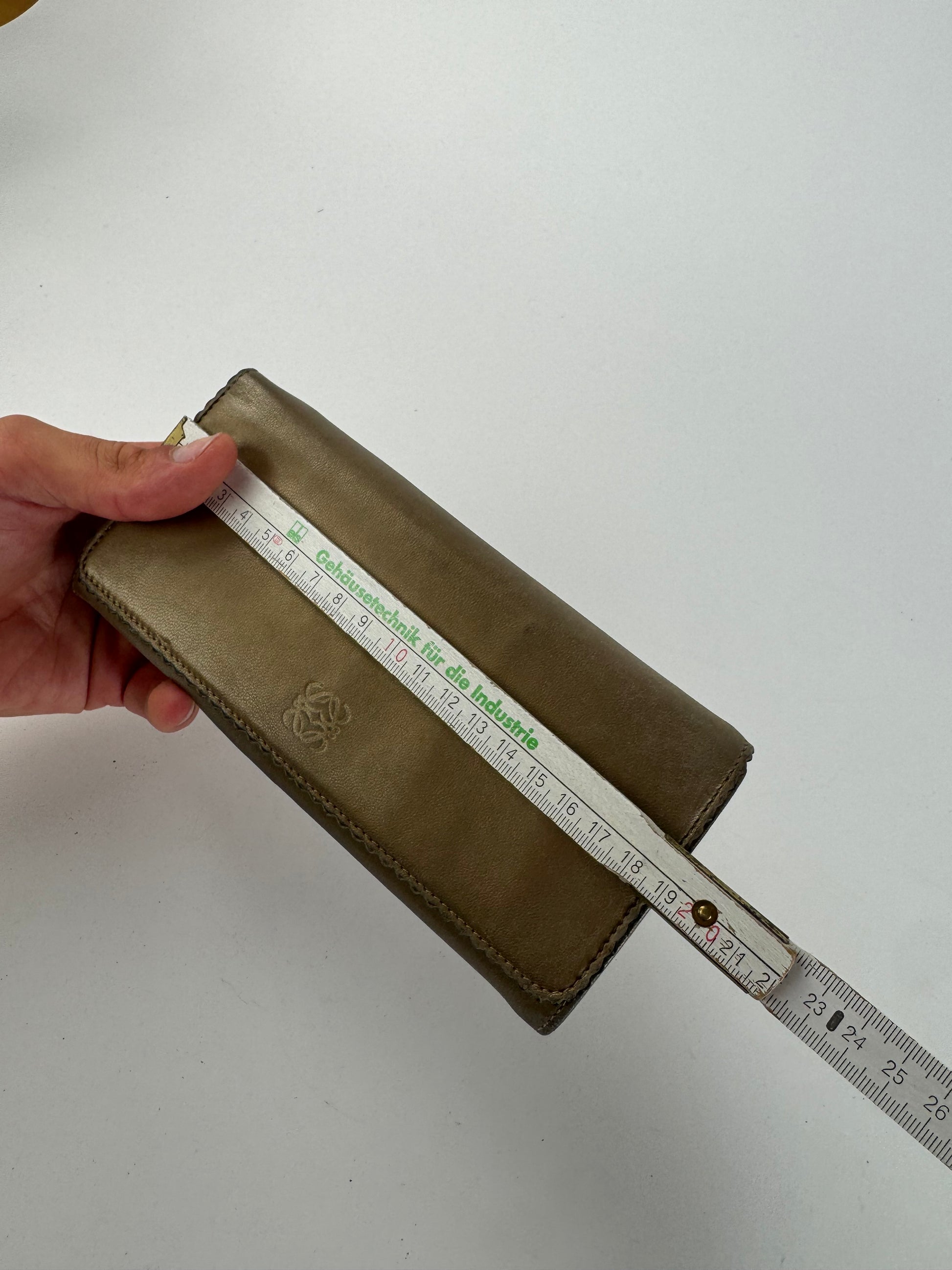 This elegant wallet is finely crafted of exceptionally soft gold-tone leather. The front features the embossed Loewe Anagram logo—first introduced in 1970 by Spanish artist Vicente Vela, the interlocking "L"s have become a symbol of Loewe's heritage in leather craftsmanship and refined design. The wallet has a snap button closure, and a large gold leather pull tab is attached to the interior zipper. A rear zipper compartment offers additional storage.