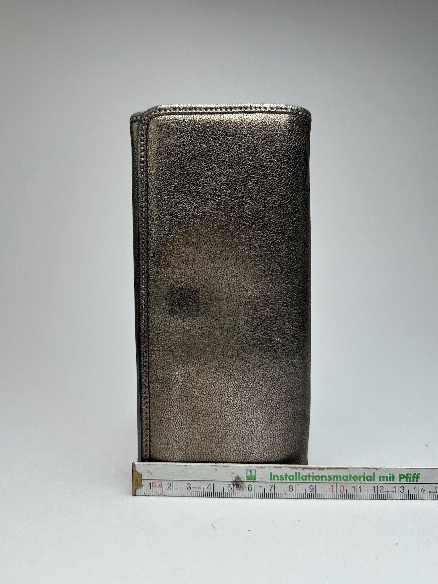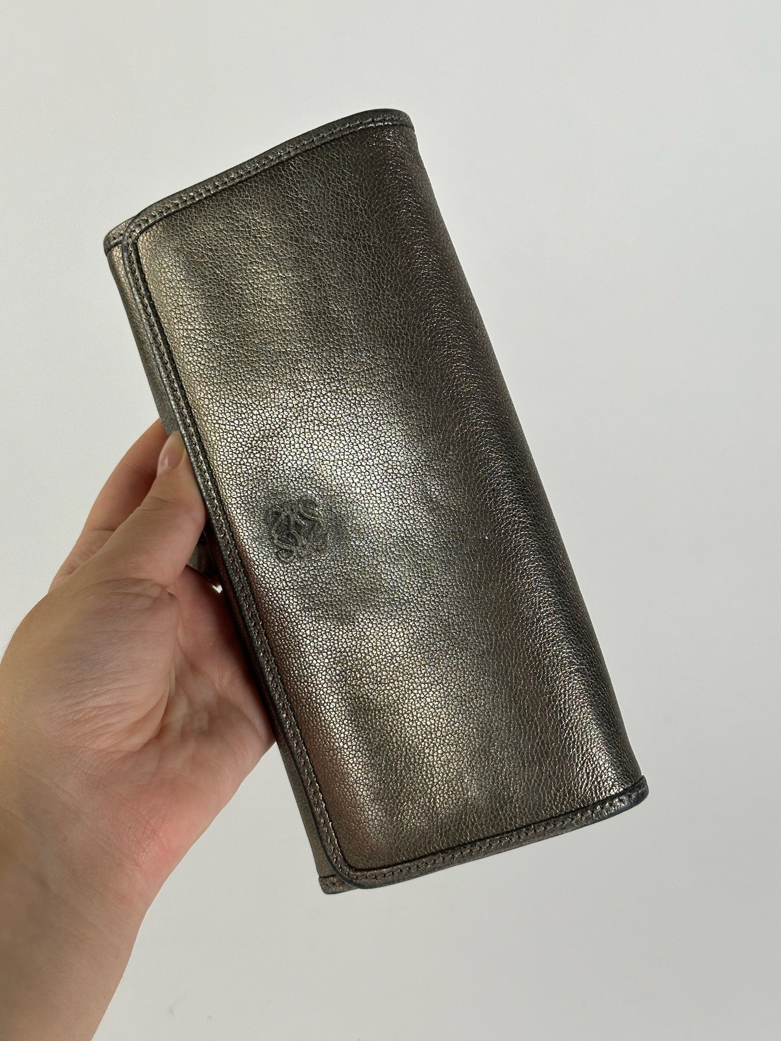 LOEWE MADRID Vintage Leather Wallet. This chic wallet is finely crafted of silver-tone leather with the iconic Loewe Anagram logo embossed on the front. It features gold-tone steel hardware, a snap button closure on the front, and a zipper compartment on the back. The interior is lined in black leather.
