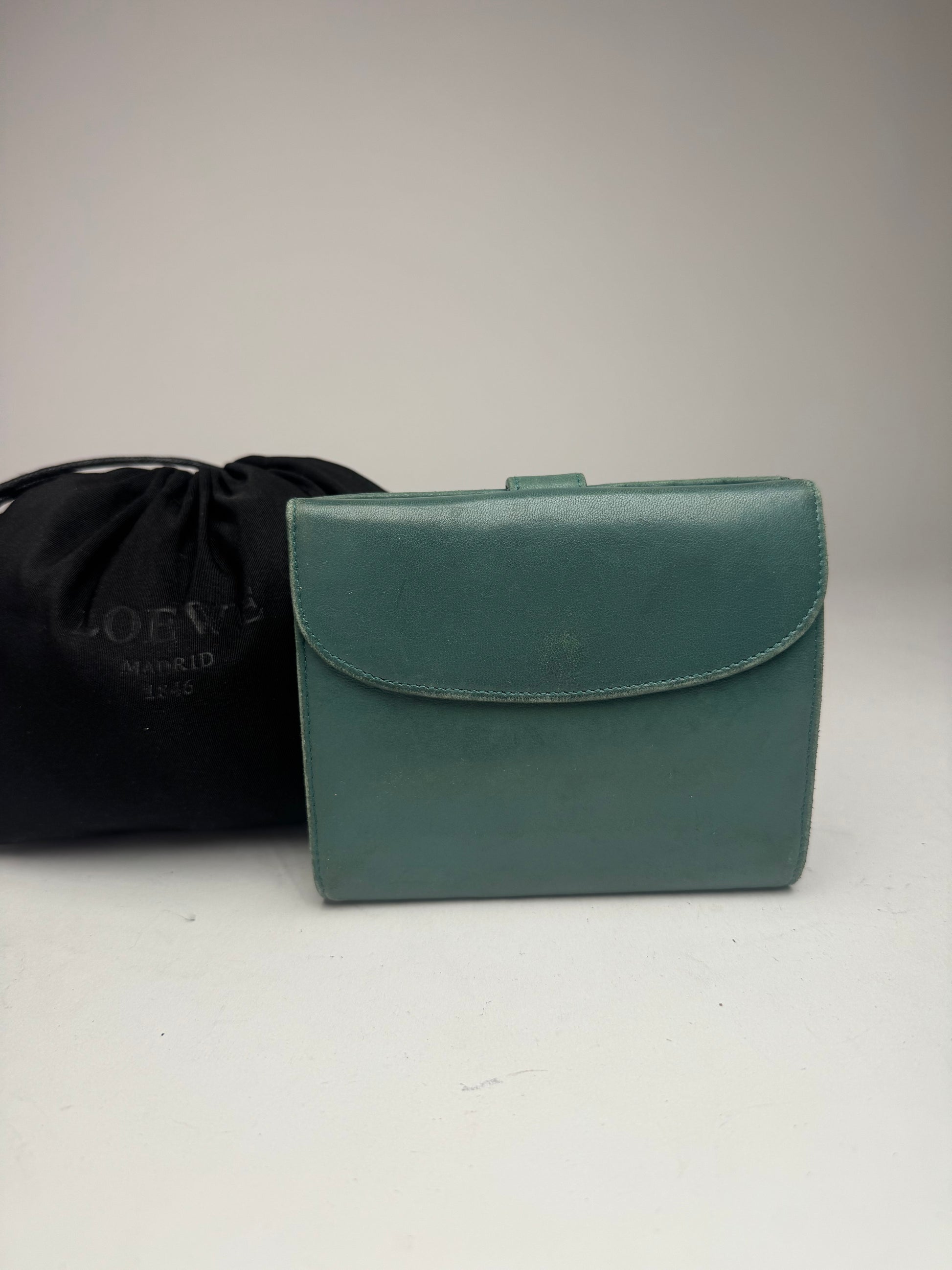 LOEWE Madrid Vintage Wallet. This elegant piece is finely crafted from soft mint green leather with the iconic Loewe anagram logo embossed on the front. Founded in 1846 in Madrid, Loewe is one of the oldest luxury fashion houses, renowned for exceptional craftsmanship and leather expertise. The wallet features two snap button closures: one opening to compartments for bills and cards, and the other for coins. The interior is lined in soft leather, and the hardware is gold-tone steel.
