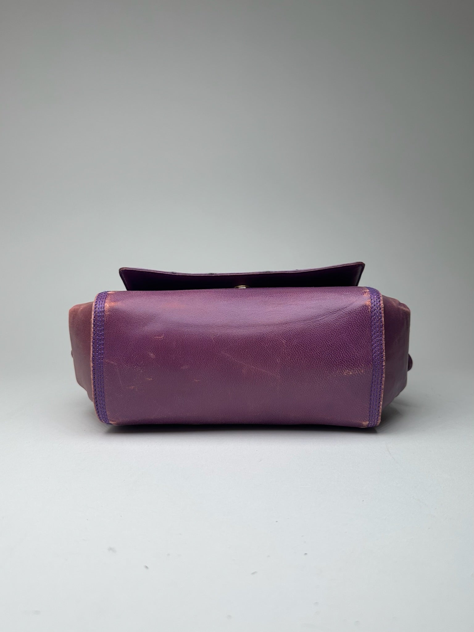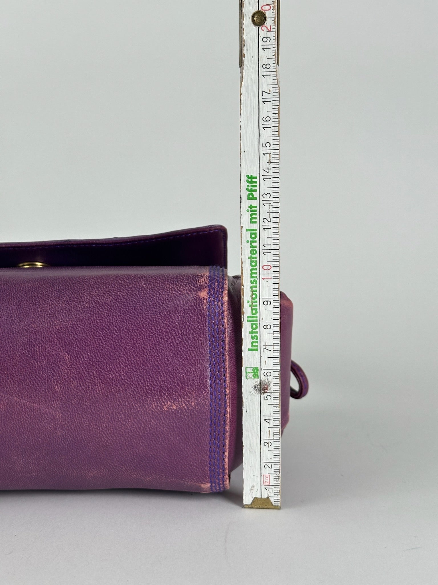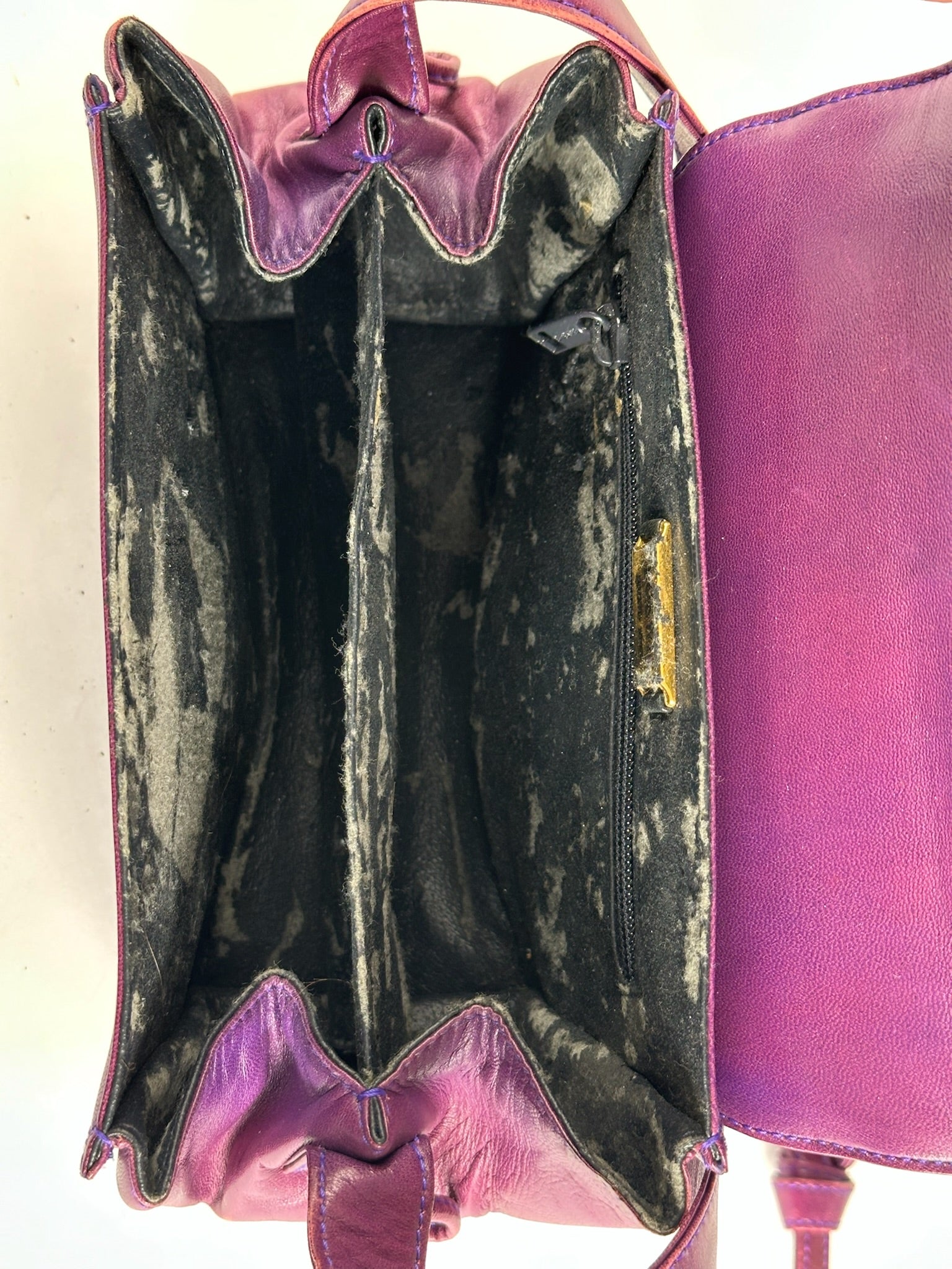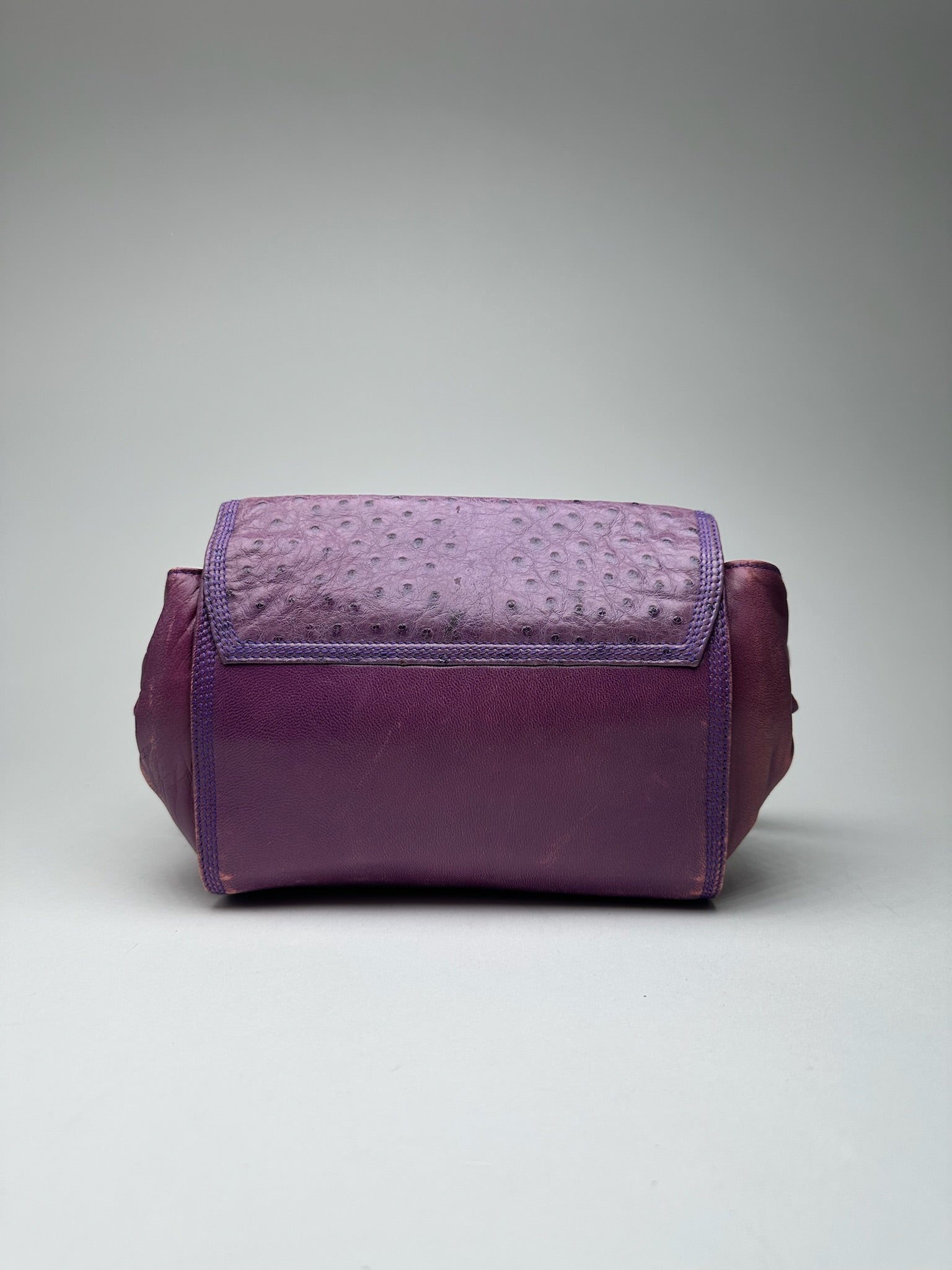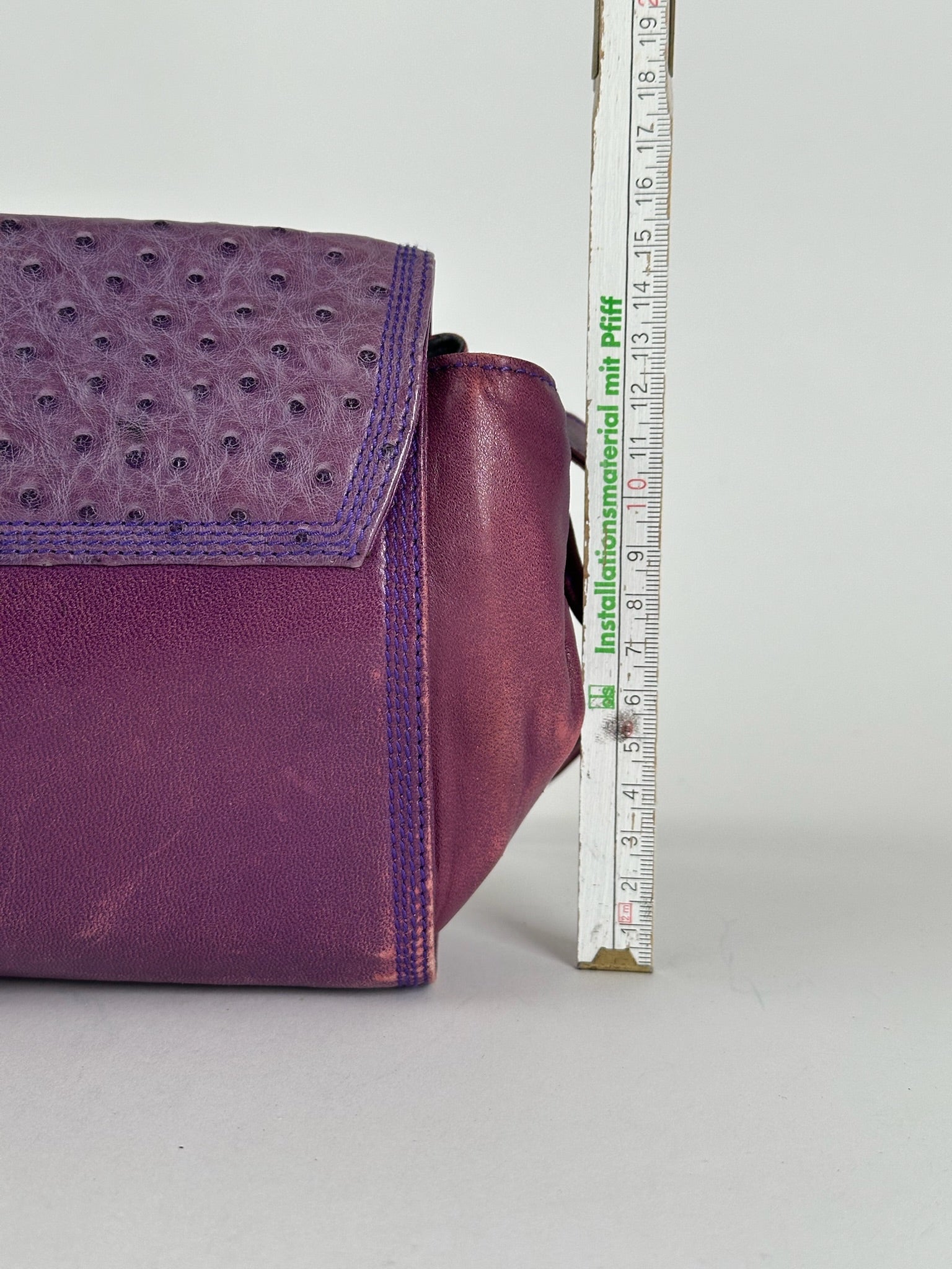This unique bag is finely crafted of purple leather combined with ostrich leather detailing. It features a long, adjustable strap, a drawstring closure with an additional magnetic snap, and gold-tone steel hardware.