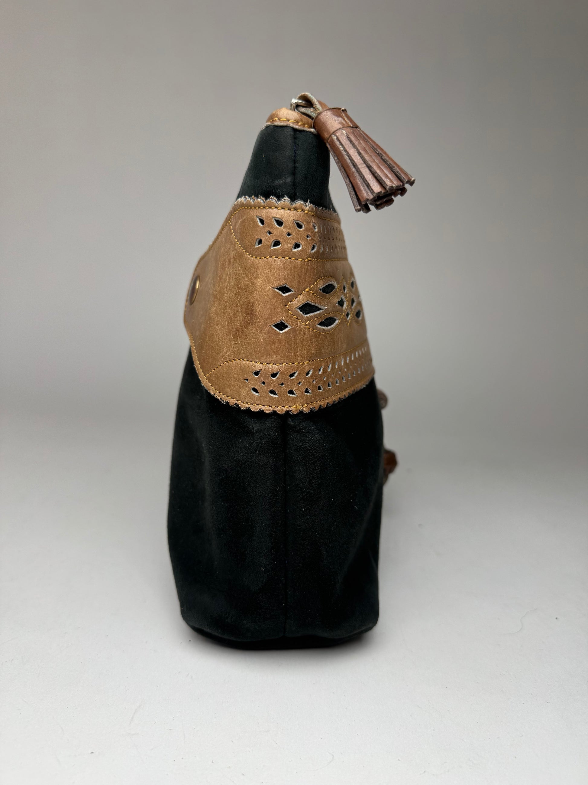 LOEWE MADRID Maestranza vintage clutch. This elegant clutch is finely crafted of black suede and beige-brown leather. From the Sevilla Collection, it features the Loewe logo on the front, a top zipper closure, and a beige canvas interior.