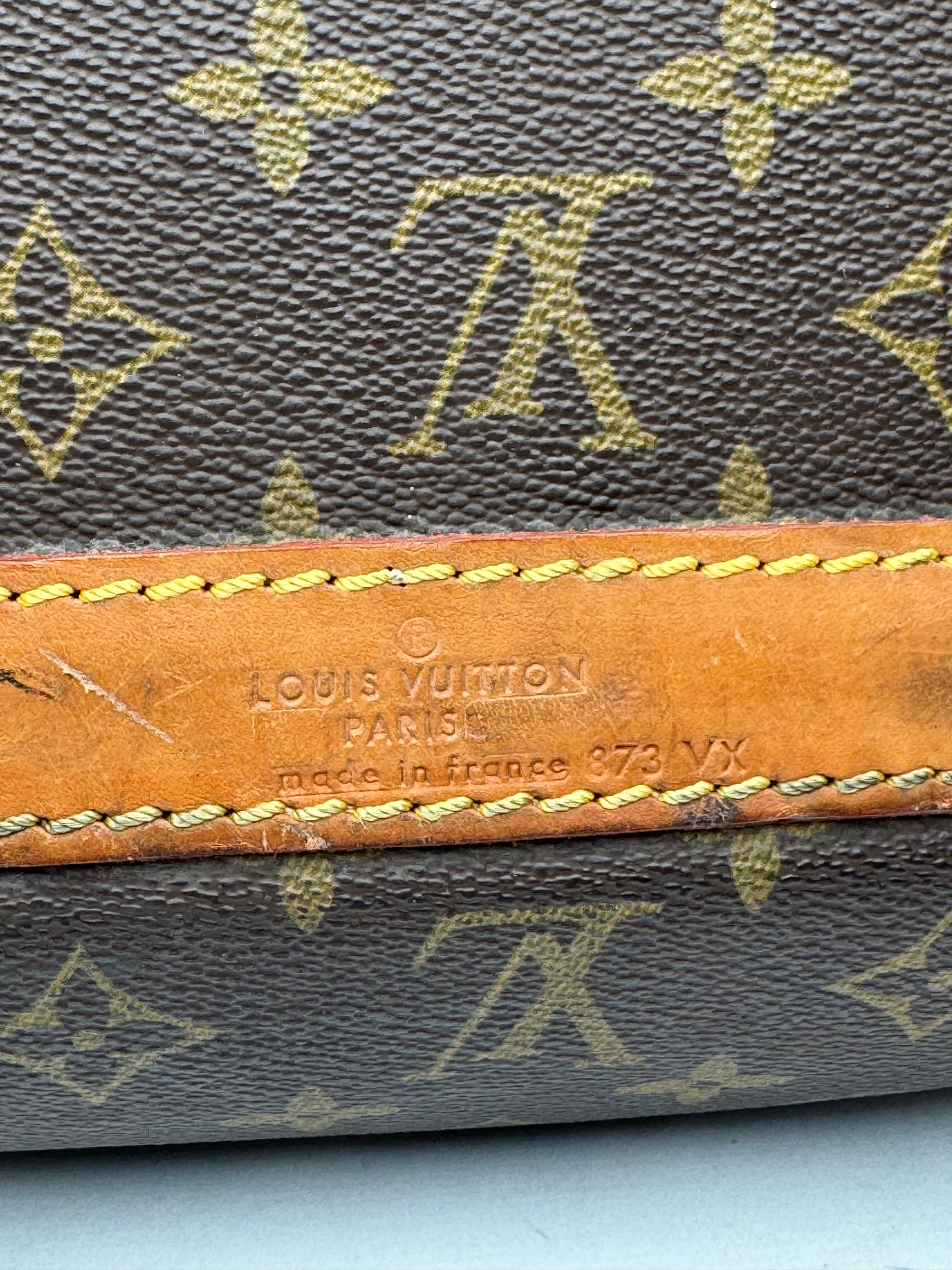 Condition Details: The exterior monogram canvas is in very good condition with some pulled threads, repaired areas, scuffs, and stains. The light brown leather handles show signs of wear. The beige canvas interior is well-maintained. The gold-toned hardware remains bright with slight wear.