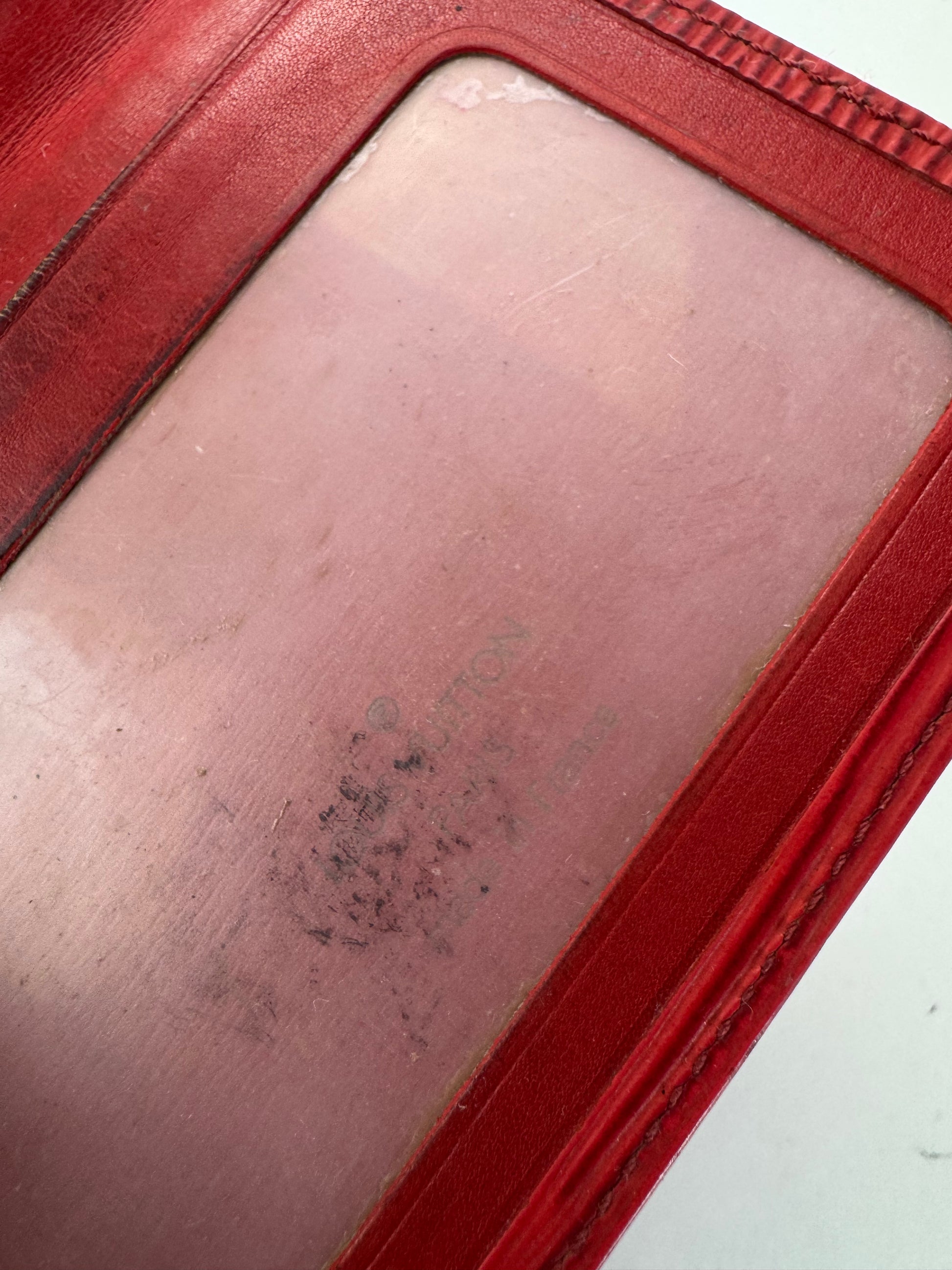 Condition Details: The Epi leather shows minor surface scratches consistent with gentle use. The two interior transparent slots are slightly soiled but remain functional.
