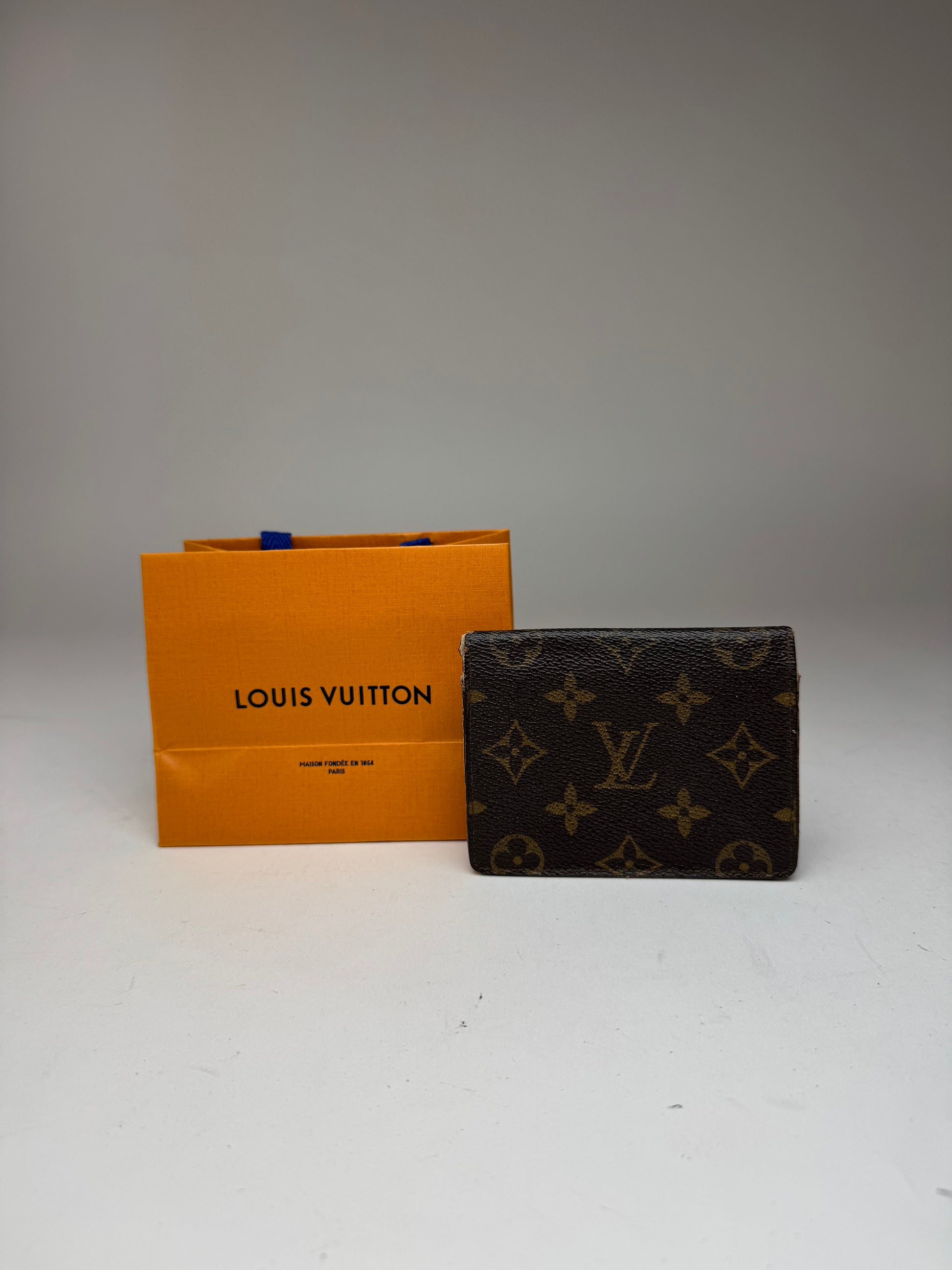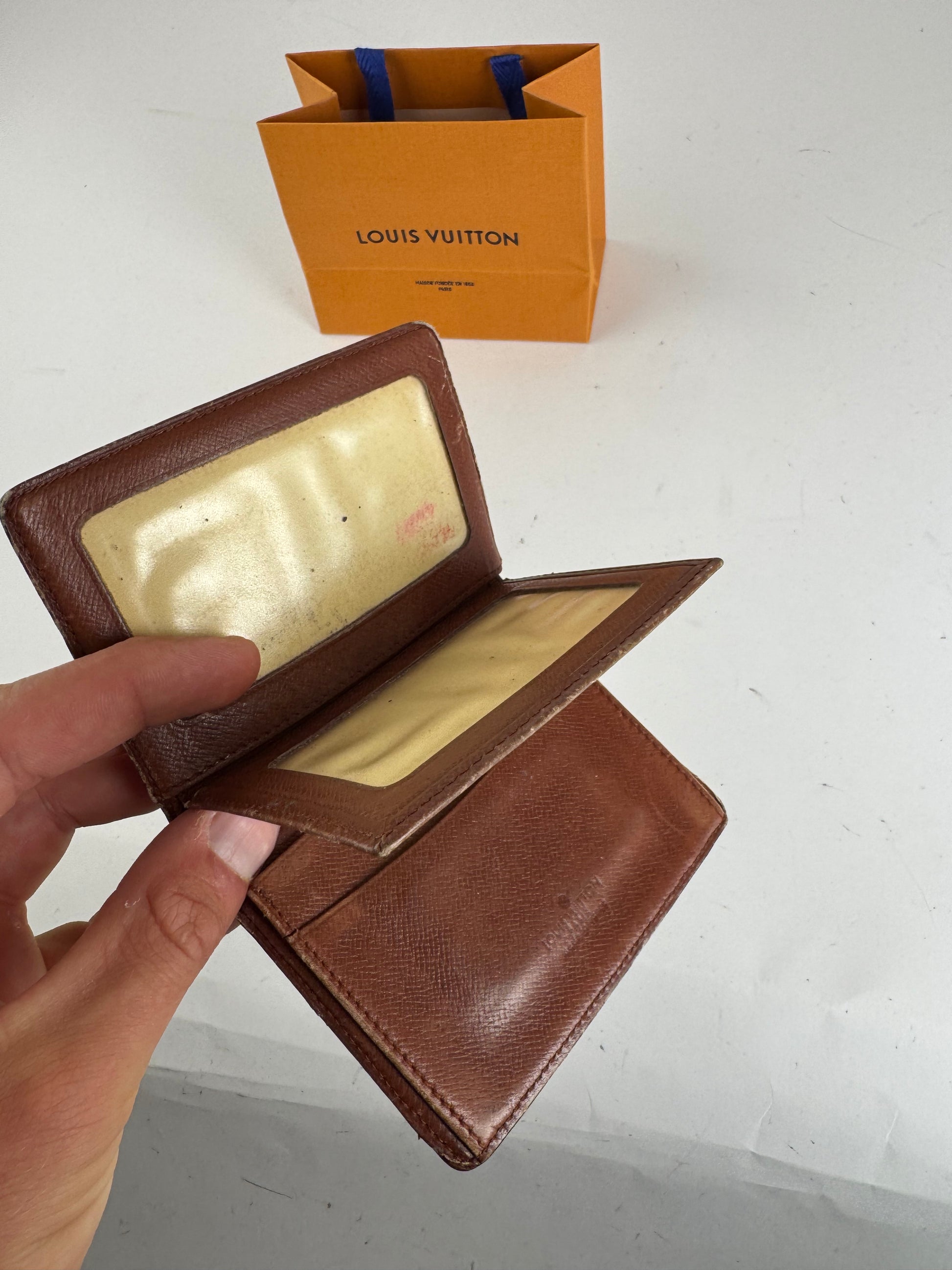 LOUIS VUITTON vintage card holder. This classic vintage cardholder is crafted of brown leather with khaki Louis Vuitton monogram print. The interior features two compartments made of transparent PVC. Made in France, this unisex piece comes with a Louis Vuitton shopping bag.
