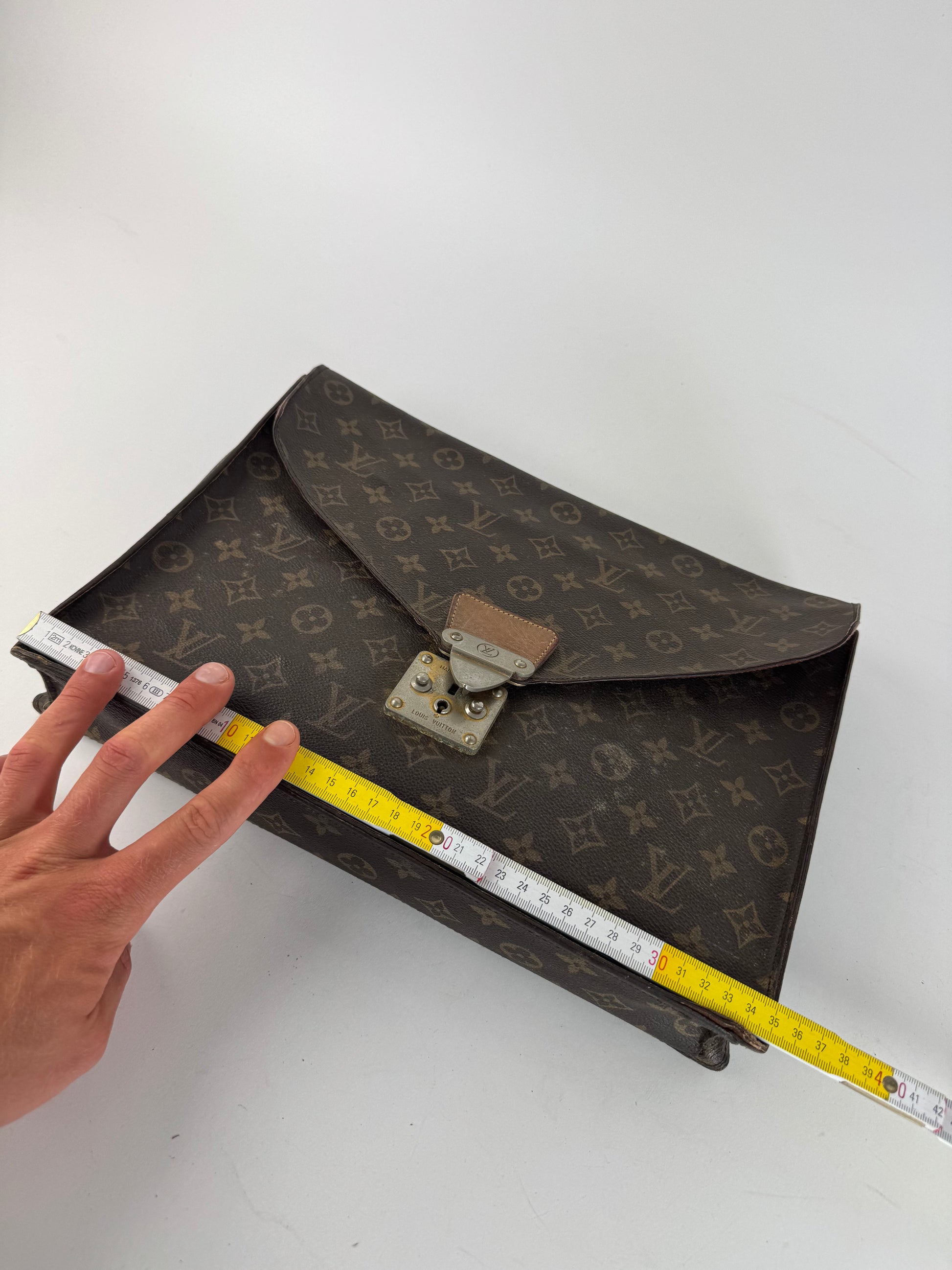 LOUIS VUITTON Monogram vintage clutch. This chic handbag is finely crafted of light brown leather featuring the classic Louis Vuitton monogram. The clutch features steel hardware with a gold-tone finish that has been dulled to a silver-like appearance. The flap opens to a brown leather interior.