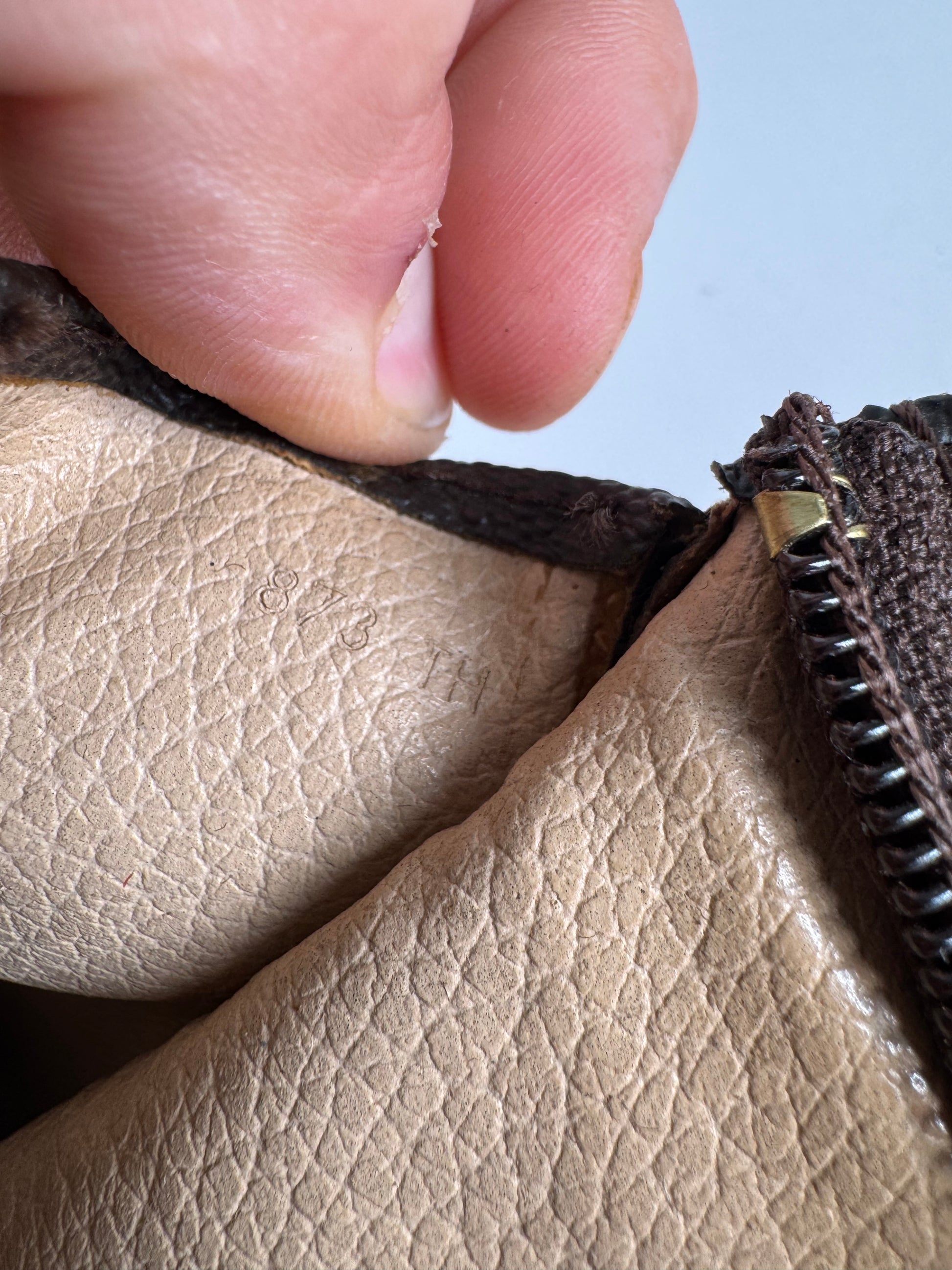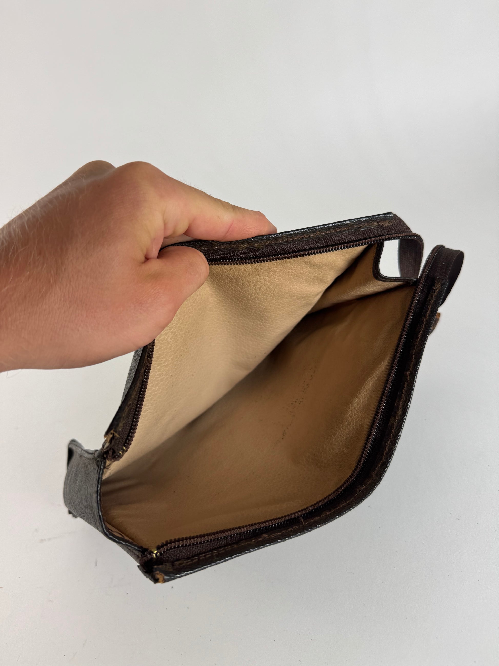 LOUIS VUITTON Monogram vintage clutch. This vintage clutch is finely crafted from classic Louis Vuitton monogram canvas in dark brown and khaki tones. The bag features a top zipper closure which has been replaced. The interior is lined with beige leather.