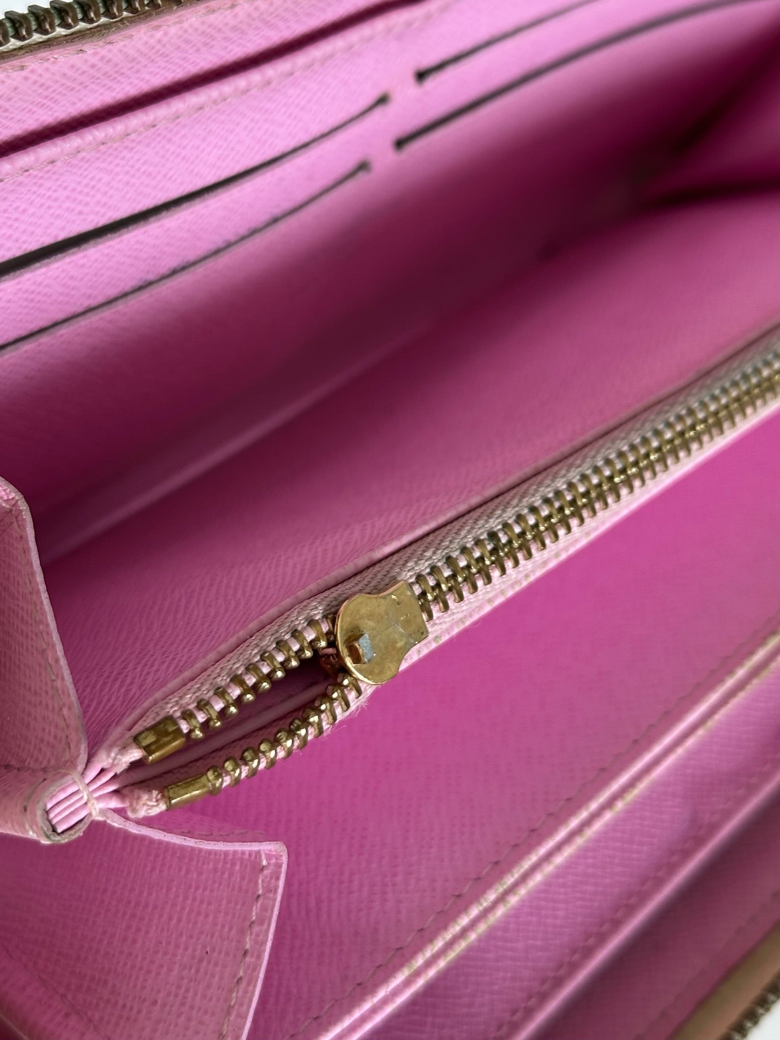 Condition Details: The wallet shows scuffing, light stains, and a missing interior zipper pull. The exterior zipper has been replaced. Despite these signs of use, the wallet remains in very good overall condition.