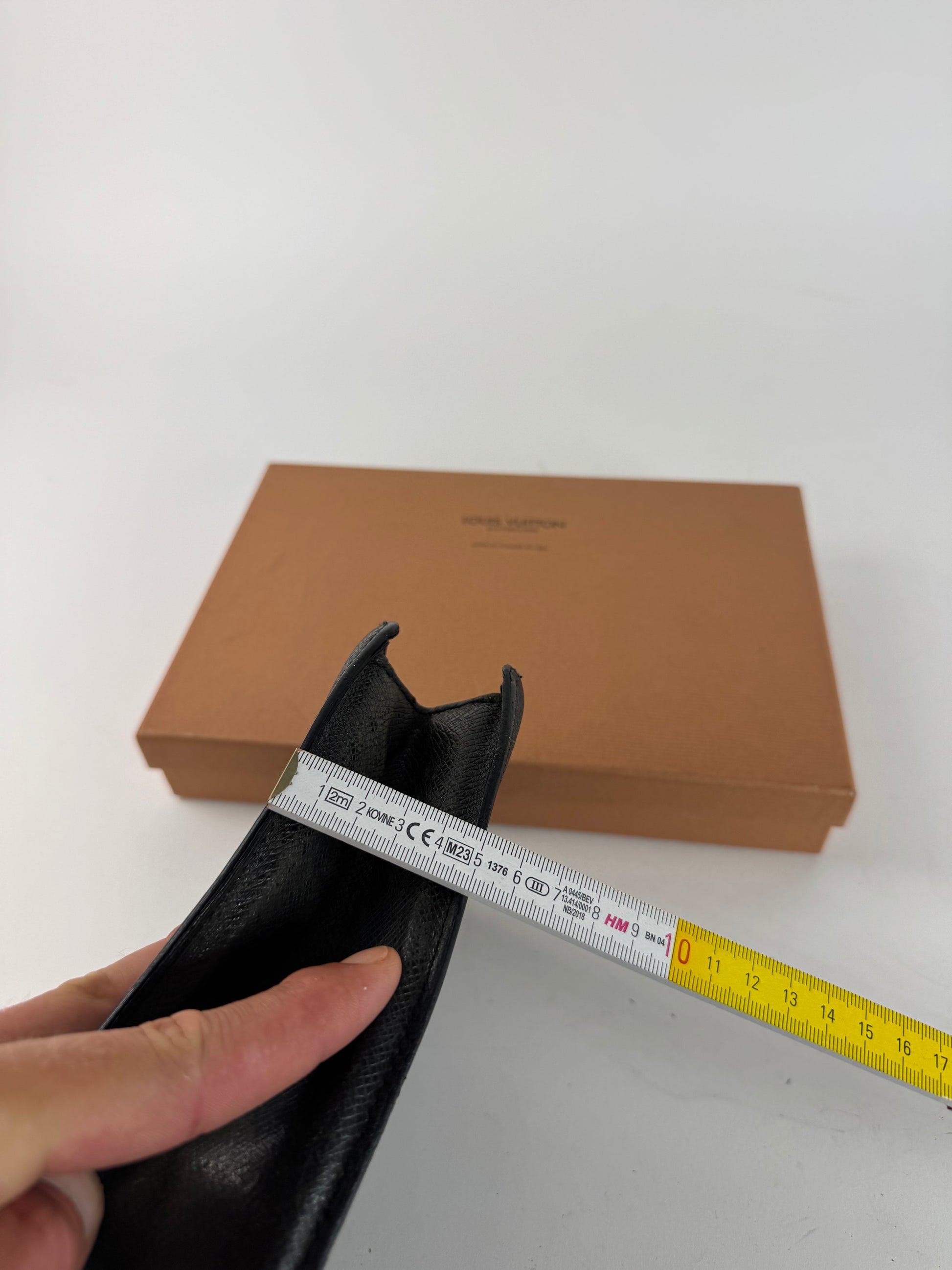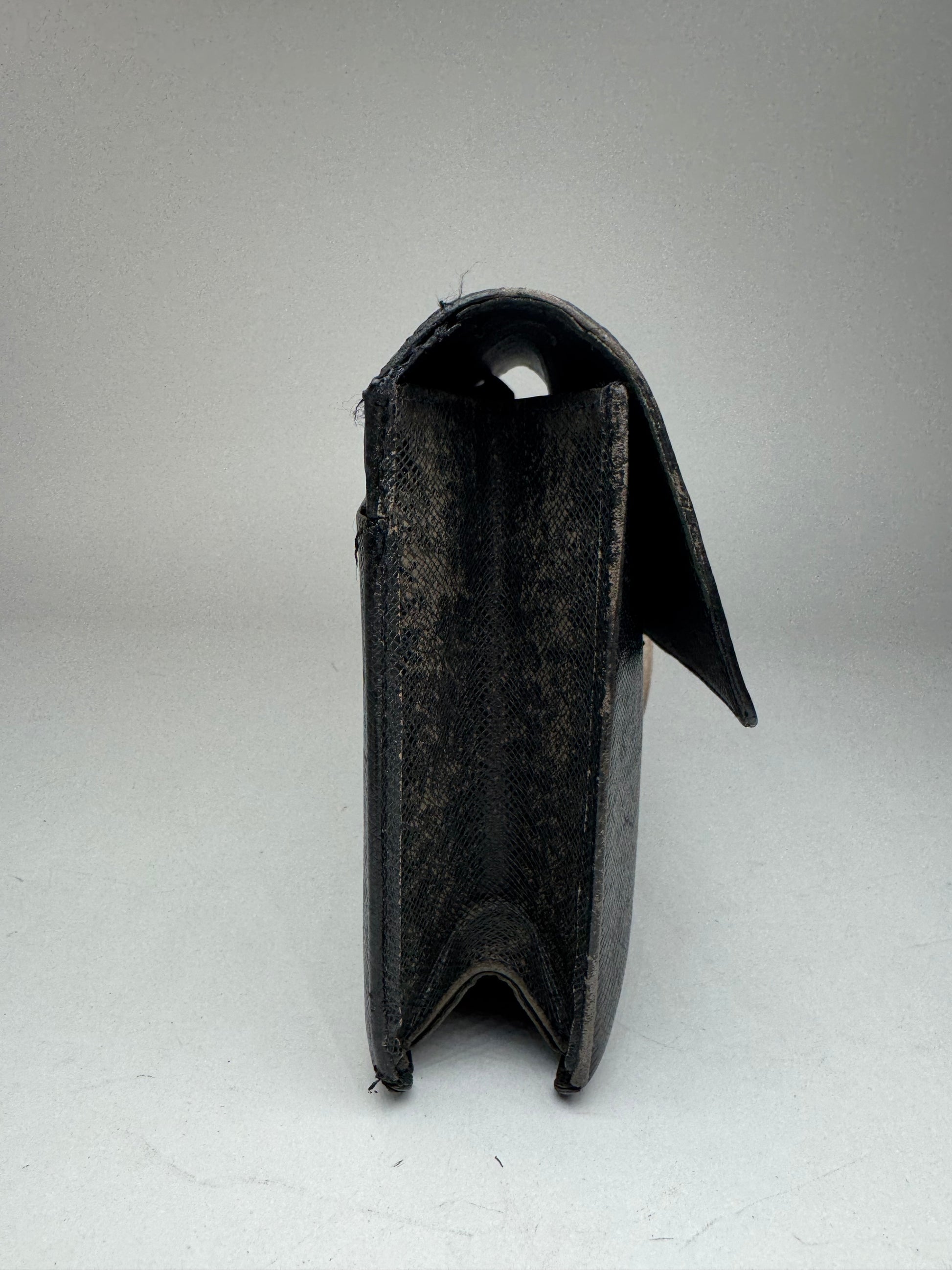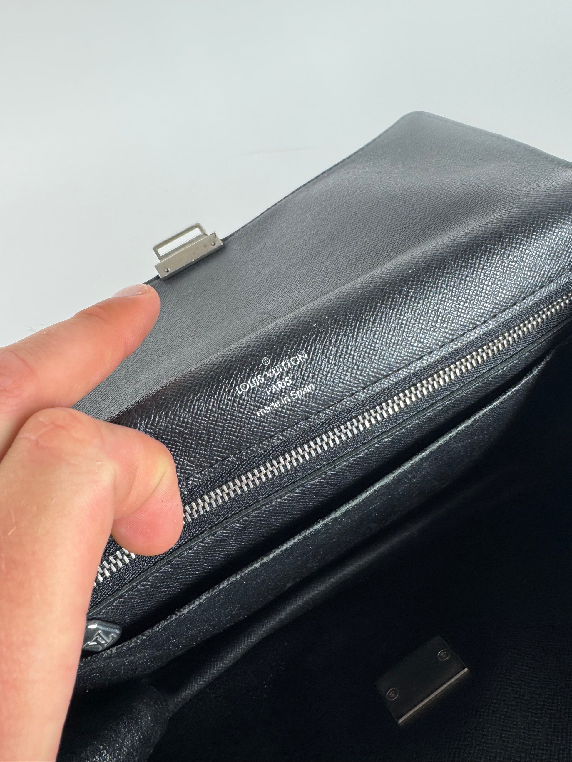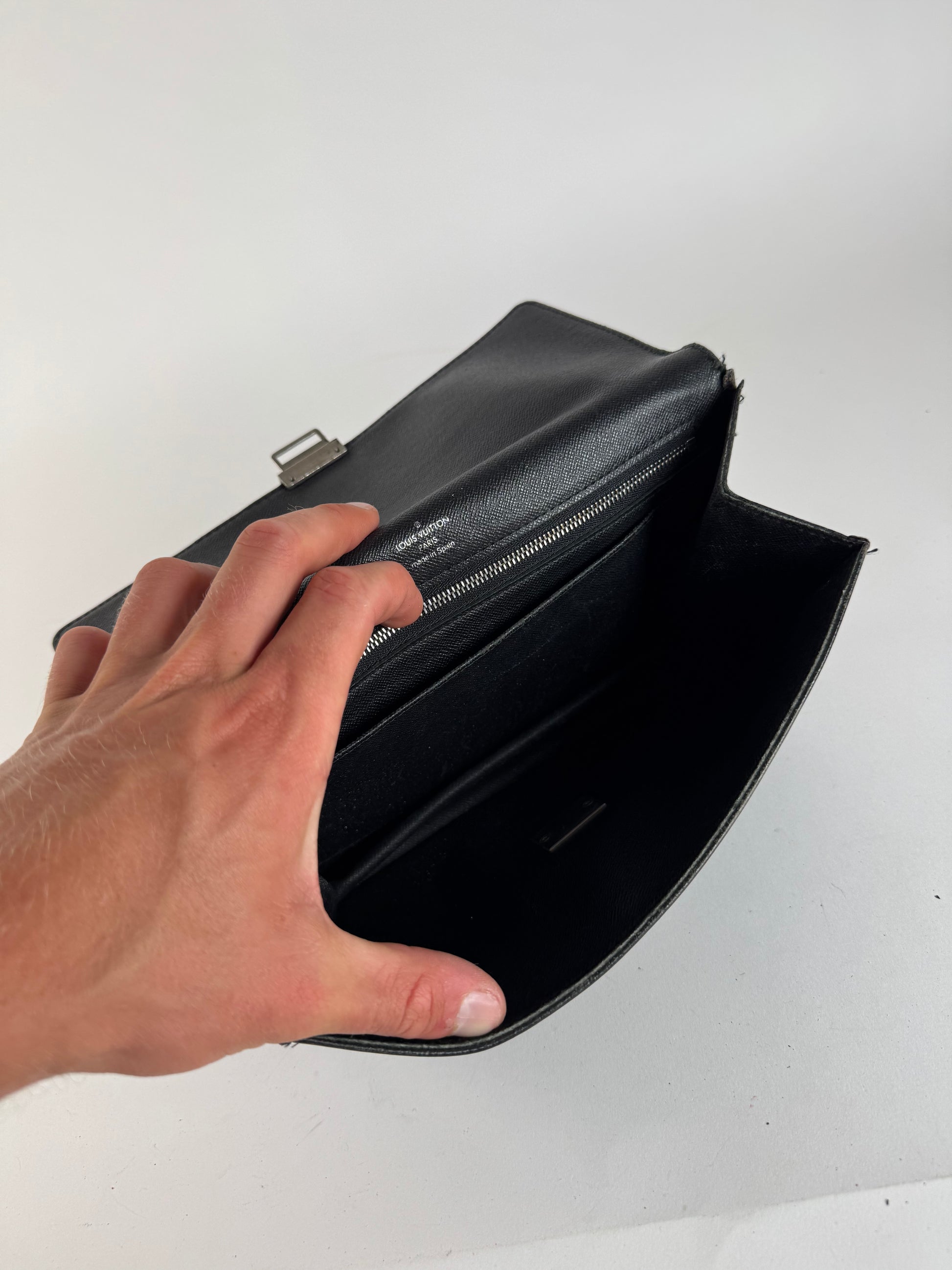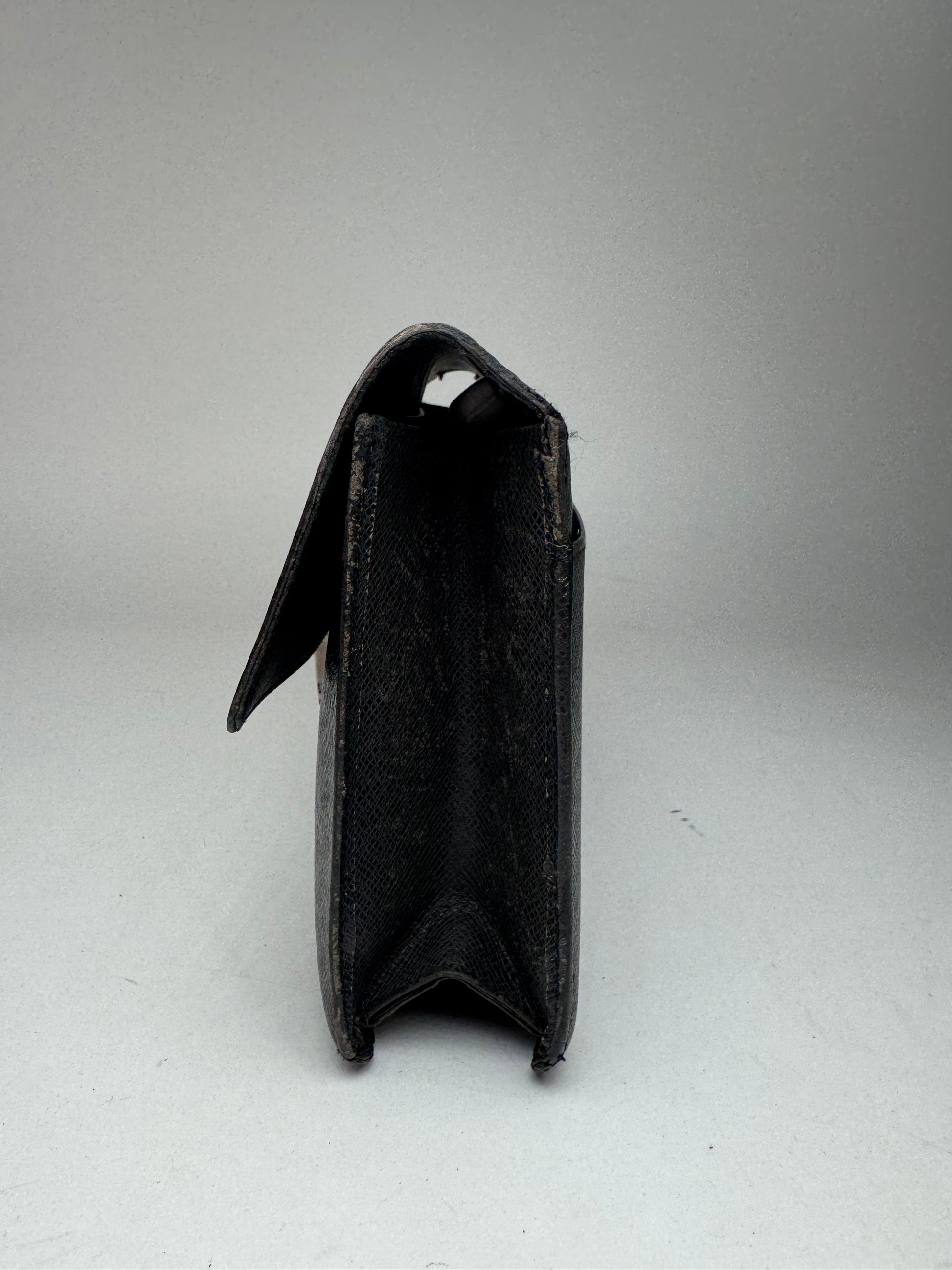 LOUIS VUITTON Taiga Vintage Clutch Cosmetic Pouch. This chic pouch is finely crafted of green-black Taiga leather, a distinctive Louis Vuitton material known for its cross-grain texture and durability.