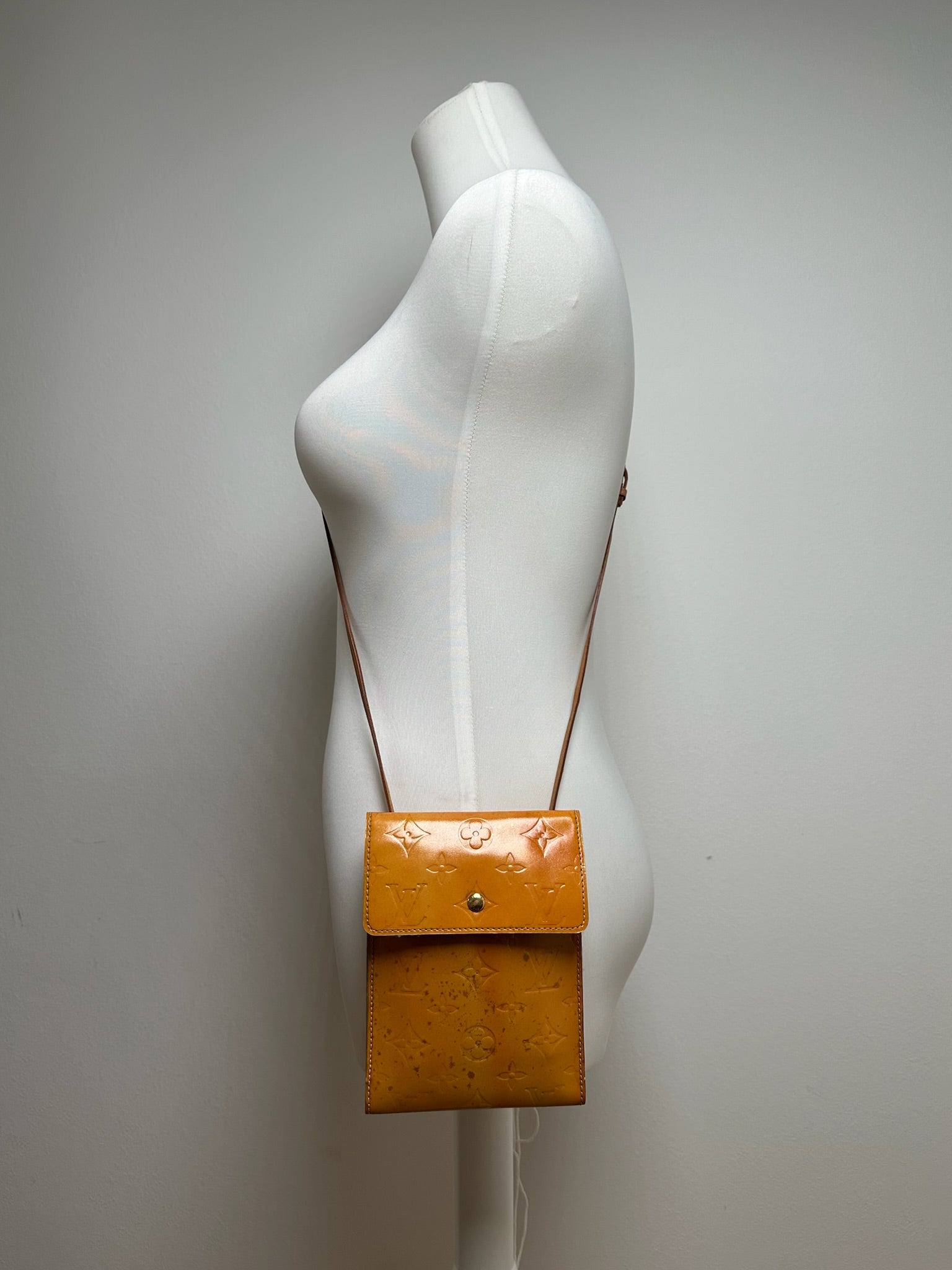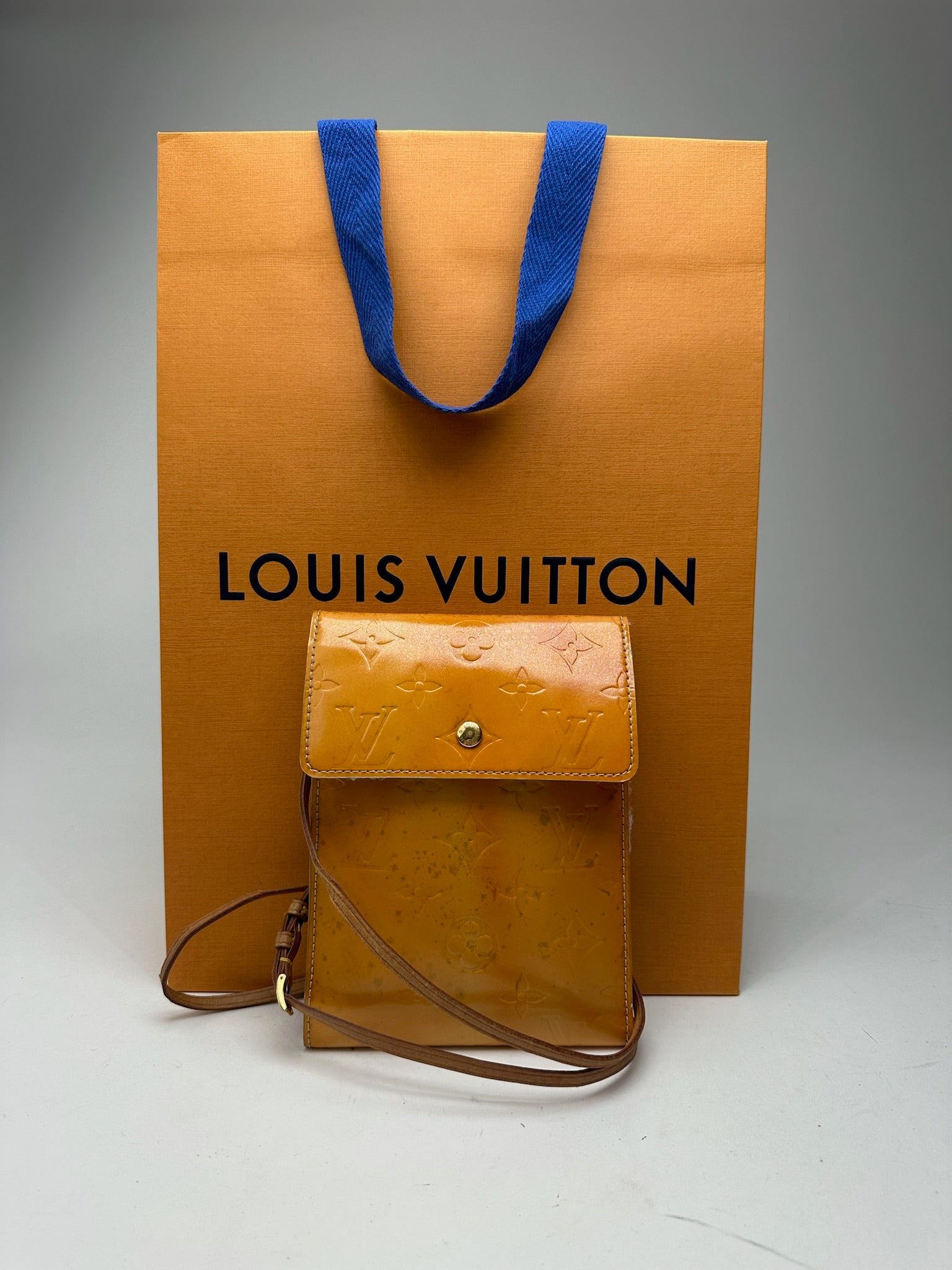 LOUIS VUITTON Vernis Leather Vintage Bag. This stylish shoulder bag is finely crafted of mango-colored Louis Vuitton Vernis leather — a glossy, patent-finished calfskin known for its luxurious shine and embossed monogram pattern. The bag features gold-tone steel hardware and an adjustable strap with matching gold fittings. Made in Spain.
