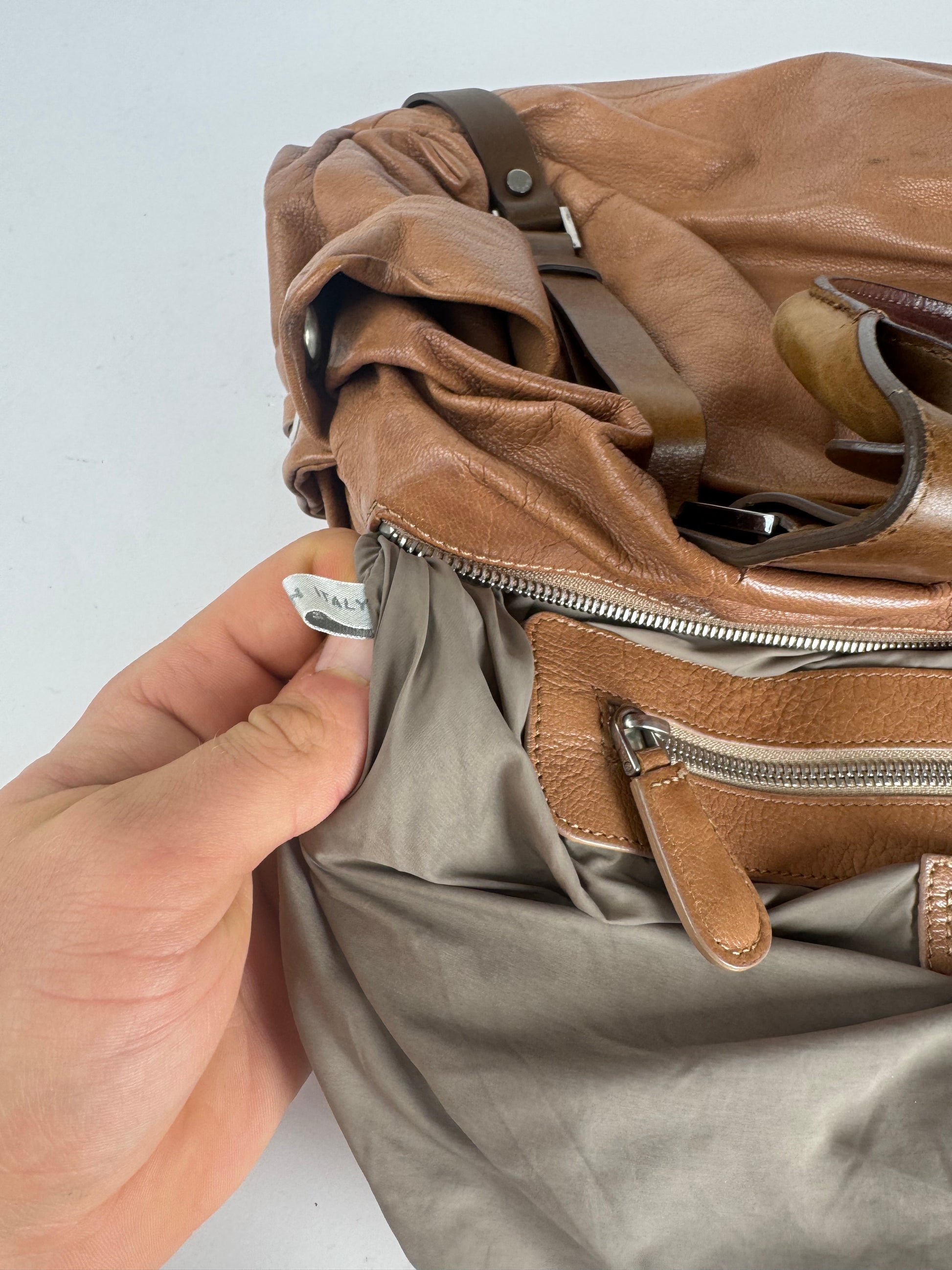 This vintage 2-way handbag is finely crafted from brown leather, featuring both two handles and a detachable shoulder strap for versatile wear. The silver-tone stainless steel hardware adds a modern touch, while the gray-brown canvas interior provides a stylish contrast. Made in Italy, this elegant piece comes with a Marni dust bag. Despite normal signs of use, the overall condition remains very good.