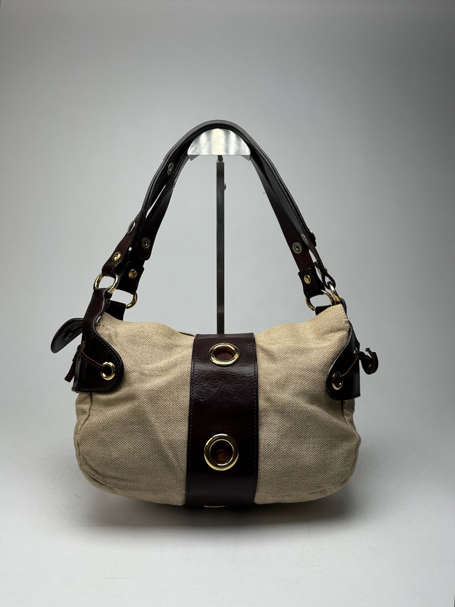 MARNI Vintage Canvas and Leather Handbag. This chic handbag is finely crafted of beige canvas with brown leather accents. The bag features two adjustable handles for hand, shoulder, or crossbody wear, and gold-tone steel hardware.