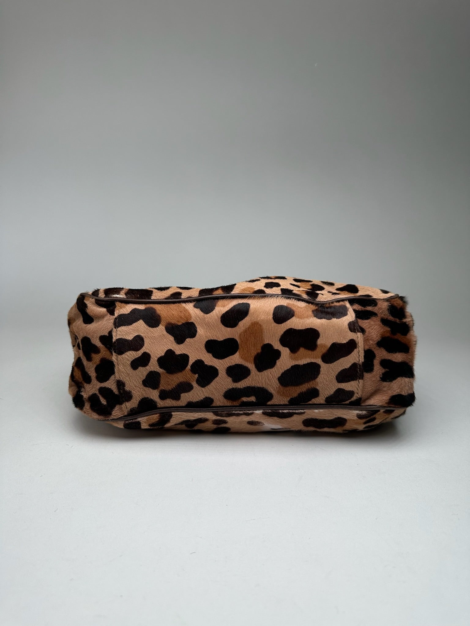 Marni Vintage 2-Way Leopard Print Bag. This chic handbag is finely crafted from brown leopard-print fur. The shoulder bag features dual top handles, an optional detachable shoulder strap, and a flap closure. The flap opens to a spacious interior lined in grey-brown canvas.