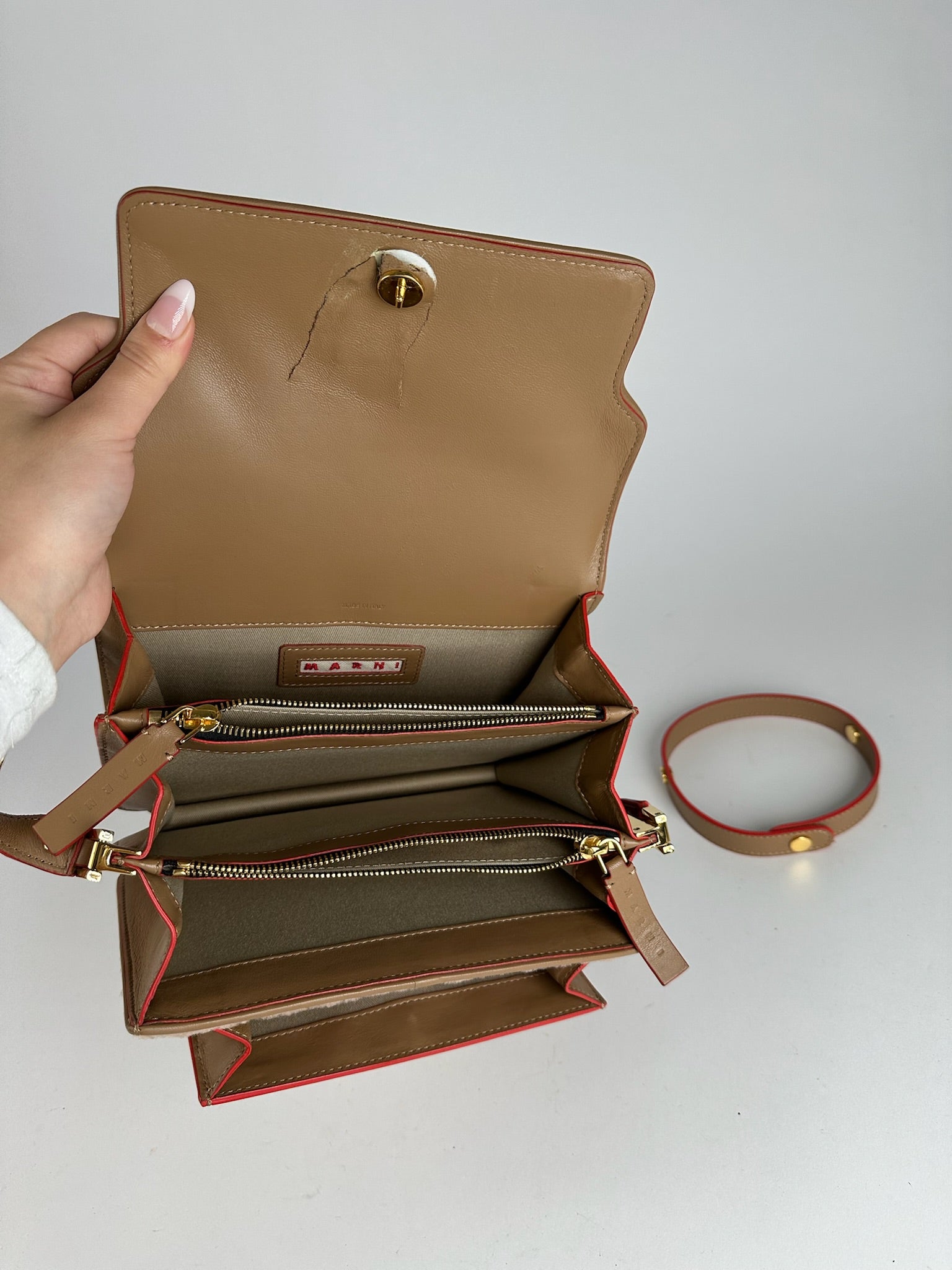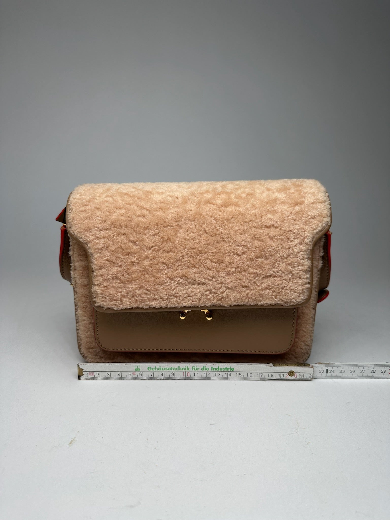 This chic handbag, model Trunk , is crafted from beige and brown wool material with a textured, shearling-like finish. It features brown leather accents and a gold-toned magnetic closure. The adjustable strap allows it to be worn as a shoulder bag or carried by hand. Made in Italy.