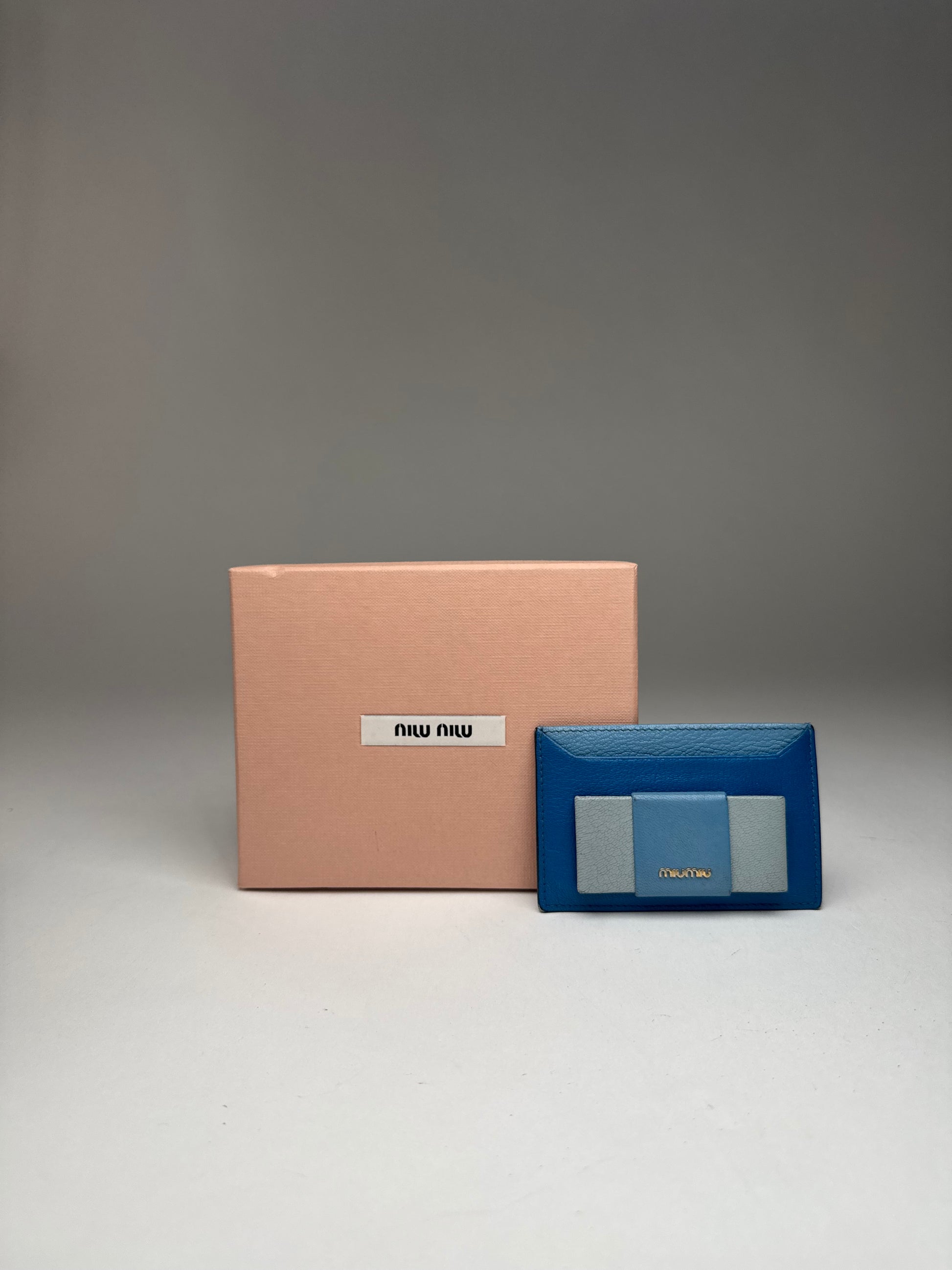 This stylish vintage card holder by Miu Miu is finely crafted from blue, light blue, and gray leather with gold-tone steel hardware in the shape of a bow. A chic and functional unisex accessory.
