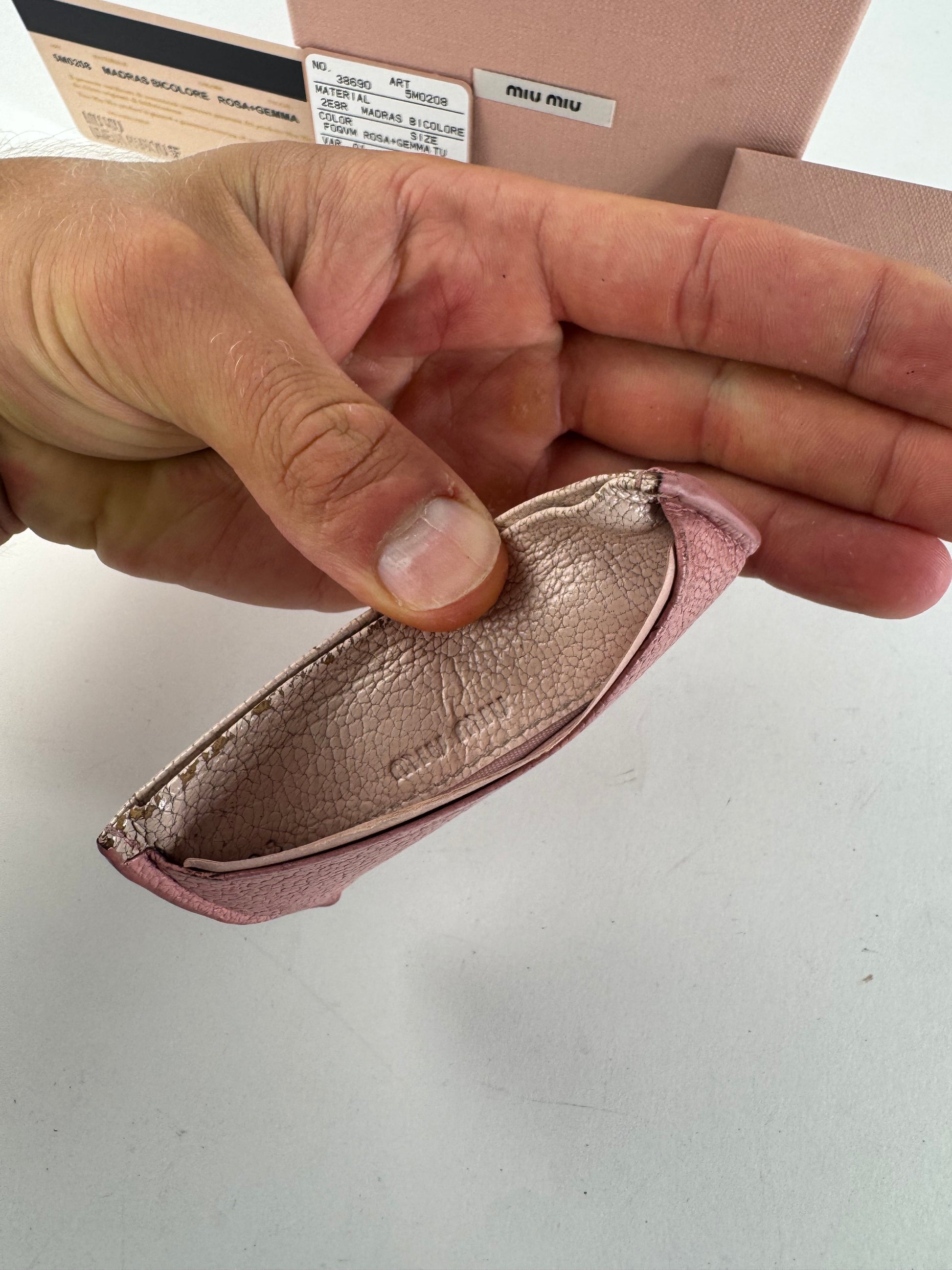 This charming cardholder is finely crafted of pink and rose-toned leather and features a striped leather appliqué on the front. The gold-tone steel Miu Miu logo adds a signature touch. The compact design is unisex and ideal for everyday use.