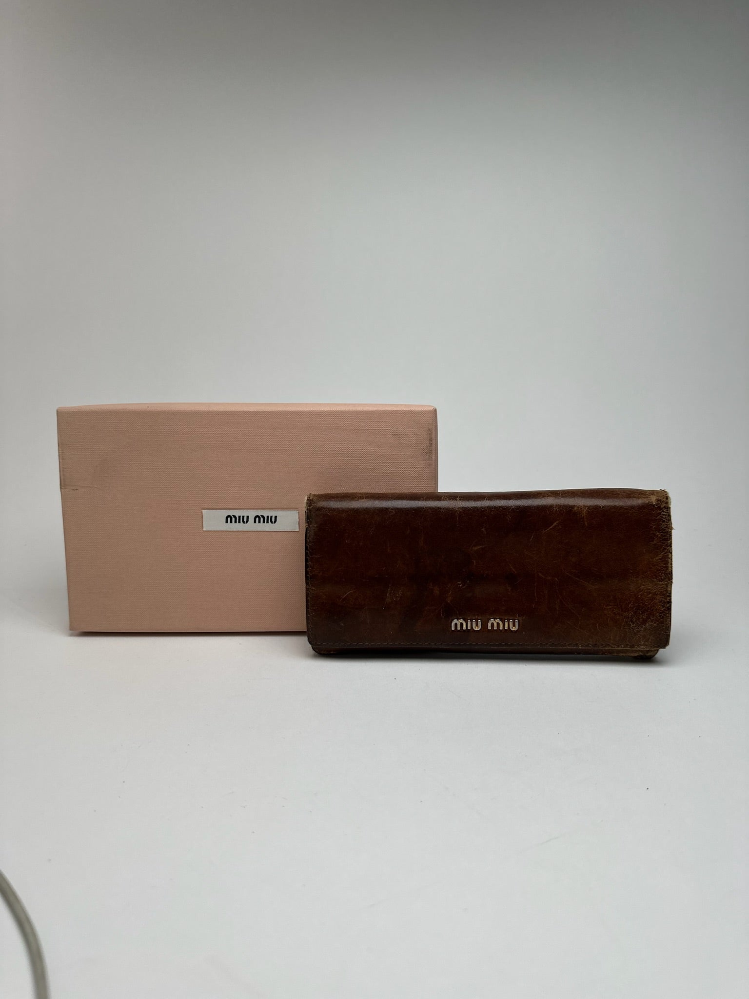 This vintage wallet is finely crafted of brown leather with brown canvas trimming and features snap button closures. The iconic Miu Miu logo in gold-tone steel is displayed on the front.
