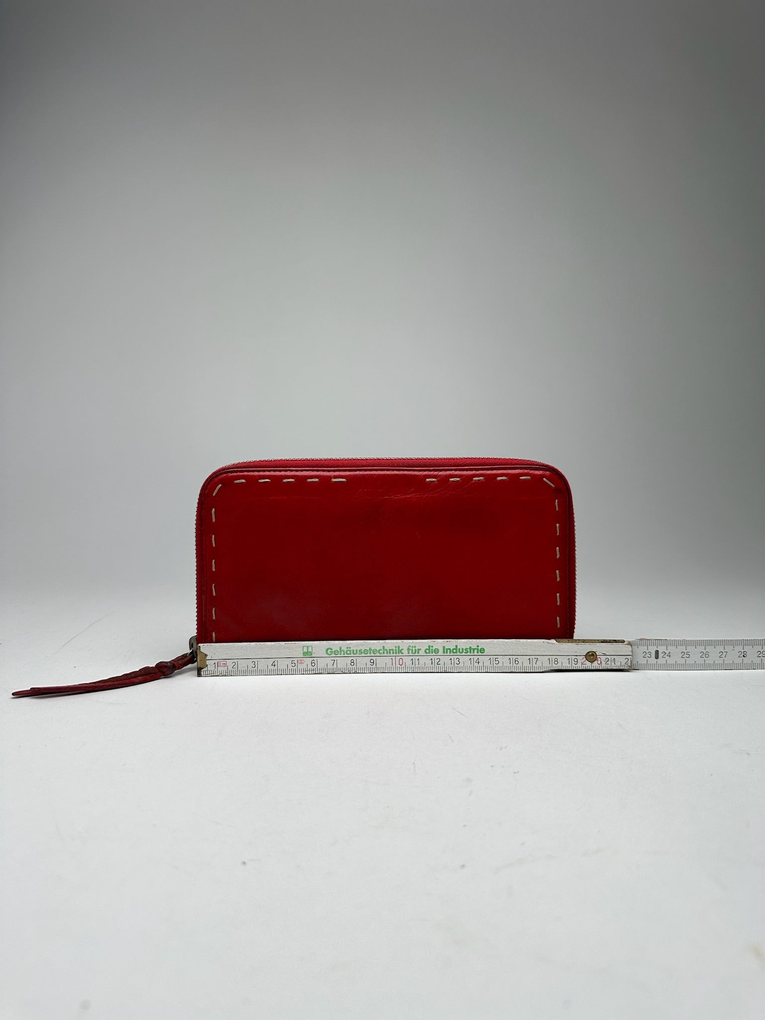 MIU MIU Leather Wallet. This stylish wallet is finely crafted of red leather with white contrast stitching. The wallet features a silver-tone metal zipper with a dove-shaped pull. The interior is lined with matching red leather.