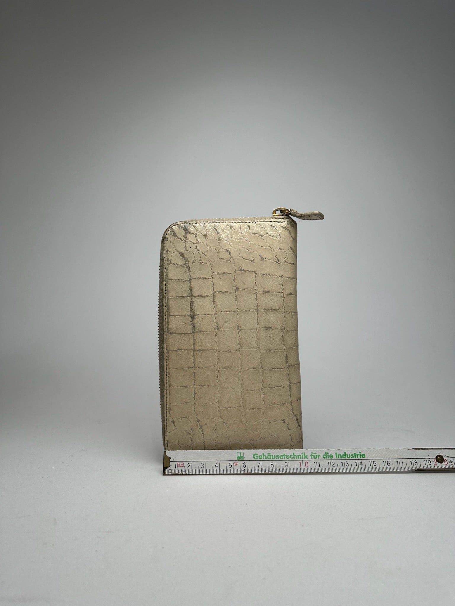Miu MIu Vintage Croc-Embossed Leather Wallet. This chic wallet is finely crafted of white croc-embossed leather. It features gold-tone steel hardware and a top zipper closure. The interior is lined with white leather.