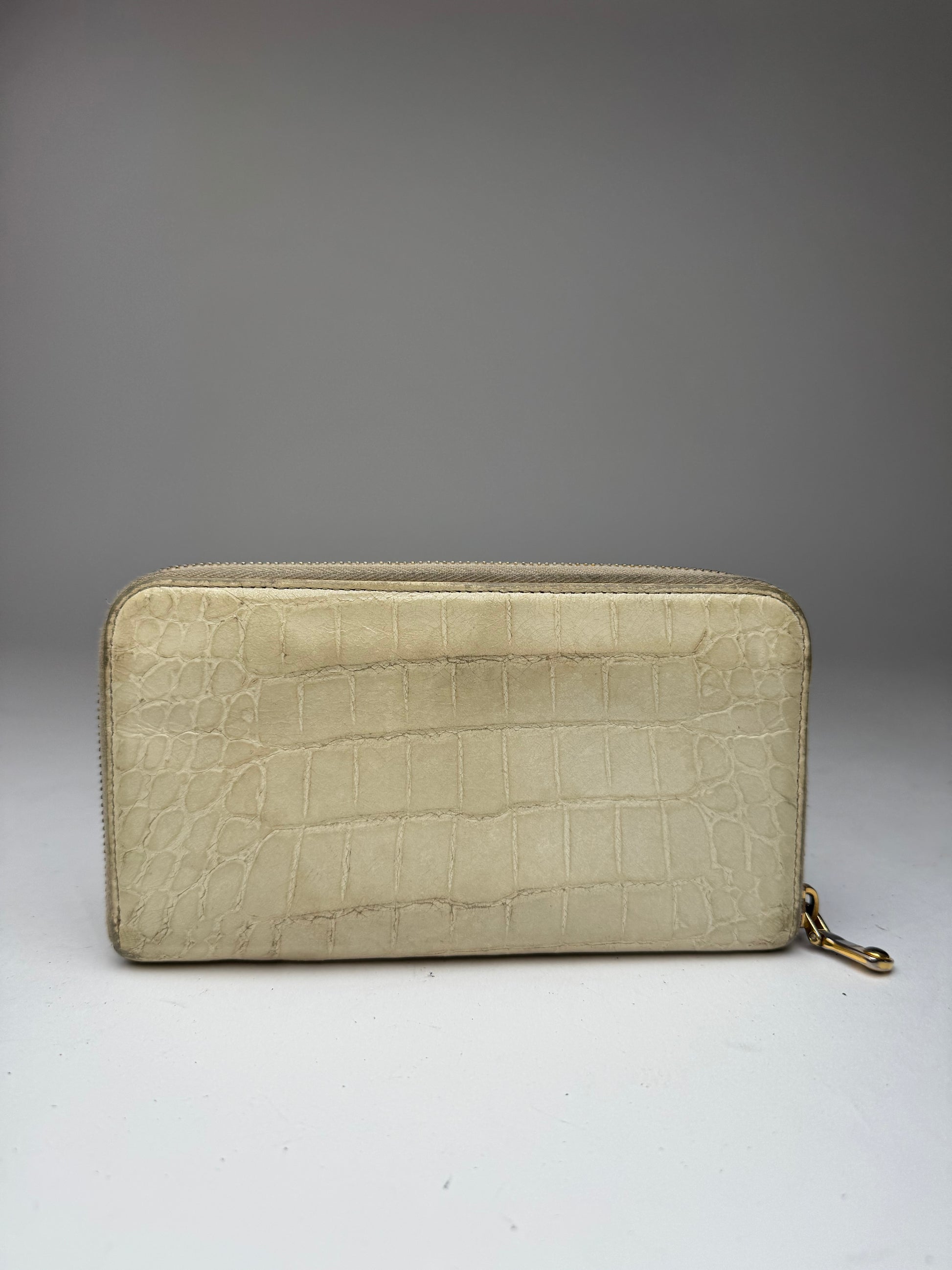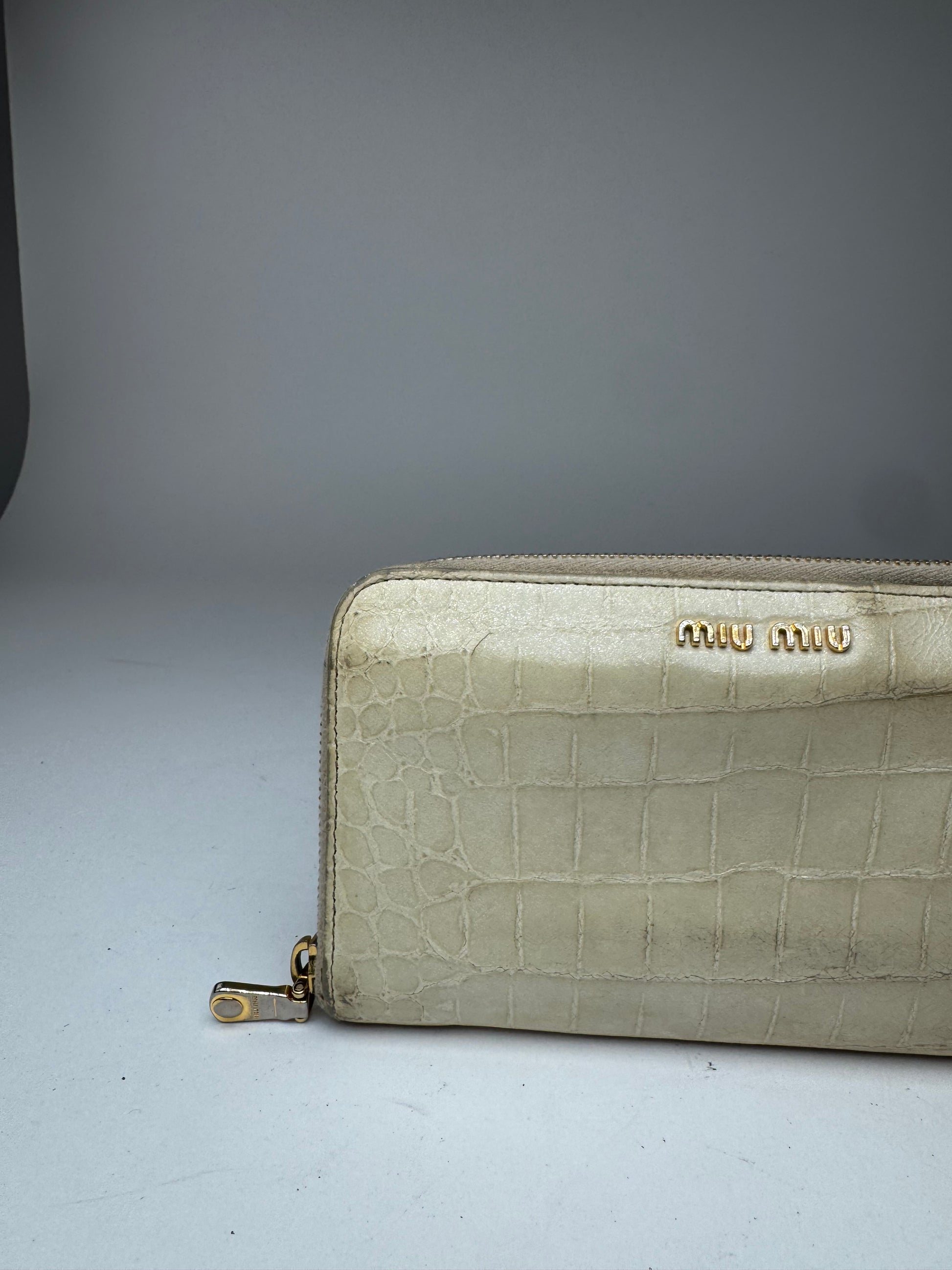 MIU MIU Snake Embossed Leather Wallet. This elegant wallet is finely crafted of white leather with a snakeskin-embossed finish. The front features a gold-tone steel Miu Miu logo and a top zipper closure. The interior is lined with matching white leather.