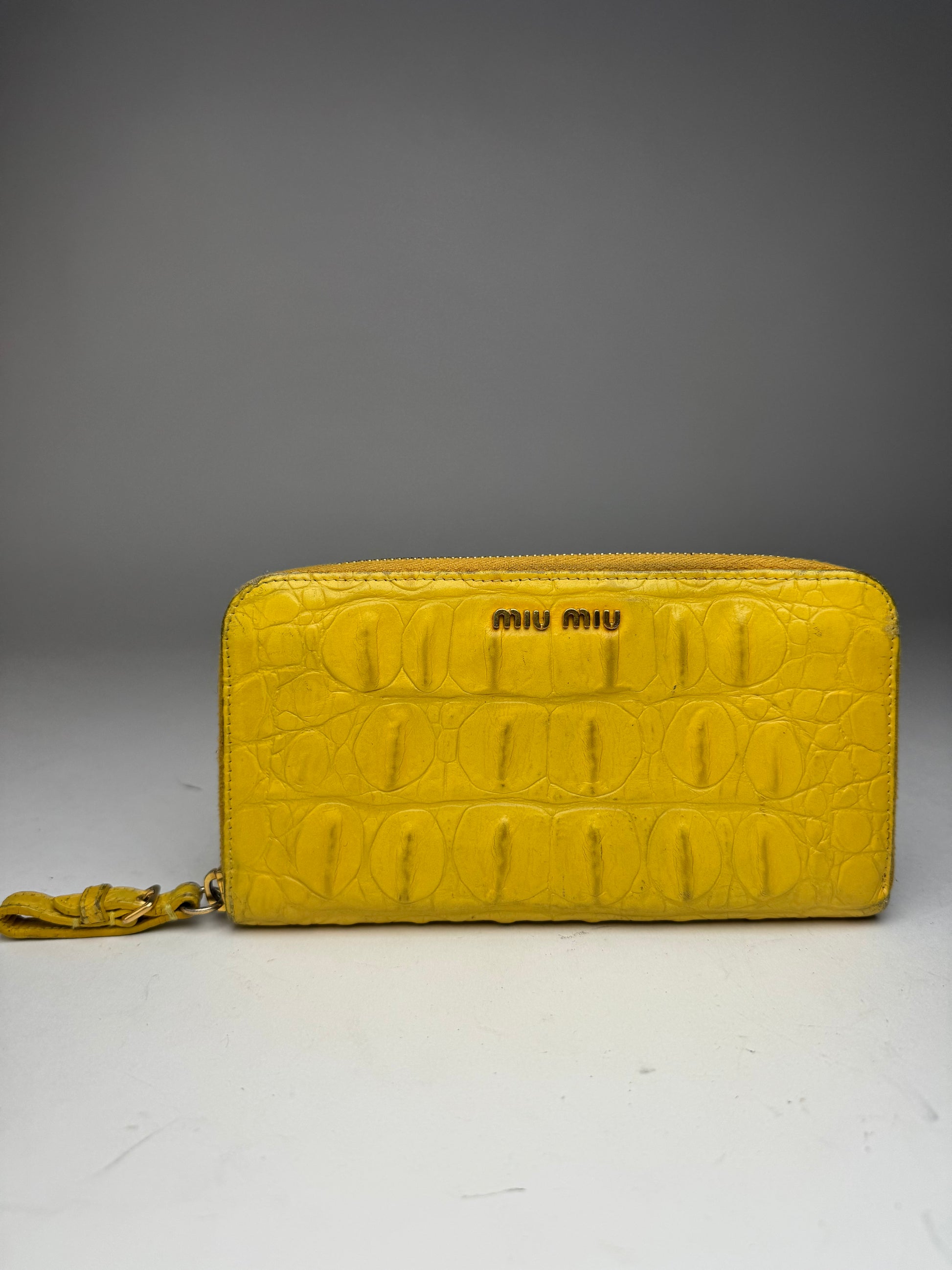 This elegant vintage wallet is finely crafted of yellow croc-embossed leather. The wallet features a polished gold-tone MIU MIU logo on the front and a gold-tone zipper closure along the top. The interior is lined with leather and includes multiple compartments for bills, cards, and coins.