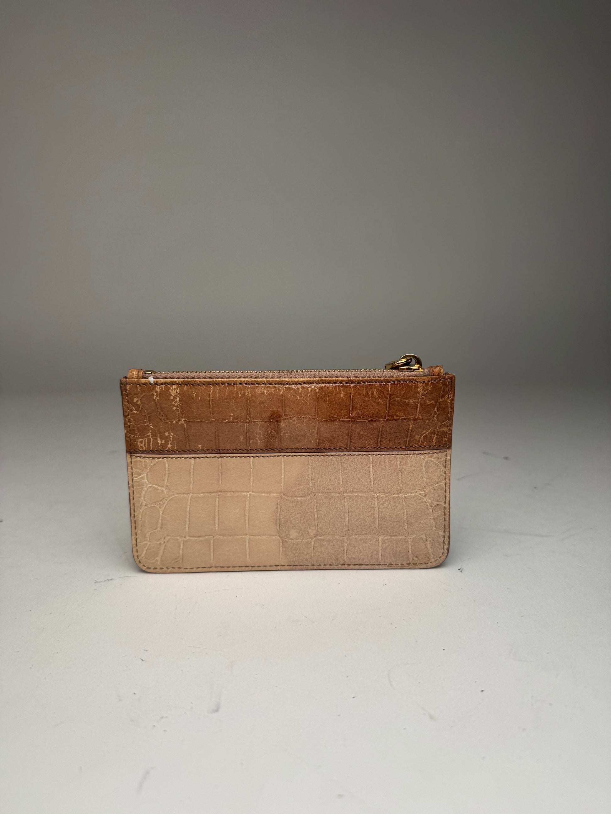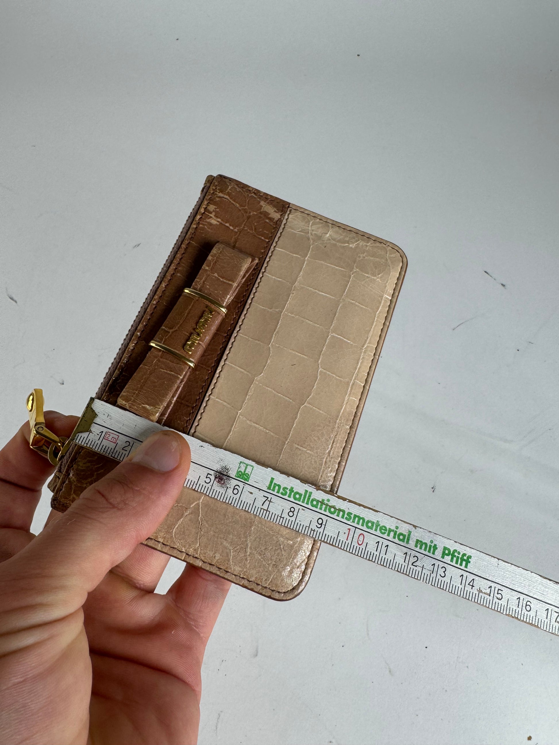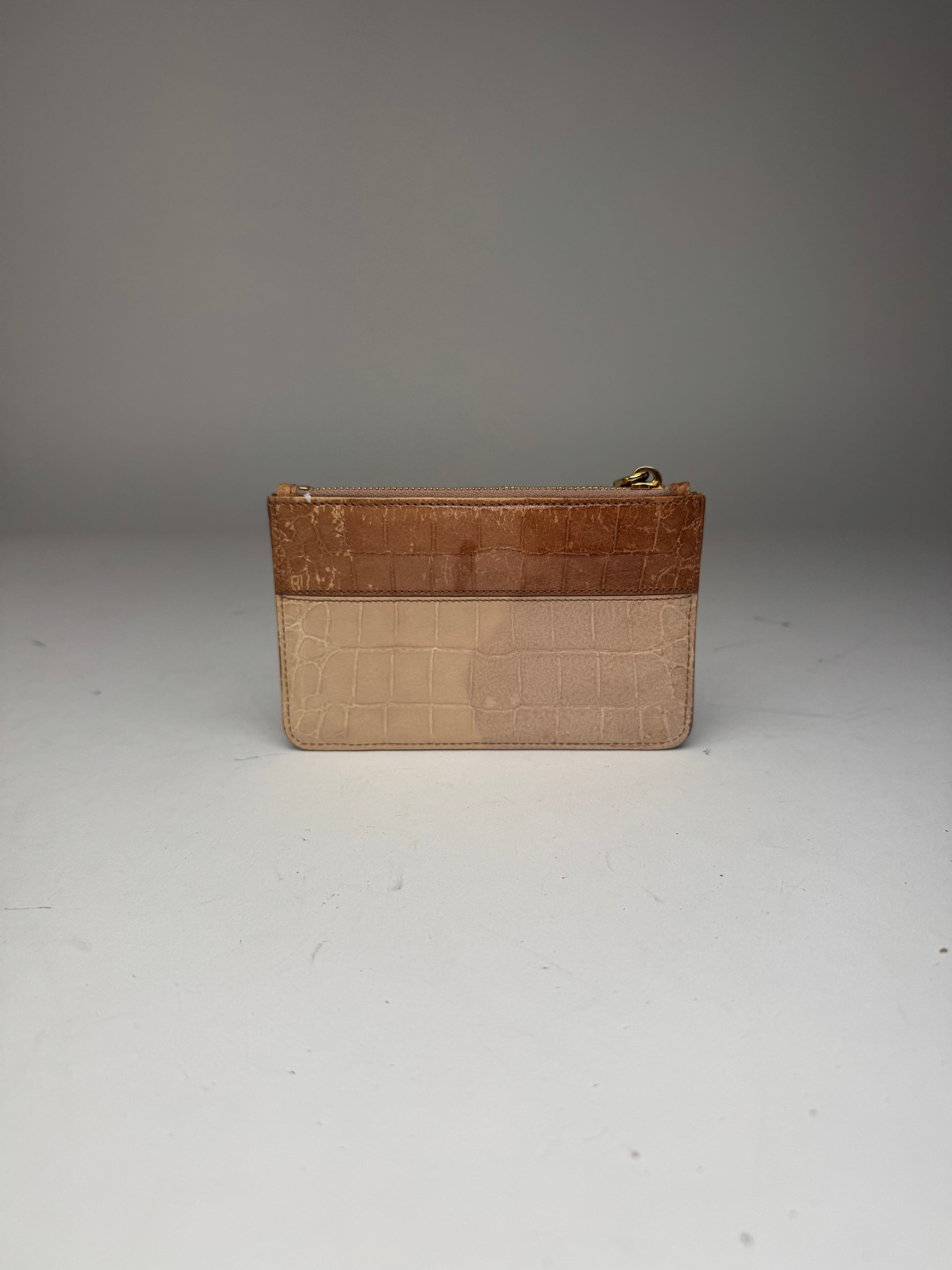 MIU MIU vintage cardholder. This elegant cardholder is finely crafted of beige and brown crocodile-embossed patent leather. The piece features a brown bow appliqué with a gold-tone steel Miu Miu logo on the front and a top zipper closure. The interior is lined in pink leather.