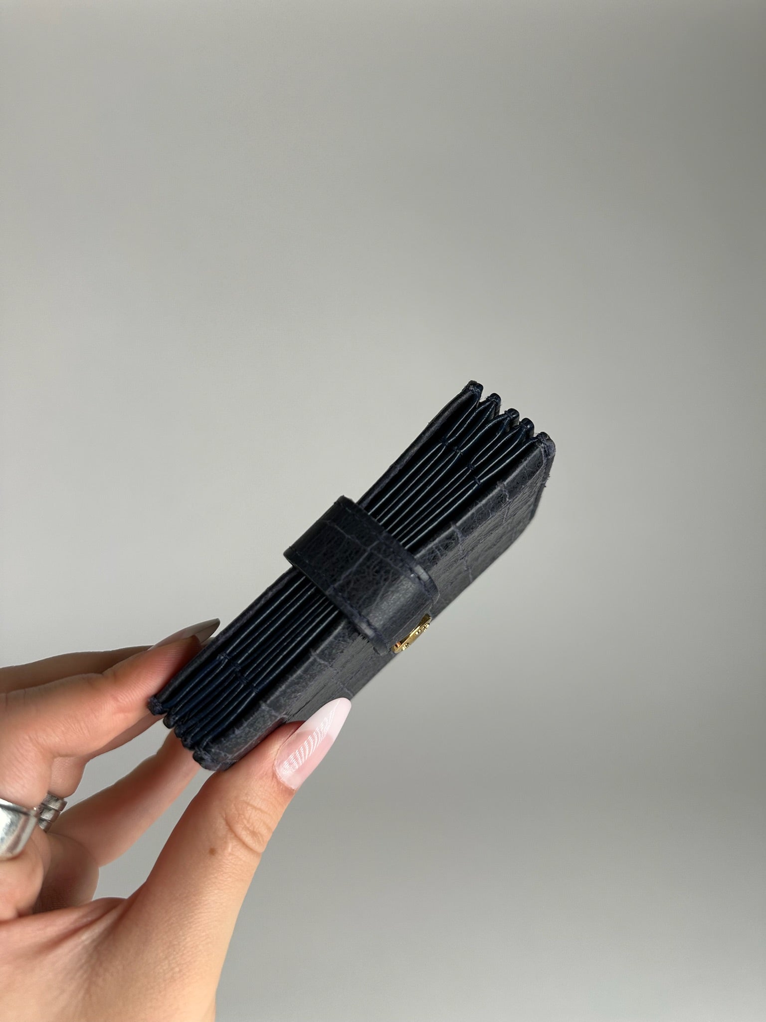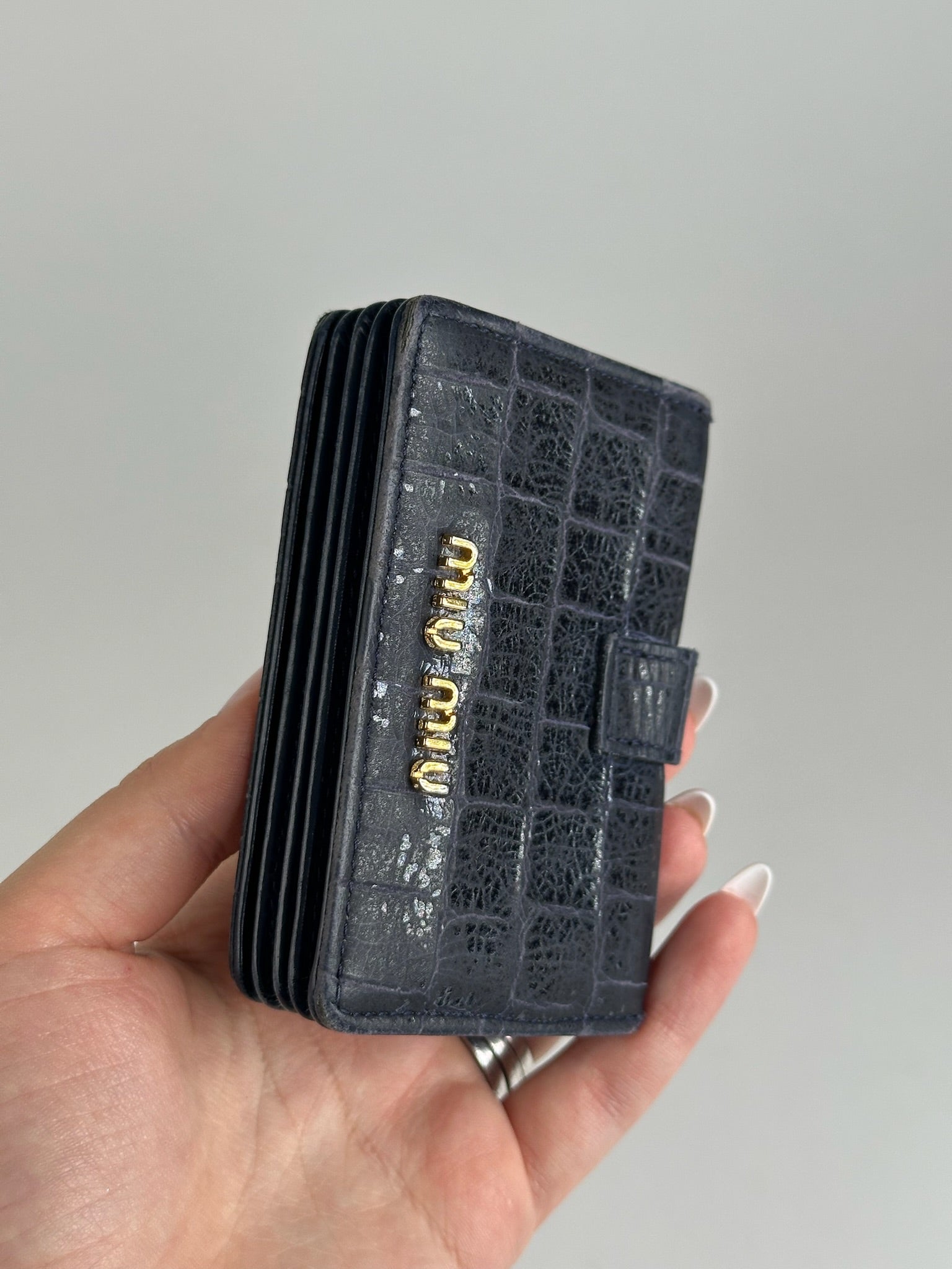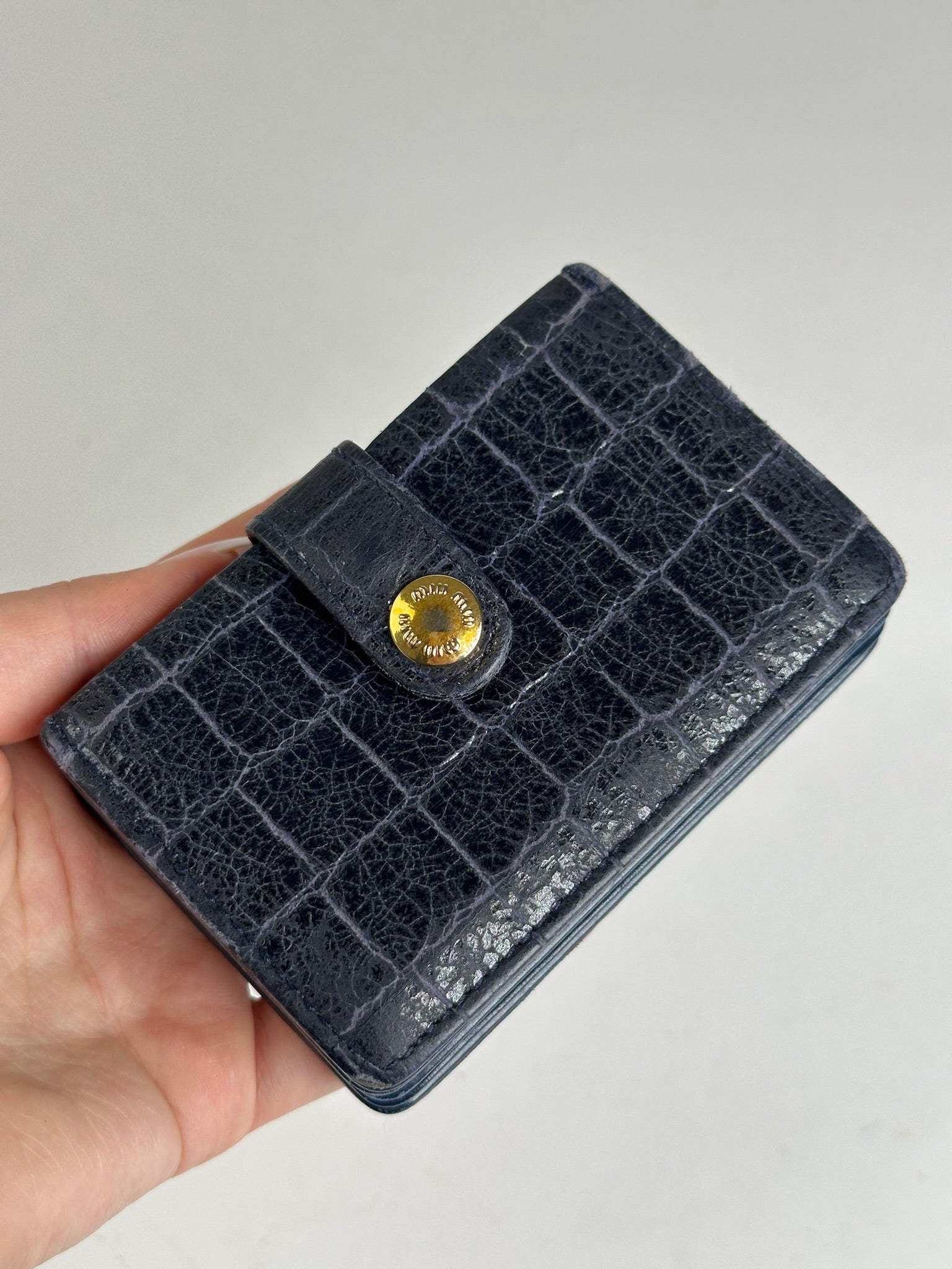 This elegant vintage card holder is finely crafted from navy blue croc-embossed patent leather. It features five compartments for organized storage and is accented with gold-toned hardware. The card holder is unisex and comes with its original Miu Miu box and an authenticity card.
