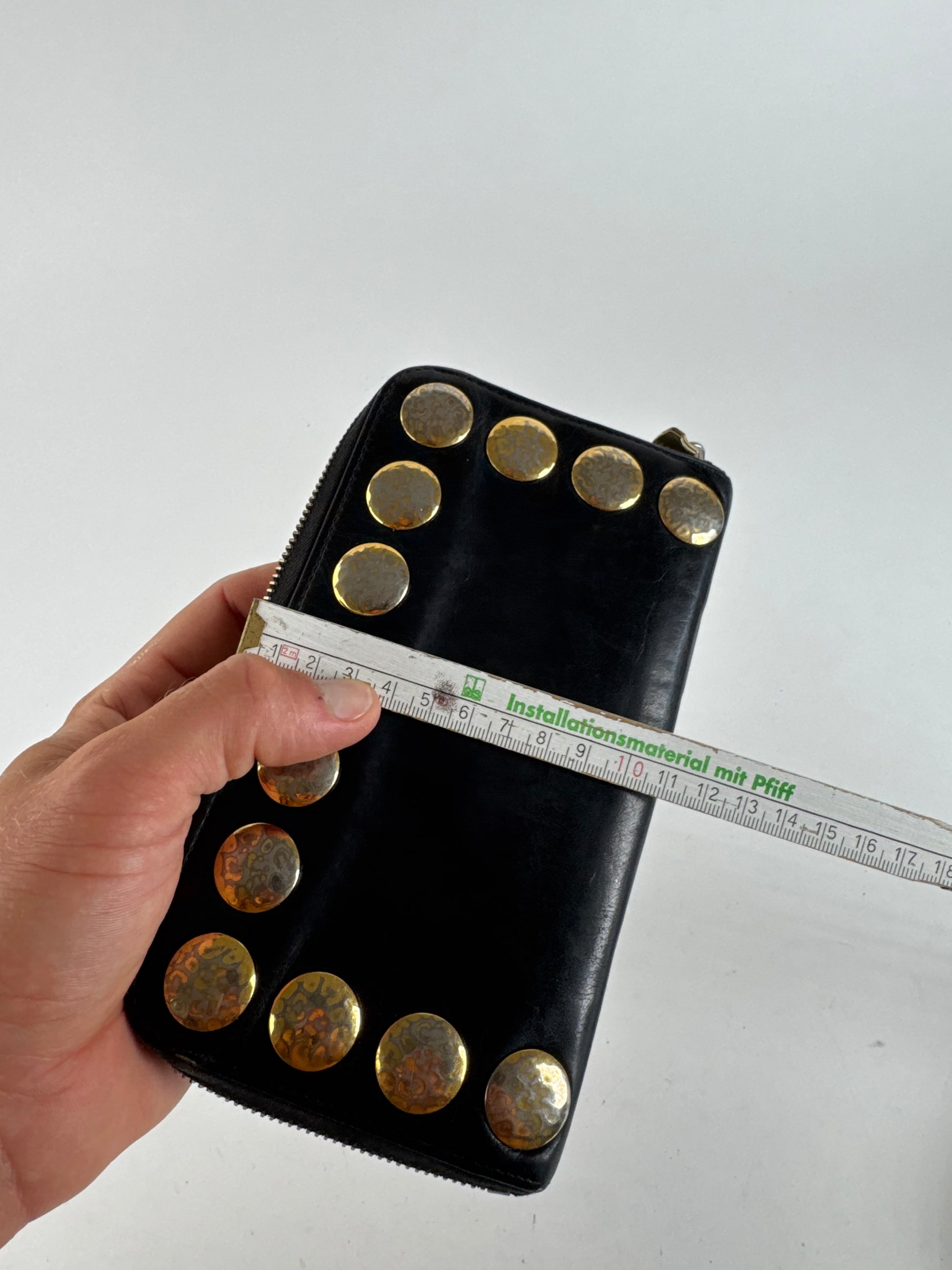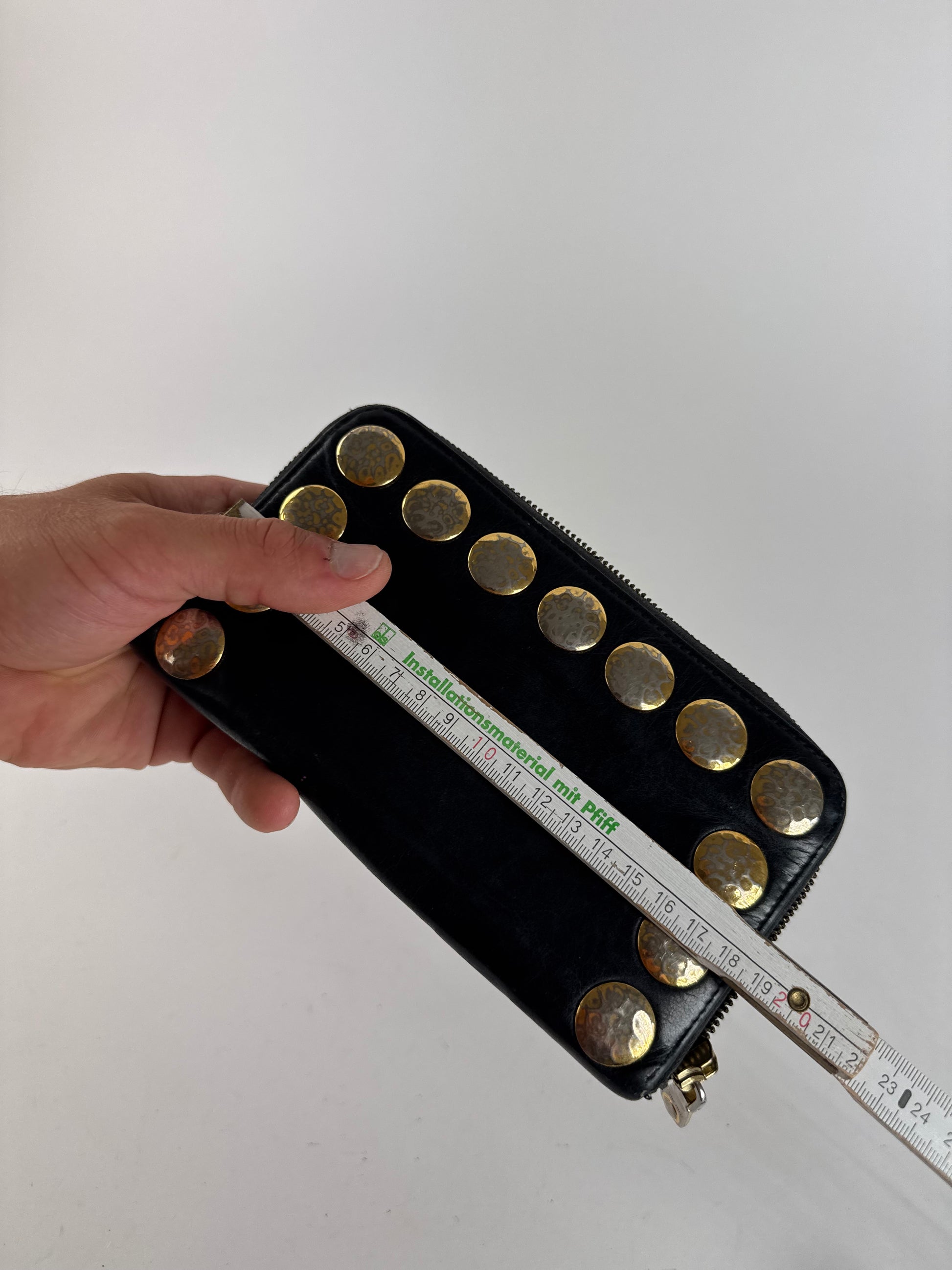 This edgy vintage wallet is crafted from black leather and features bold gold-tone steel hardware, including large signature studs across the back. A striking blend of elegance and attitude, it embodies Miu Miu's distinctive aesthetic.