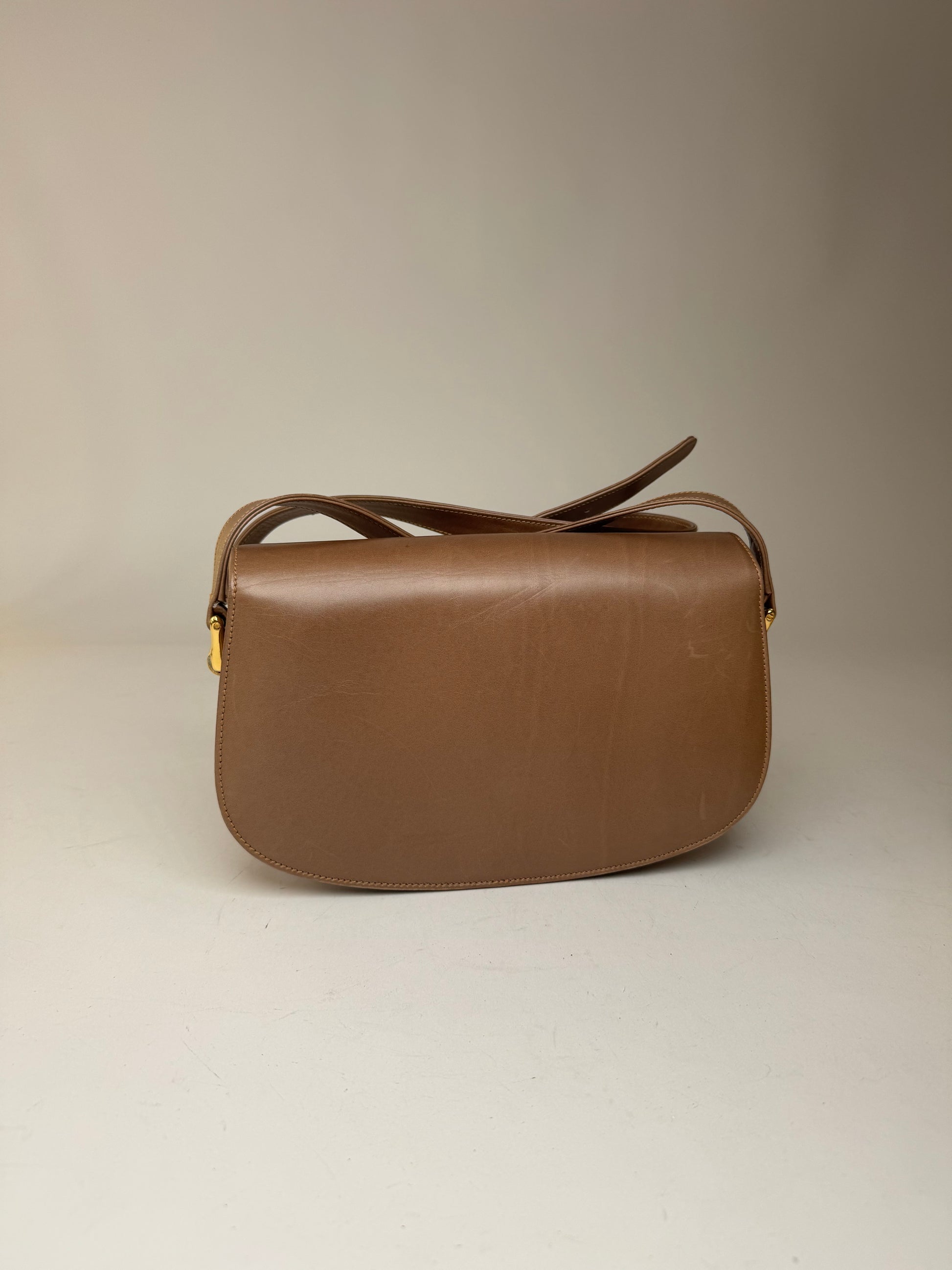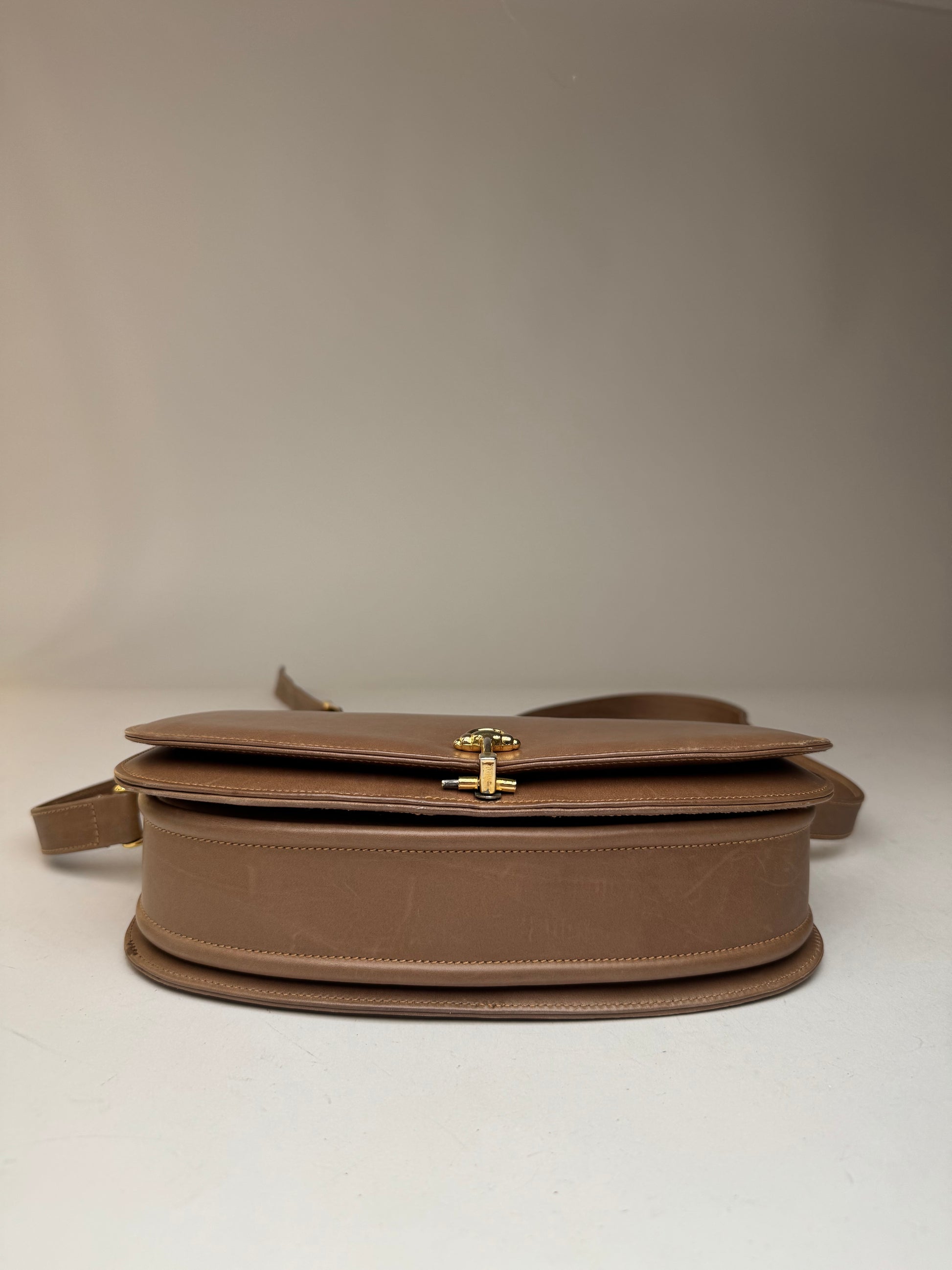 GUCCI Vintage Paolo Gucci Shoulder Bag. This chic handbag is finely crafted from brown leather. The shoulder bag features a leather handle, an optional adjustable shoulder strap, and a V-shaped front flap with a polished gold-toned steel lock. The flap opens to a spacious interior.