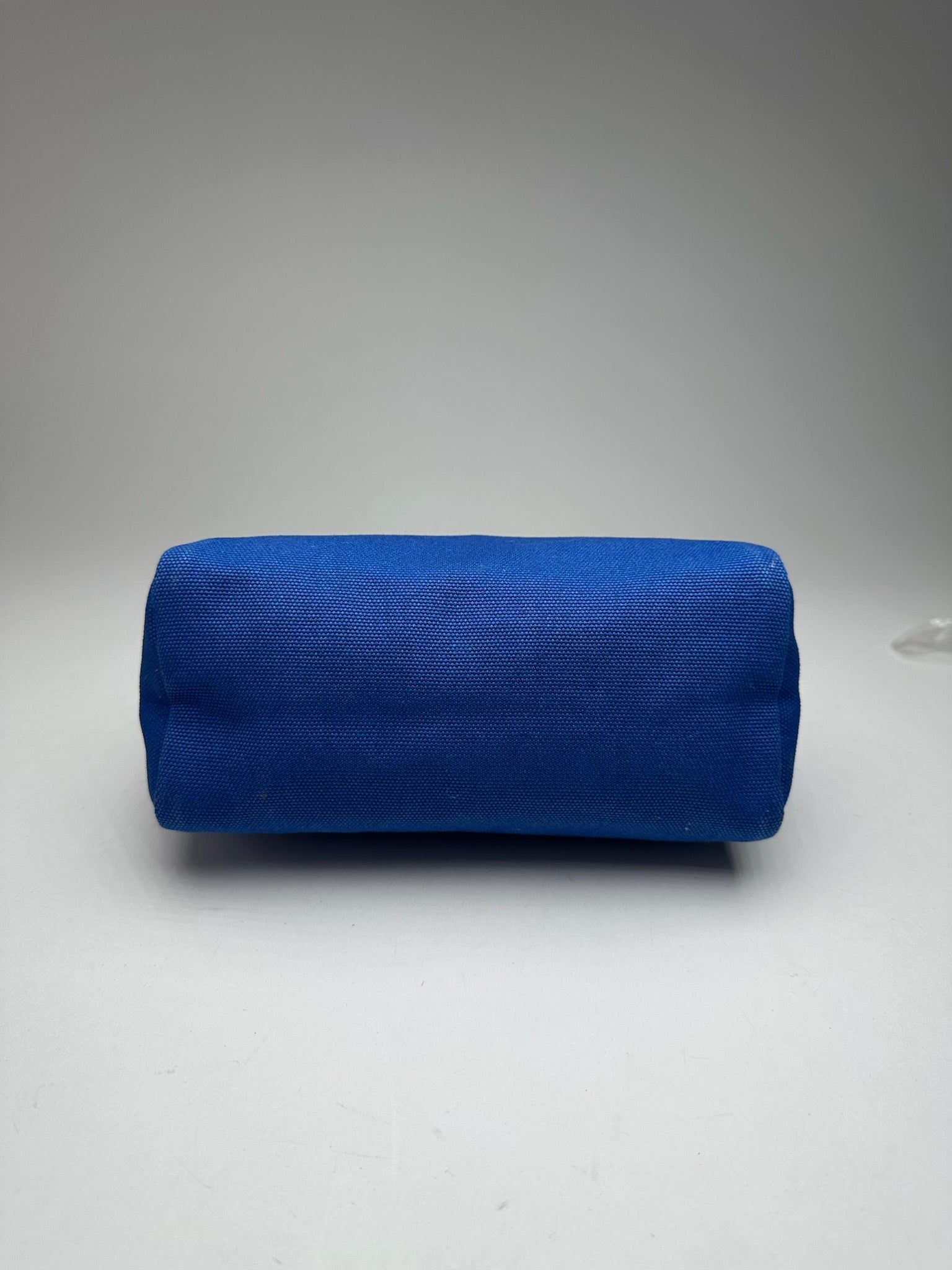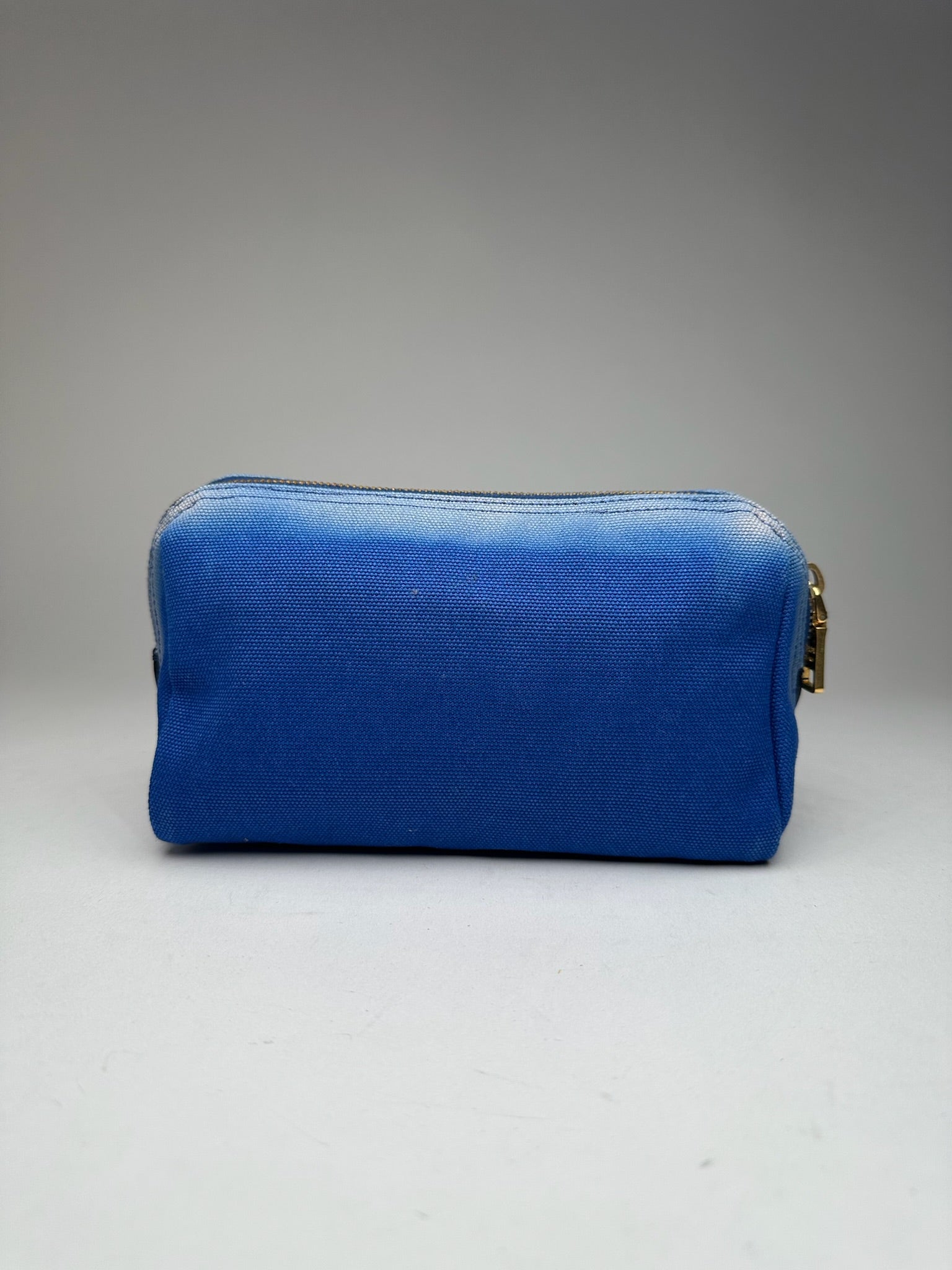 PRADA Vintage Cosmetic Bag. This chic accessory is finely crafted from blue denim and features gold-tone steel hardware. The interior is lined with blue Prada monogram canvas and offers practical storage for daily essentials.