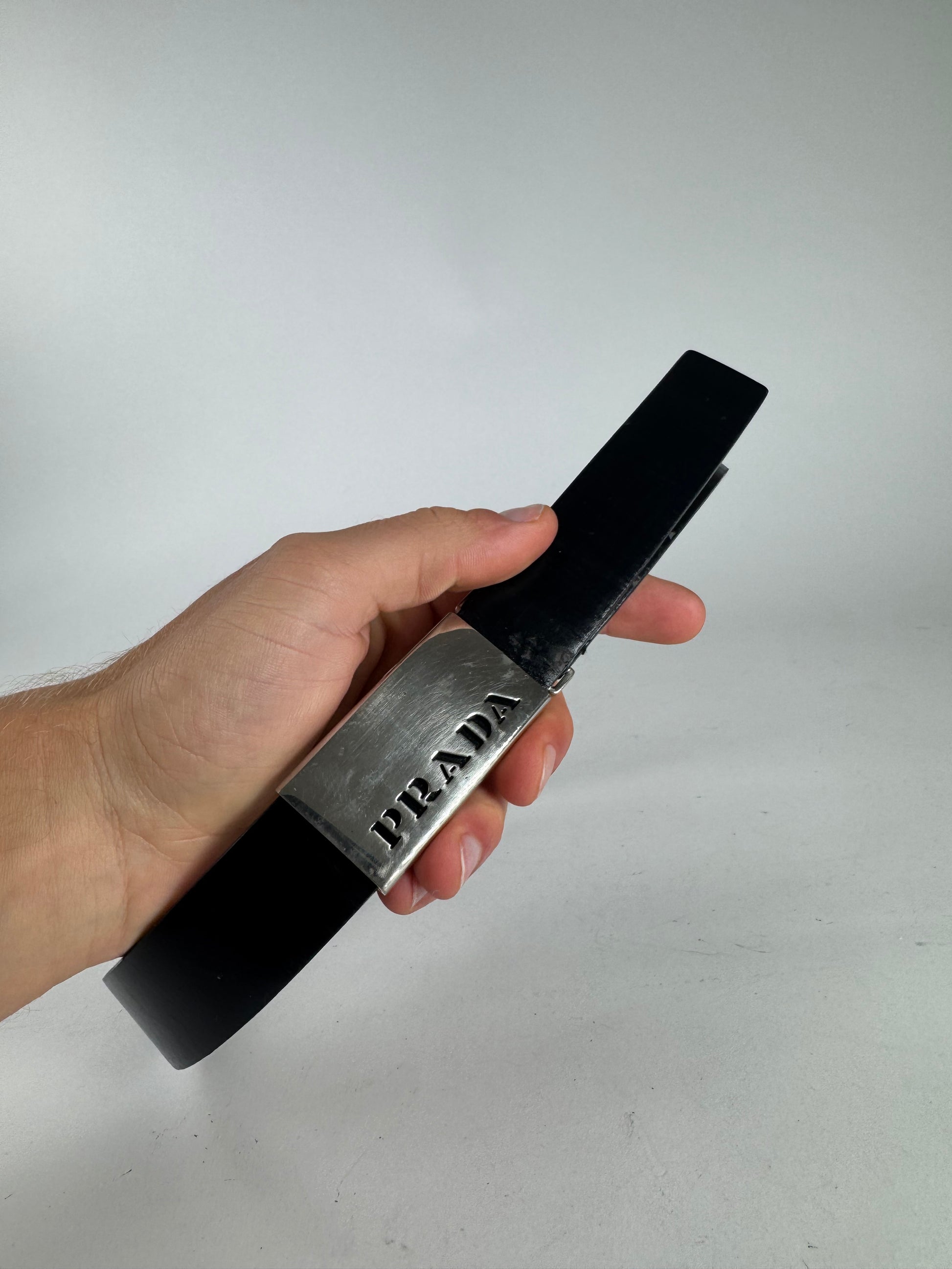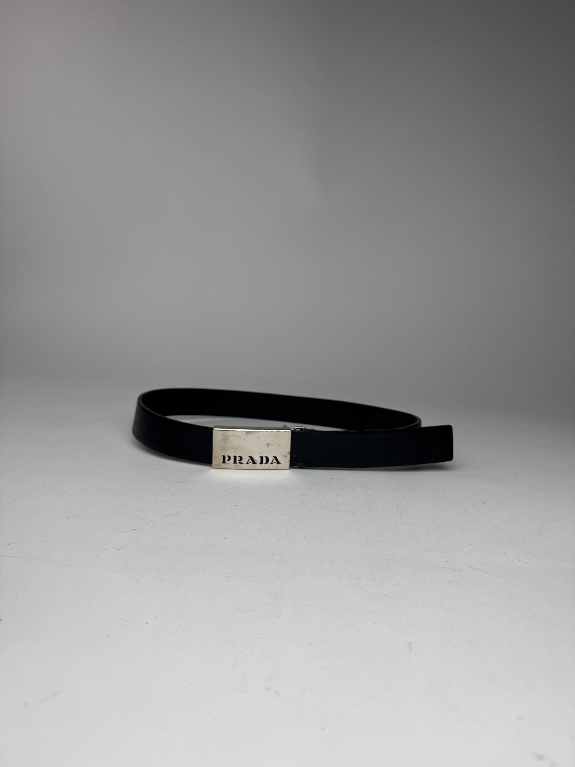 PRADA Vintage Leather Belt. This classic vintage belt is crafted from black leather and features a sleek silver-tone steel buckle, offering a timeless and versatile design.