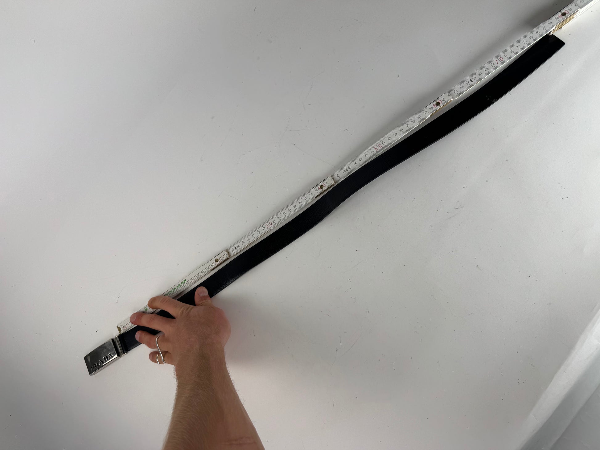 Condition Details: The belt is in excellent shape with visible scratches and scuffs on the buckle. The leather remains smooth and well-preserved.