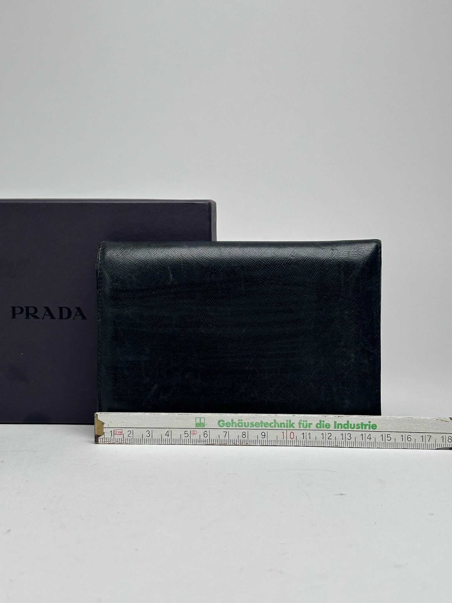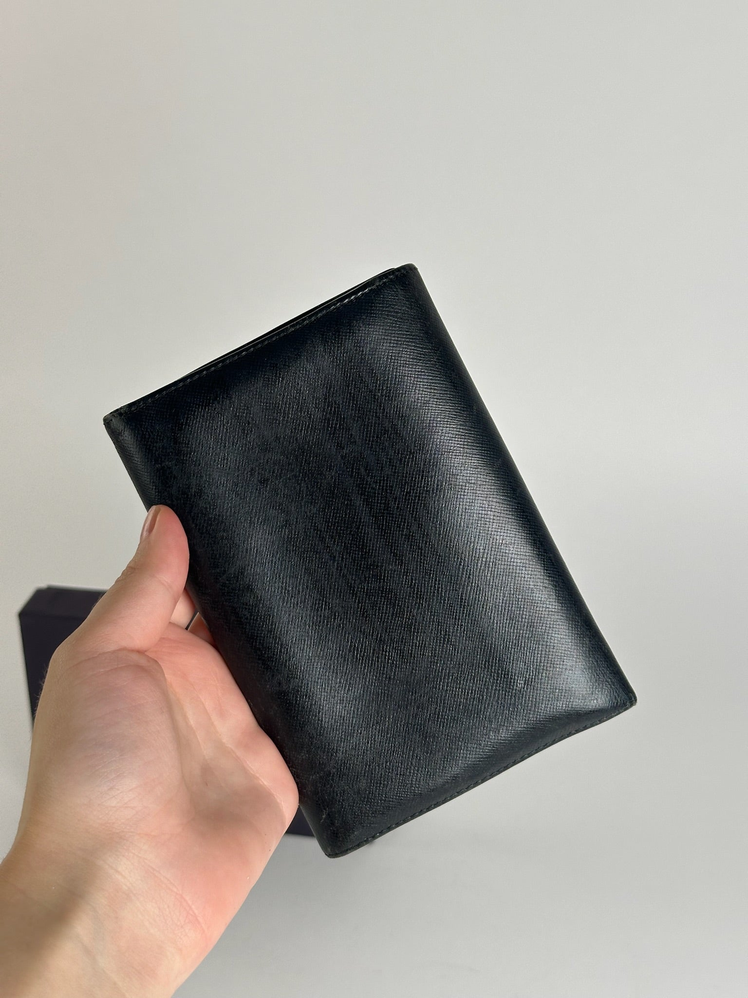 PRADA Vintage Saffiano Leather Wallet. This vintage wallet is finely crafted of black Saffiano leather and features the iconic Prada triangle logo in silver-tone steel on the front. Introduced in 1913, the enamel triangle has become a symbol of the brand's minimalist and industrial aesthetic. The wallet has a snap-button closure and is made in Italy.