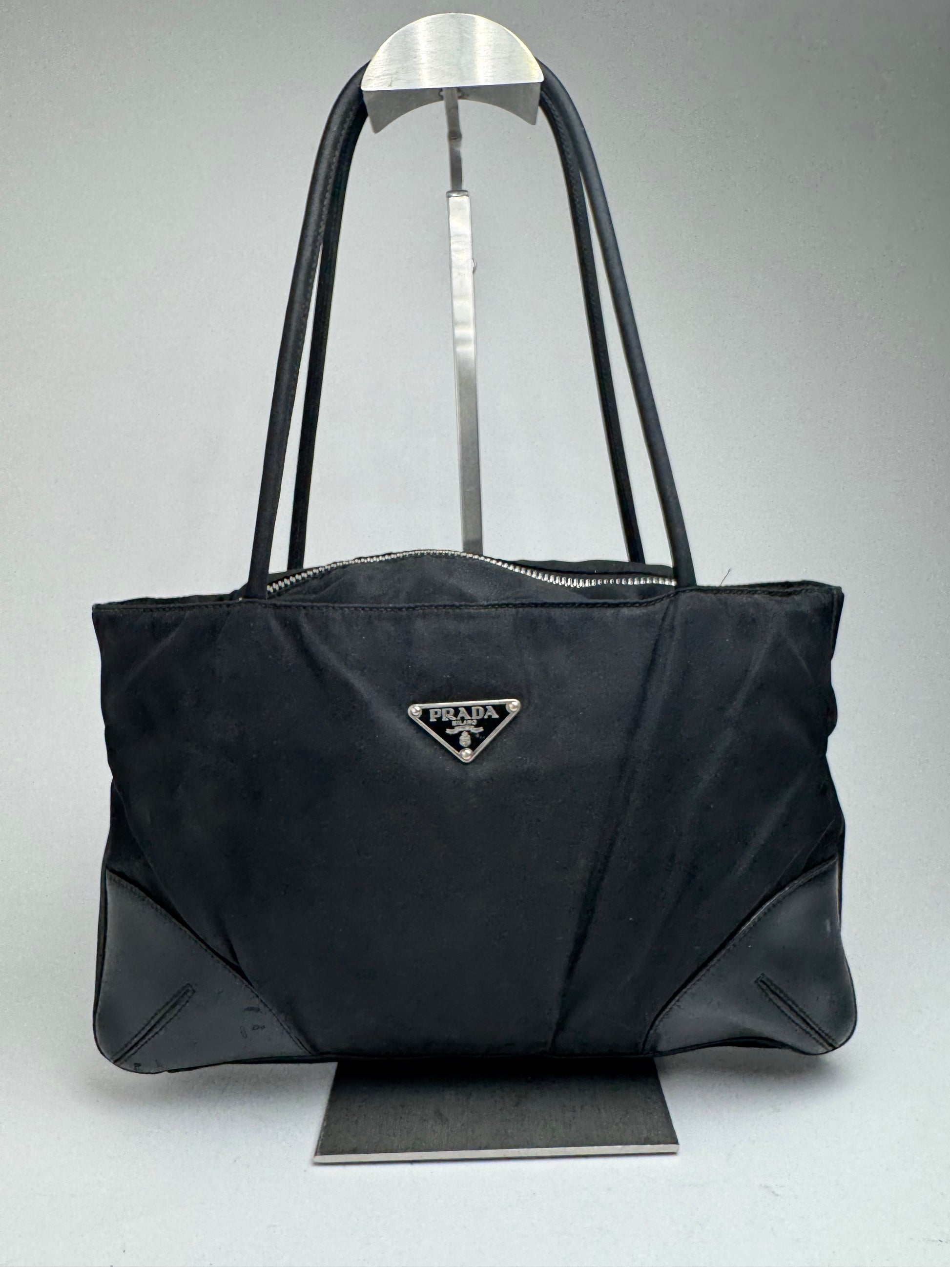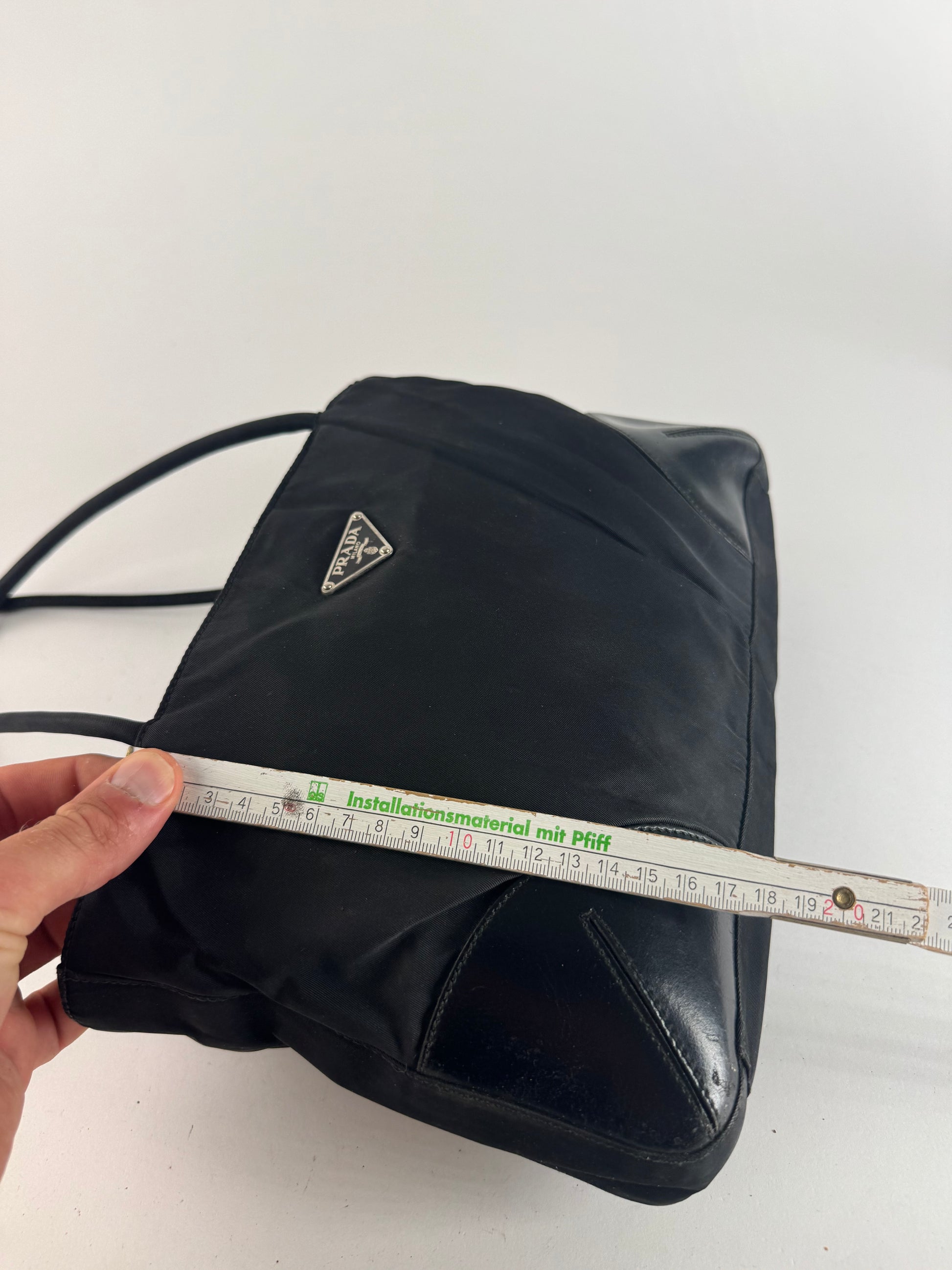 PRADA Vintage Nylon and Leather Handbag. This stylish handbag is crafted of black polyester with black leather detailing and features the iconic Prada triangle logo in silver-tone steel on the front. Introduced in the late 1980s, the inverted triangle logo has become a hallmark of Prada's minimalist yet luxurious aesthetic, symbolizing modern sophistication. The interior is lined in black Prada monogram canvas. Made in Italy.