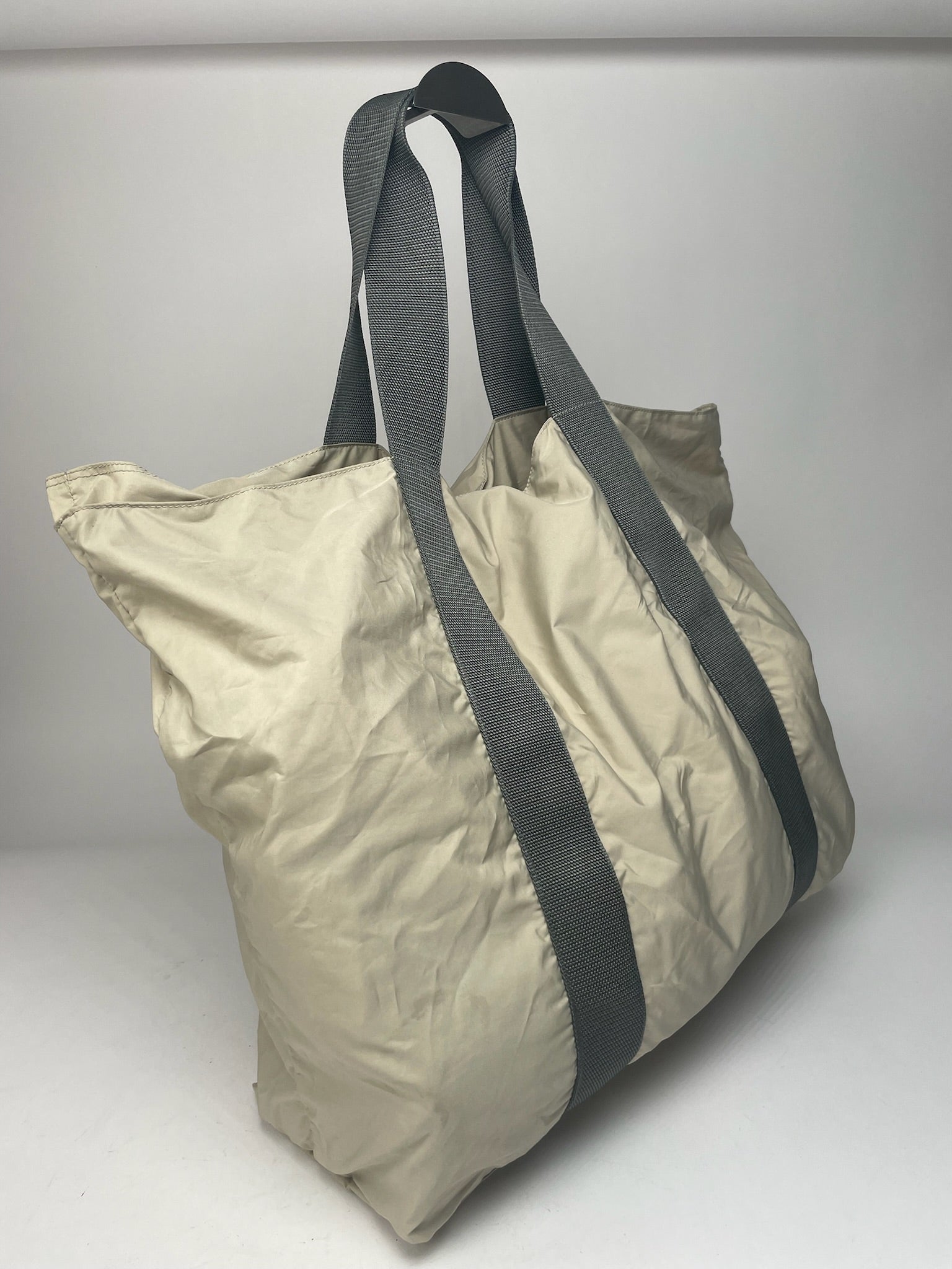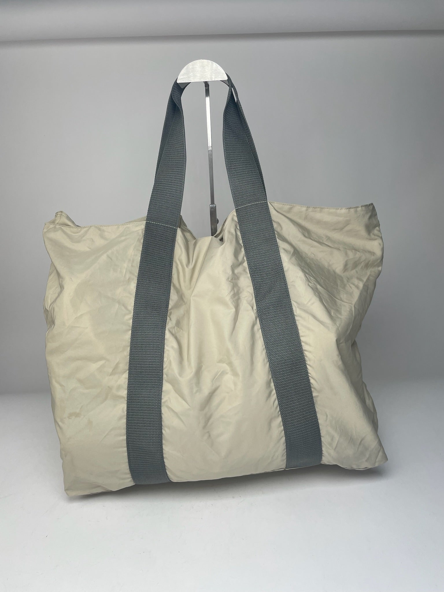This vintage travel bag by Prada Sport is crafted from durable white polyester with gray canvas handles. It is unisex and made in Italy. The bag is in very good condition, with only some damaged material on the inside.