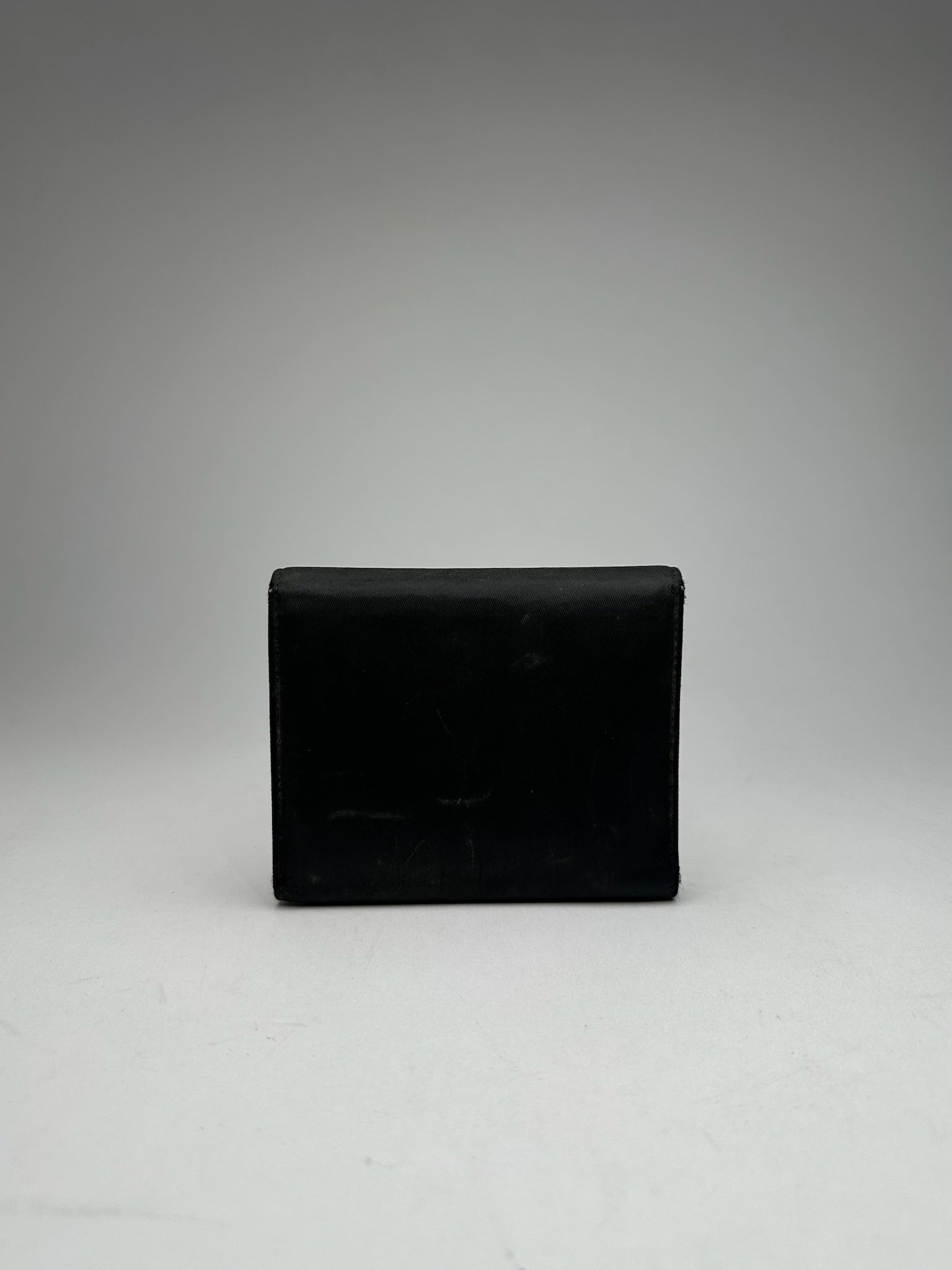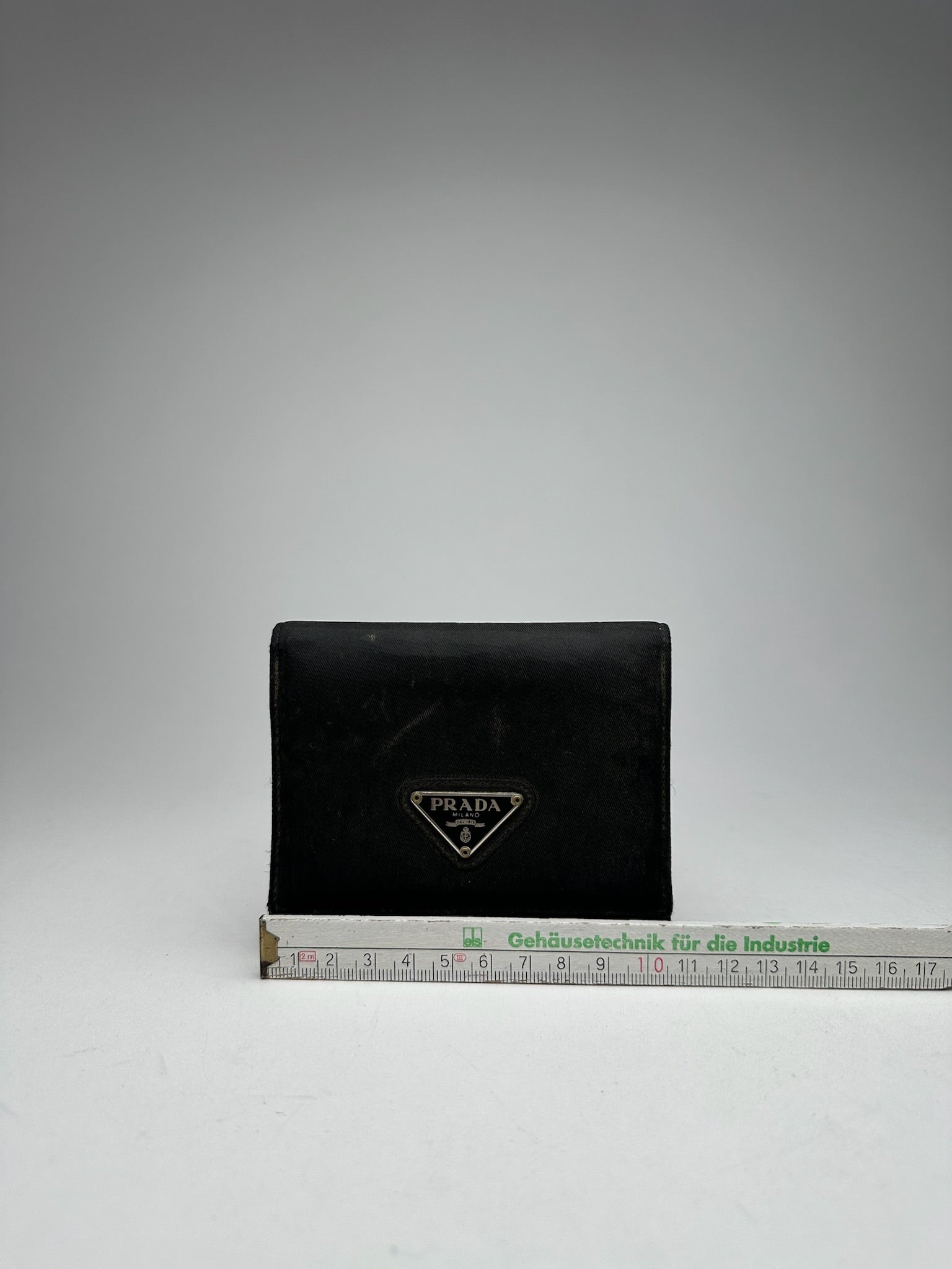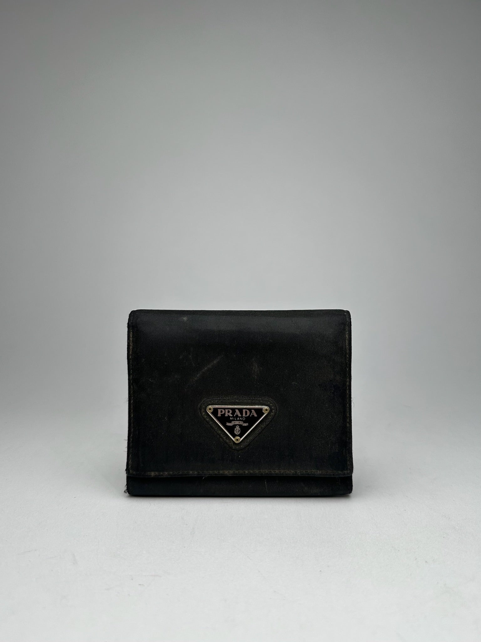 PRADA Vintage Canvas Wallet. This chic wallet is finely crafted of black canvas with the iconic Prada triangle logo on the front. The wallet opens to an interior lined in black Tessuto leather.
