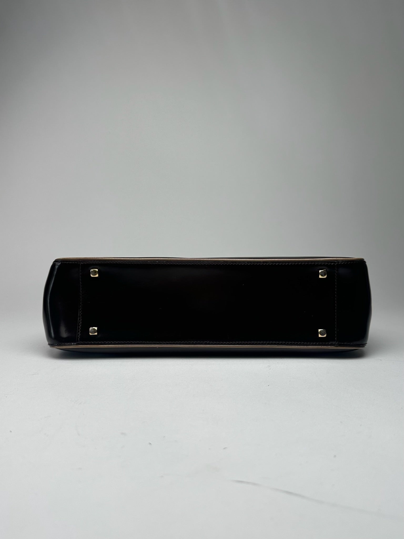 SALVATORE FERRAGAMO vintage handbag. This sophisticated handbag is finely crafted of black and caramel-colored patent leather. The handles are shaped in the iconic Ferragamo logo design, and the bag features gold-tone steel hardware with a magnetic closure. The interior is lined with soft suede. Made in Italy.