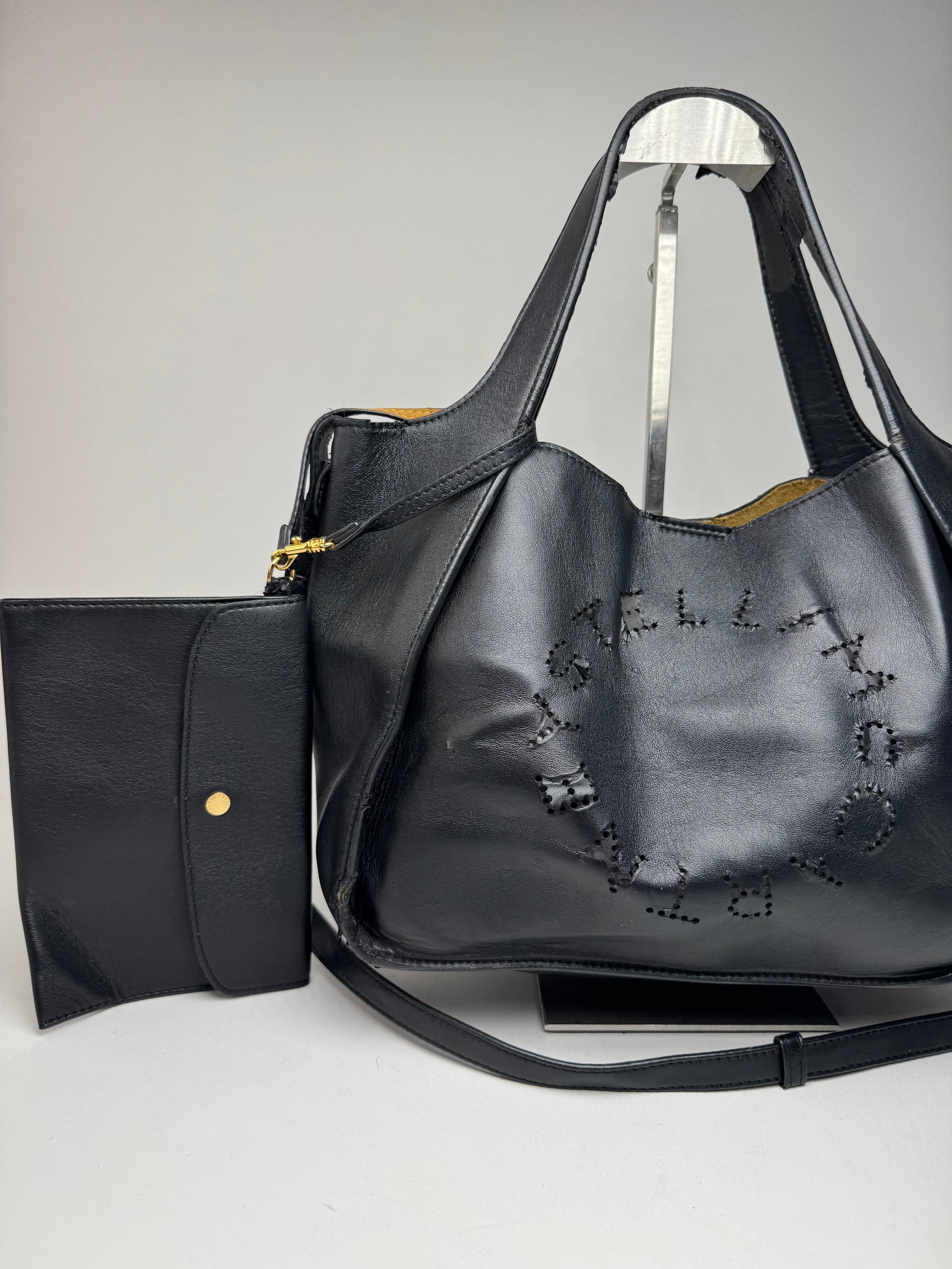 STELLA MCCARTNEY Logo Vintage Shopper Bag. This chic handbag is finely crafted from black vegan leather. The shoulder bag features two top handles, a breathable shoulder strap, and a detachable clutch attached with a strap. The bag is lined with camel-colored vegan suede.