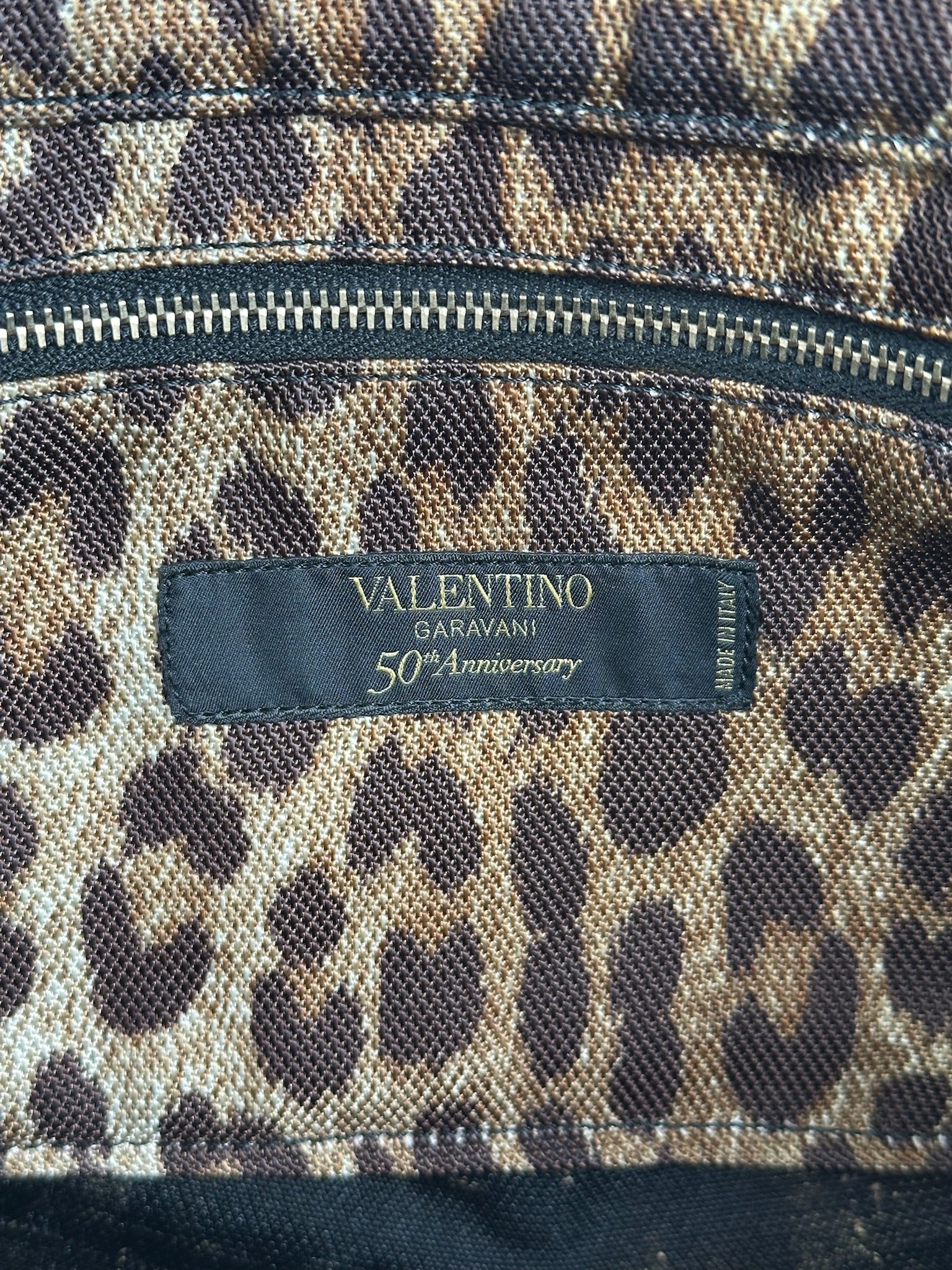 This chic shopper bag is crafted from brown-toned leopard print canvas and features short black canvas handles. Released as a special edition for Valentino's 50th anniversary, this piece combines bold design with collectible appeal. The interior is lined in black fabric.