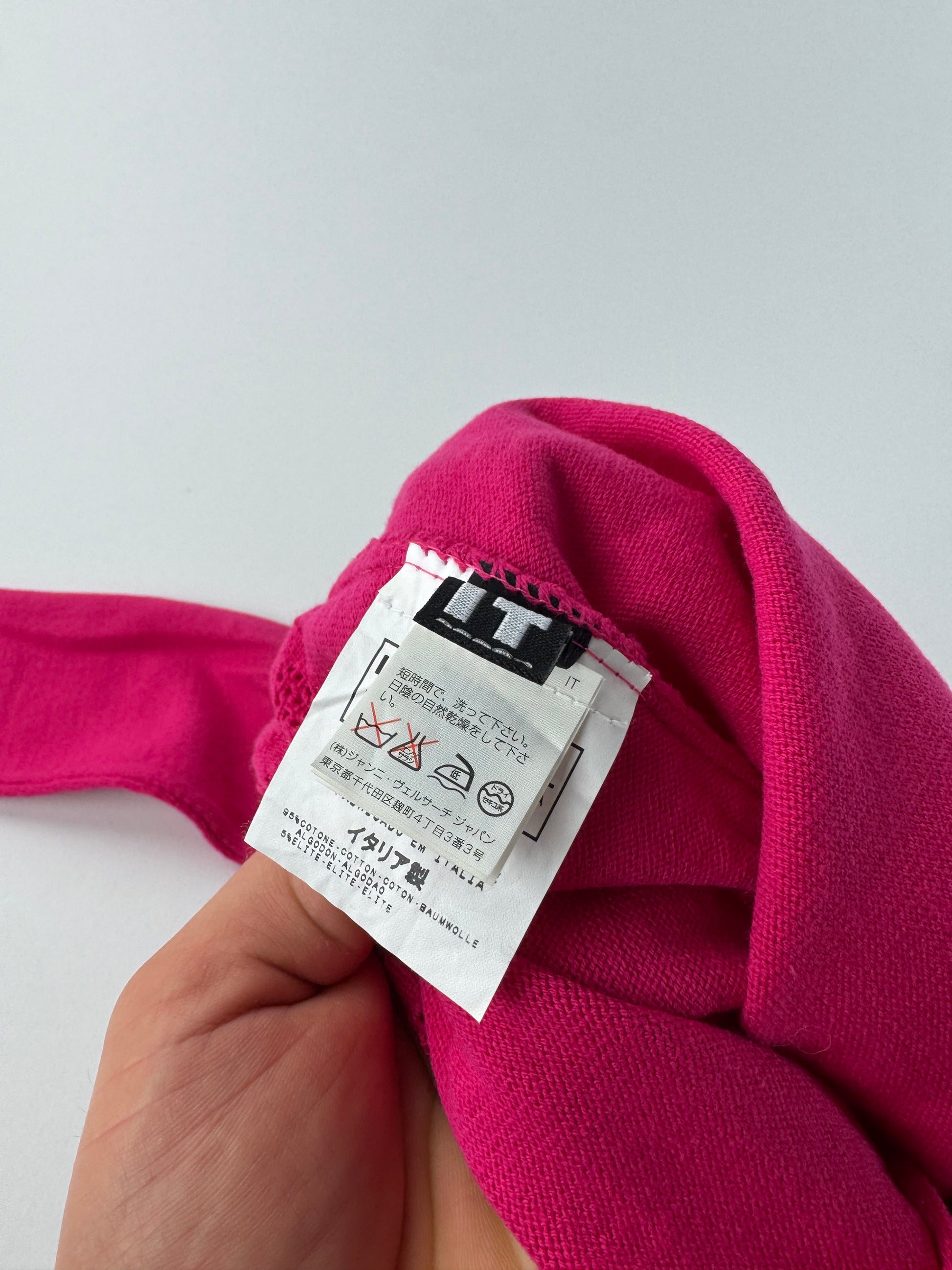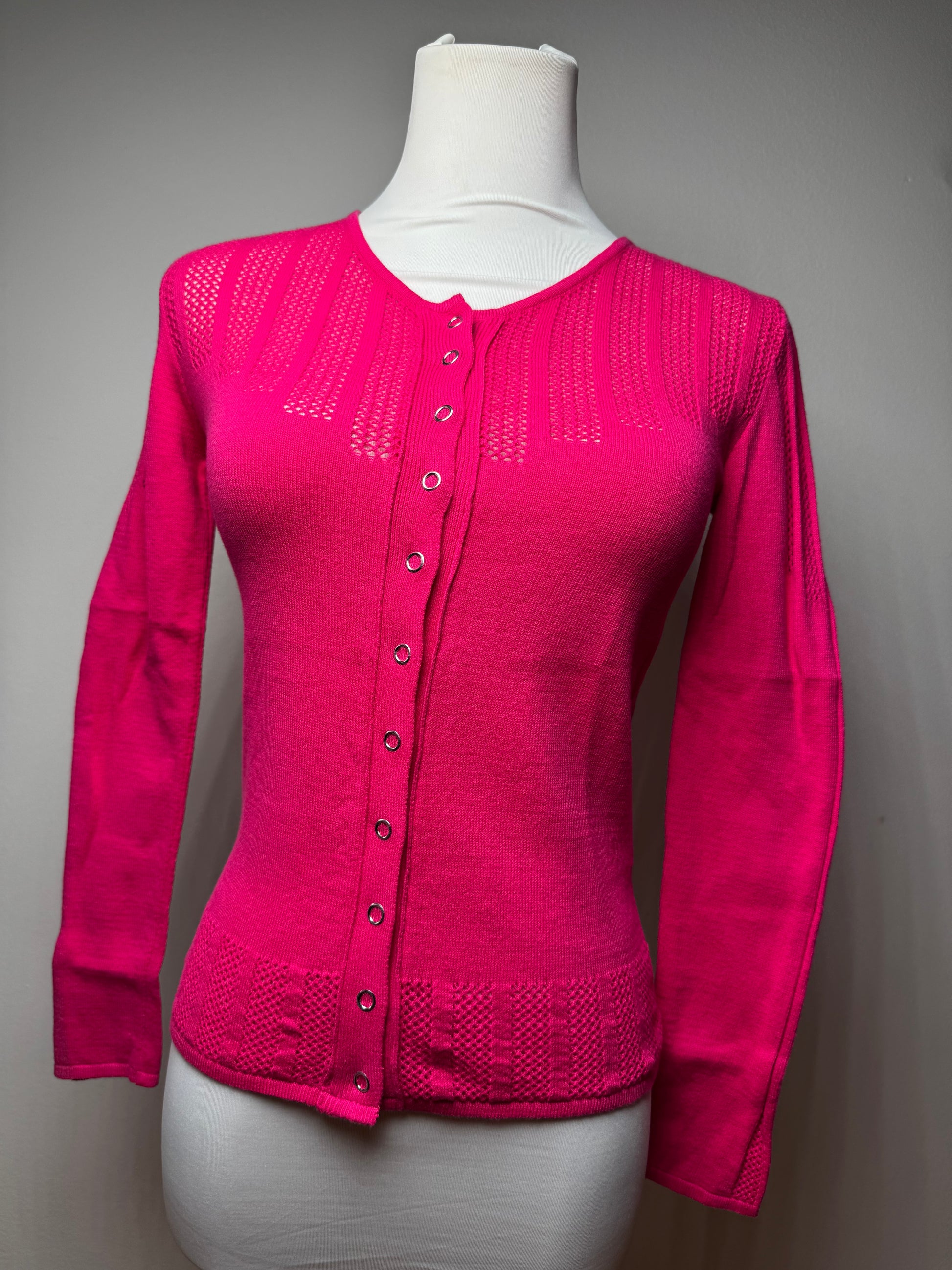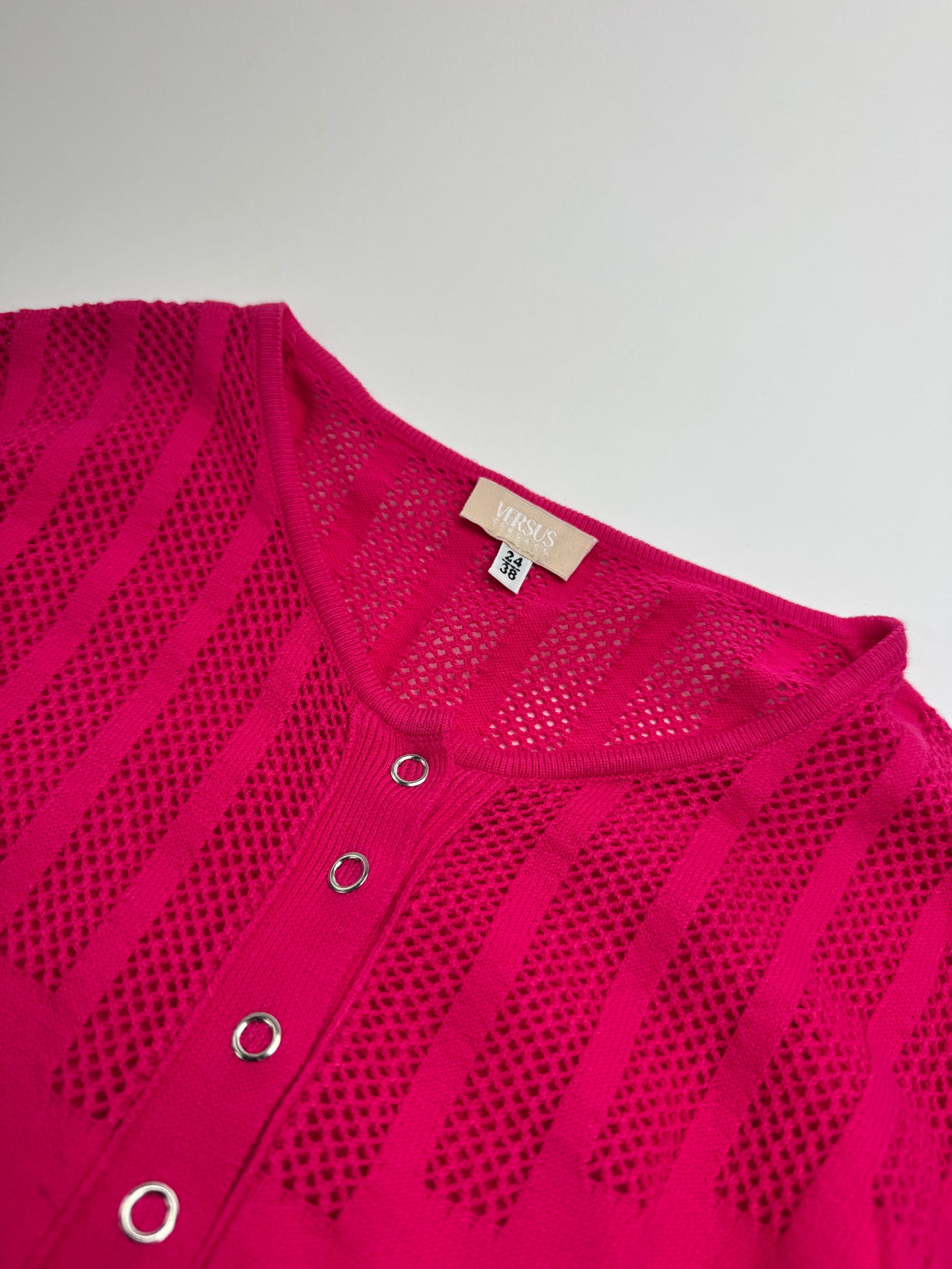 VERSACE Vintage Cardigan. This elegant vintage cardigan is crafted from a cotton and polyester blend in a vibrant pink colourway. Designed with a classic crew neckline and finished with silver-tone steel buttons, it reflects Versace’s refined yet distinctive Italian aesthetic. The mannequin shown in the photos is wearing size 38 / M.