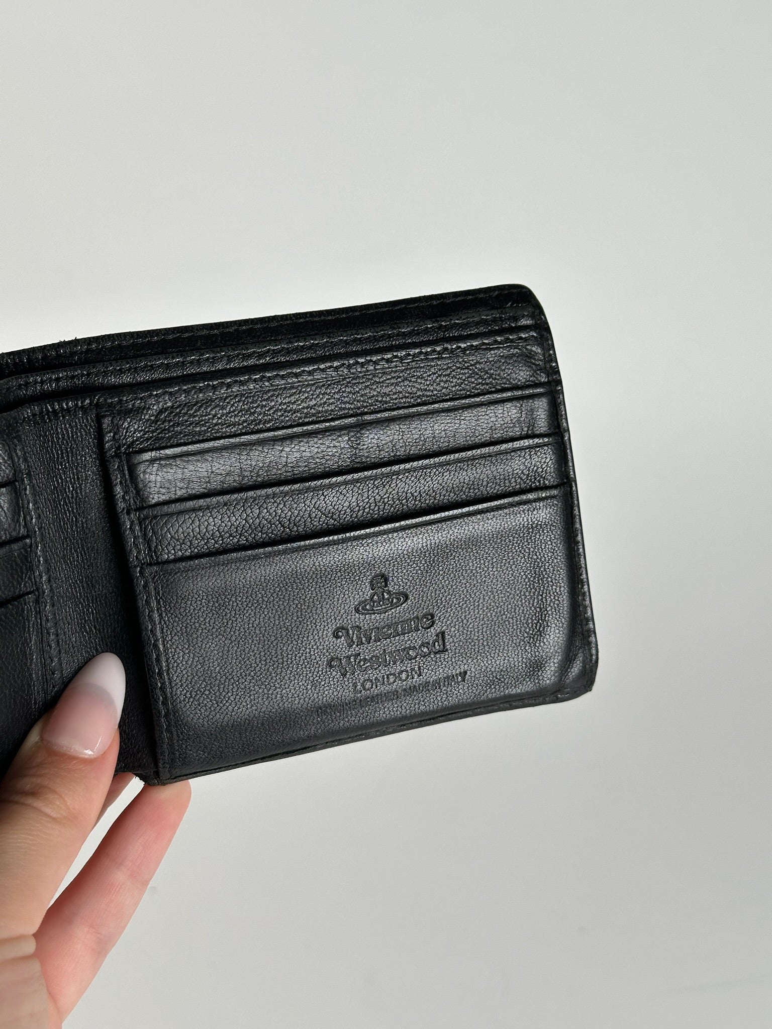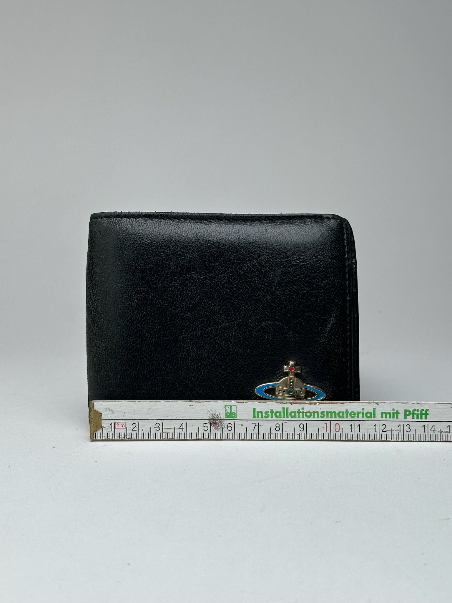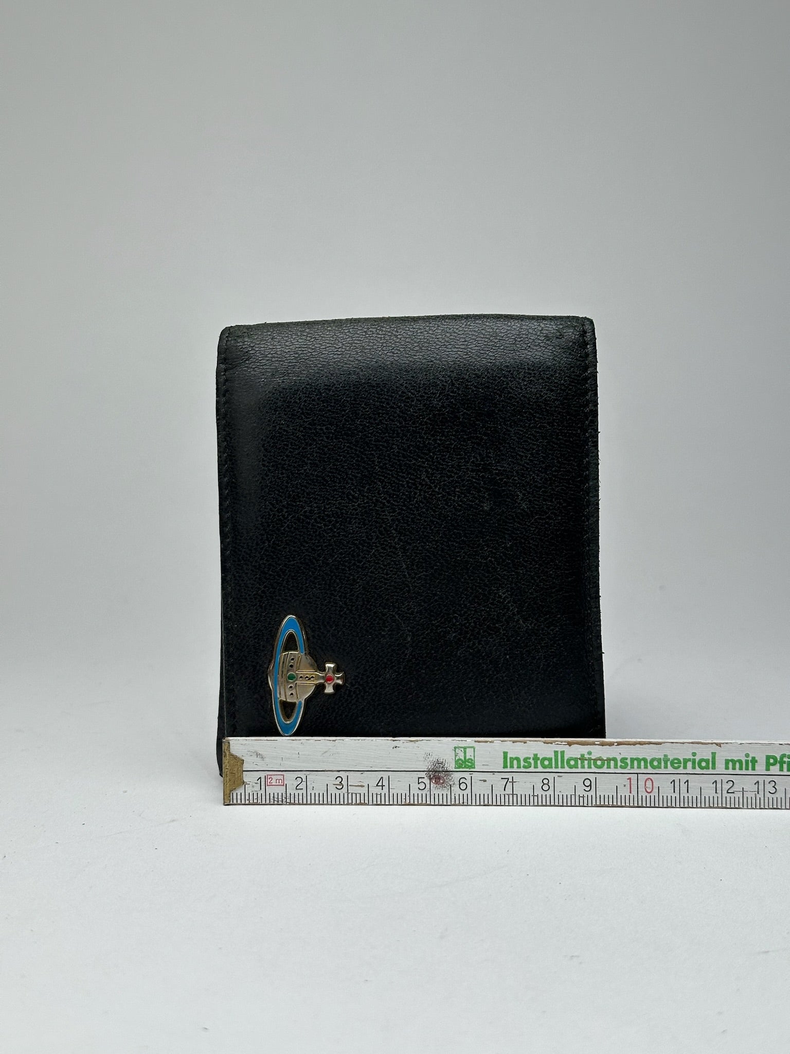 VIVIENNE WESTWOOD Vintage Black Leather Wallet. This unisex vintage wallet is crafted from black leather and features the iconic Saturn Orb logo on the front in silver-tone steel, hand-painted in blue, red, and green. Made in Italy, this compact accessory blends bold design with everyday practicality. Introduced in the late 1980s, the Saturn Orb logo fuses royal British symbolism with a futuristic twist, embodying Vivienne Westwood's philosophy of rebellion, heritage, and innovation.